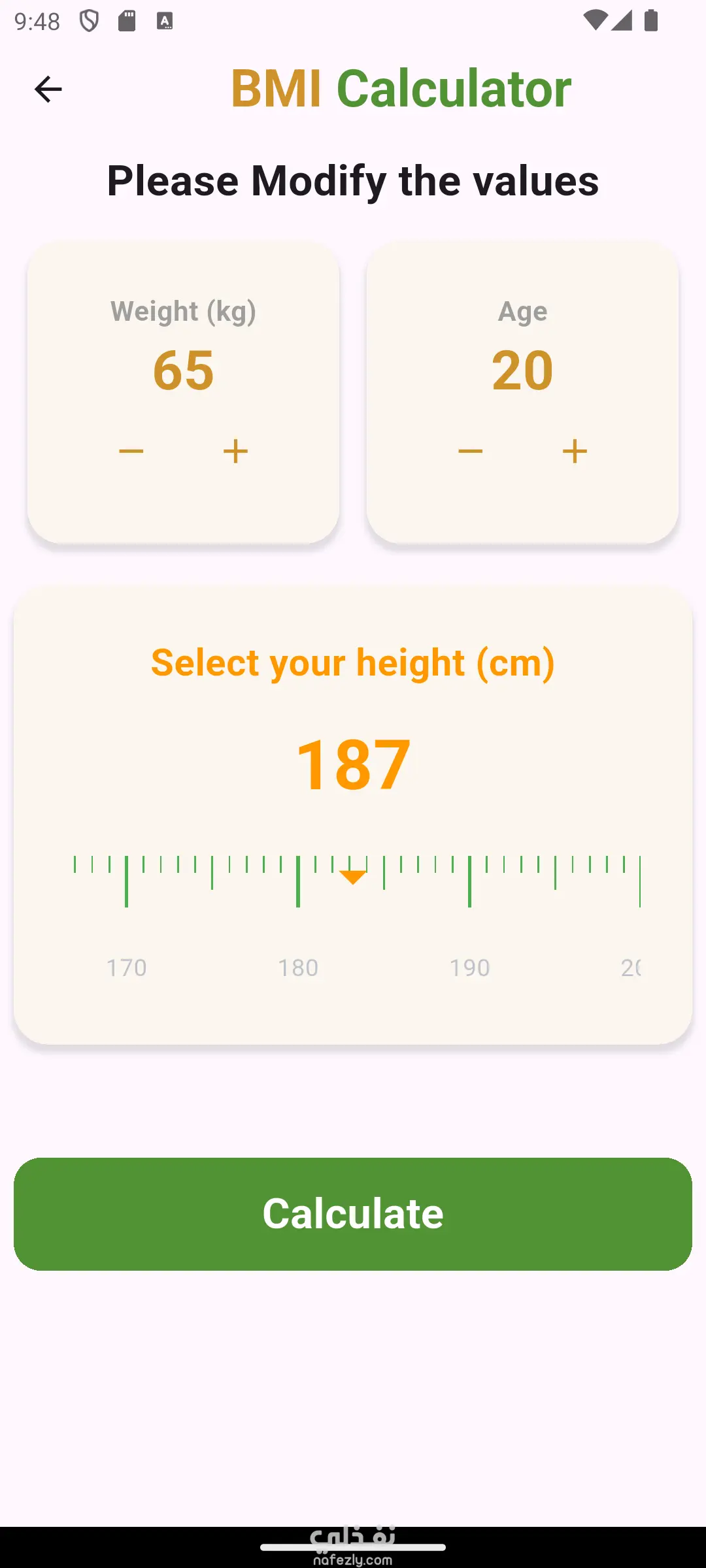 يتيح التطبيق للمستخدم إدخال بياناته (الوزن، الطول، العمر، الجنس) من خلال واجهة تفاعلية مصممة باستخدام Flutter وواجهة المستخدم Material Design.