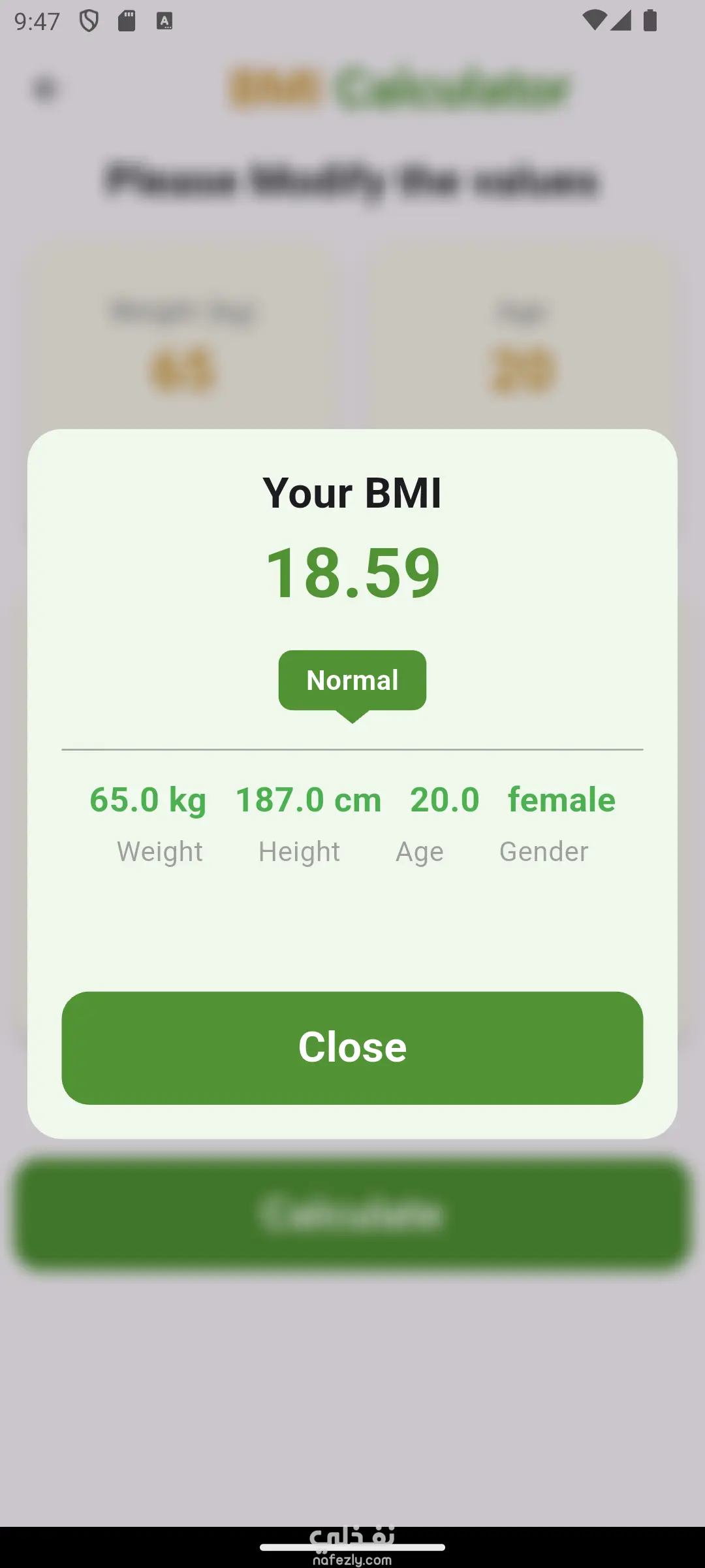بمجرد الضغط على زر "احسب"، يقوم التطبيق بحساب مؤشر كتلة الجسم ويعرض النتيجة داخل نافذة منبثقة (Dialog) أنيقة تغطي الخلفية بتأثير ضبابي (blur)، مع عرض الحالة (مثل Normal، Overweight، Underweight) بشكل مميز داخل بطاقة تحتوي على سهم صغير كما في فقاعات الدردشة.