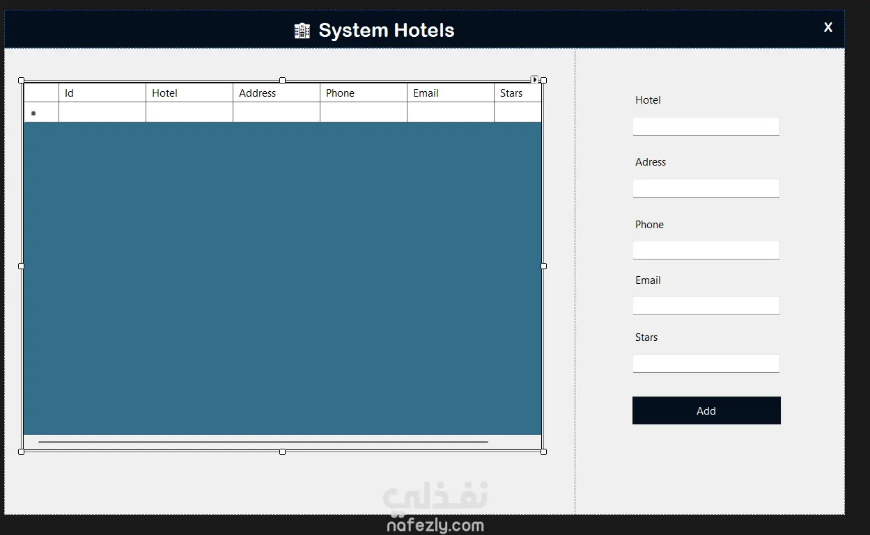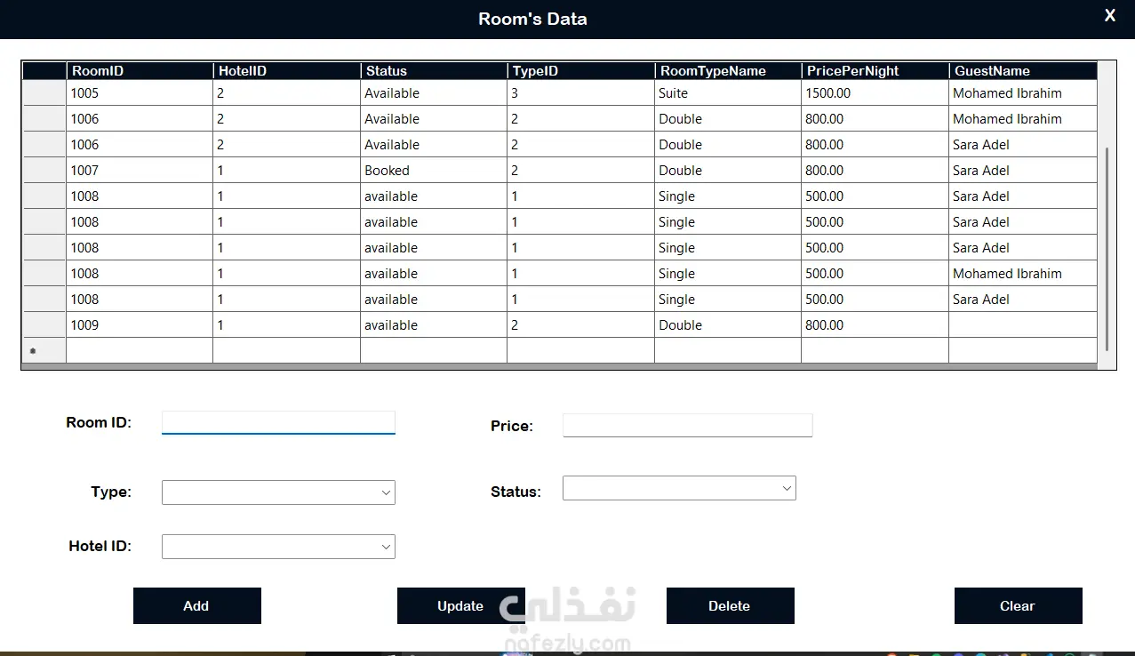 نظام إدارة فندق متكامل يهدف إلى تسهيل عمليات الحجز وإدارة الغرف والموظفين والنزلاء. يوفر النظام واجهة سهلة الاستخدام تتيح للمسؤولين إدارة الفندق بكفاءة عالية. المميزات: تسجيل الدخول الآمن للمستخدمين (Login System). إمكانية إضافة المستخدمين بمستويات صلاحيات مختلفة (Add User). إدارة بيانات النزلاء (Add Guest) والموظفين (Add Staff). نظام حجز الغرف (Booking) يتيح تتبع حالة كل غرفة (محجوزة / متاحة). واجهة مرتبة ومنظمة تسهّل التنقل بين الأقسام المختلفة. الأدوات والتقنيات المستخدمة: Backend: ADO.NET Database: SQL Server Frontend: Windows Forms (C#) النتيجة: النظام يُسهم في أتمتة العمليات اليومية للفندق وتقليل الأخطاء اليدوية، مما يحسن من كفاءة الإدارة وتجربة المستخدم.