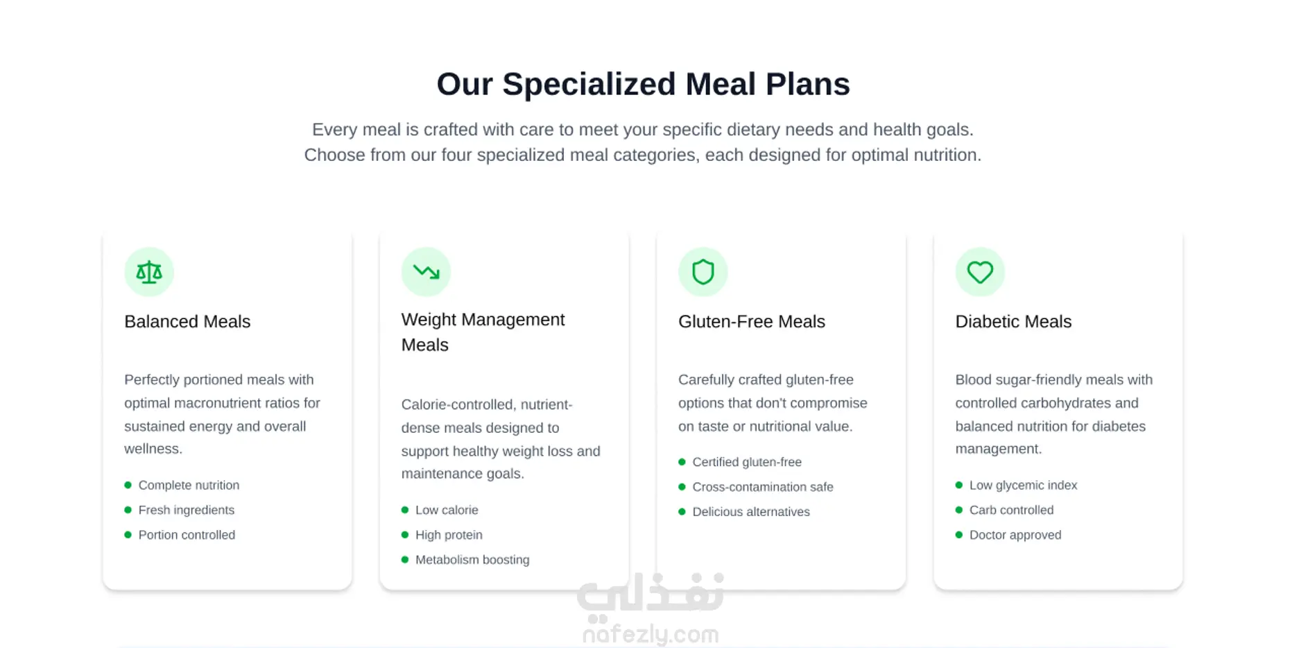 من خلال تحليل بياناتك مثل الوزن الحالي، الوزن المستهدف، مستوى النشاط اليومي، وتفضيلاتك الغذائية، يقدّم لك الموقع خطة وجبات متكاملة تشمل الإفطار، الغداء، العشاء، السناكات والعصائر — مصممة خصيصًا لتناسب احتياجاتك.
