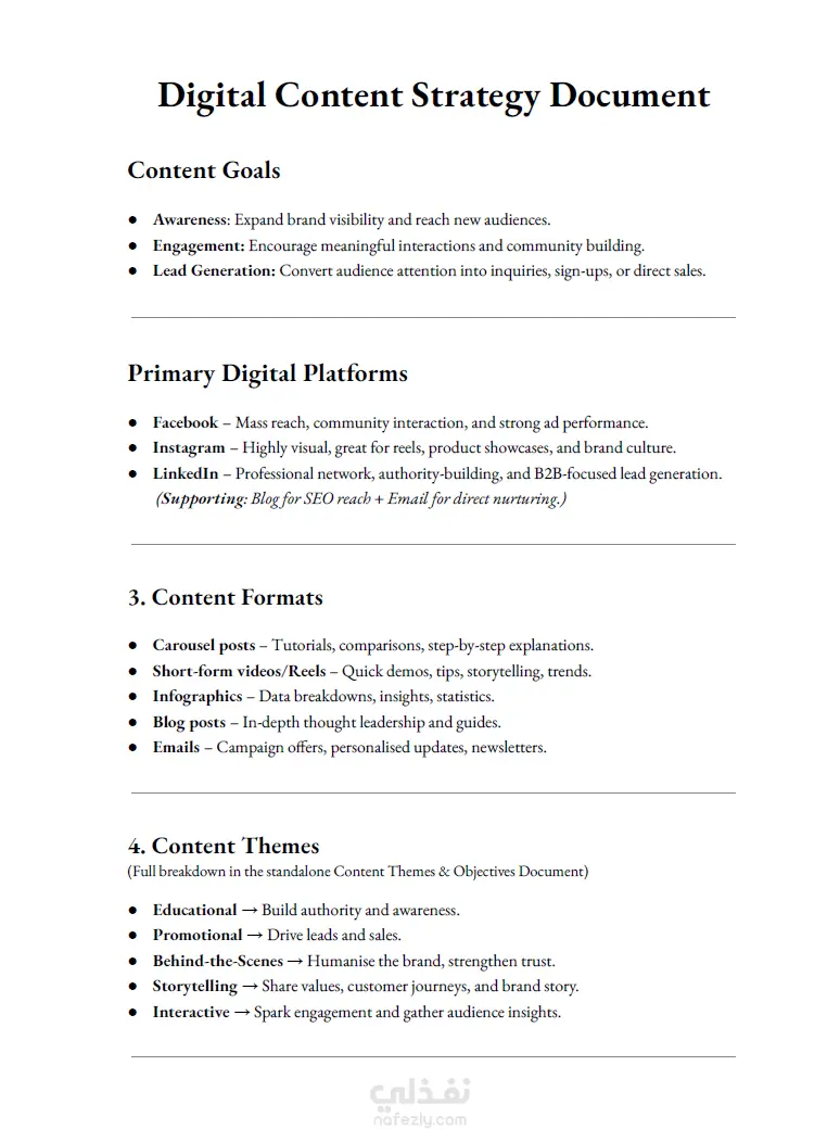 المرحلة الثالثة وهي إعداد إستراتيجية مناسبة للمحتوى الرقمي بناءً على ما تم التوصل إليه في المرحلتين السابقتين. تشمل هذه المرحلة وضع أهداف محددة للمحتوى وتحديد المنصات الرقمية الأنسب وأسلوب التواصل الخاص بكل منصة. بالإضافة إلى إعداد دليل نبرة وصوت العلامة لضمان الاتساق في الرسائل التسويقية. تم تصميم خطة توزيع وجدولة للنشر تشمل أنواع المحتوى ونسبها الشهرية.