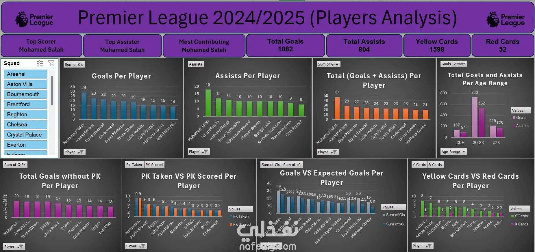 صممت لوحة معلومات تفاعلية لتحليل بيانات اللاعبين باستخدام Excel. الداشبورد يعرض KPIs مثل عدد المباريات، متوسط الأهداف، ومعدل المشاركة، بالإضافة إلى رسوم بيانية تفاعلية لتوضيح أداء اللاعبين عبر المواسم والفِرَق المختلفة. تم استخدام Power Query وPivotTables لتجهيز البيانات، مع تصميم بصري بسيط ومرتب يسهل على المستخدم استكشاف المعلومات بسرعة. هذا المشروع يبرز مهاراتي في تحليل البيانات الرياضية وتقديم نتائج واضحة عبر تمثيل بصري جذاب.