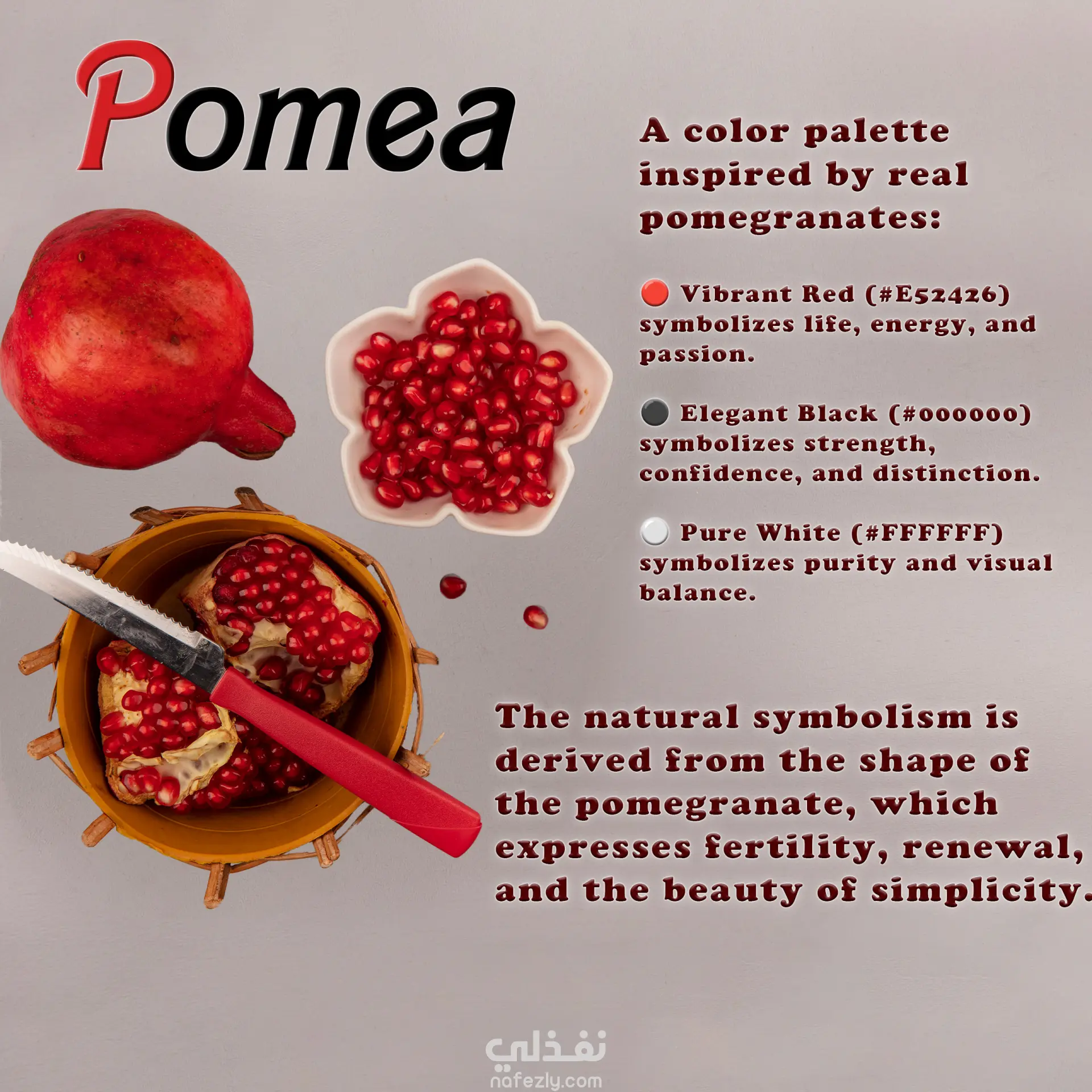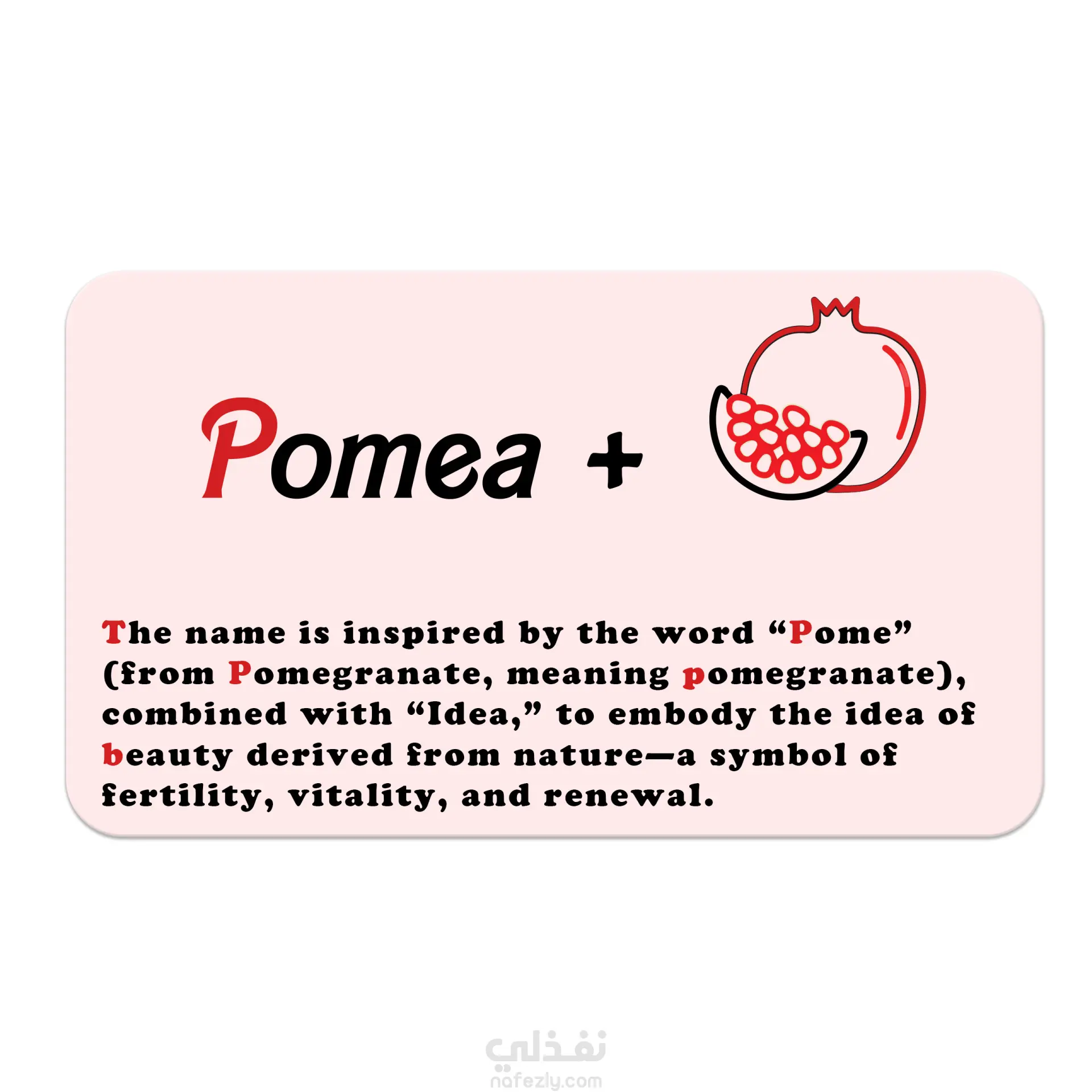 الاسم Pomea هو مزيج إبداعي بين كلمتي “Pome” المأخوذة من Pomegranate (الرمان) و**“Idea”** بمعنى فكرة. يعكس الاسم فكرة مستوحاة من الطبيعة، حيث يجمع بين رمزية الرمان كرمز للحيوية والتجدد، والإبداع الإنساني الذي يحوّل البساطة إلى جمال. يمتاز الاسم بسهولة النطق وجمال الإيقاع، مما يمنحه طابعًا راقيًا وعالميًا يصلح كعلامة تجارية مميزة في مجالات الجمال، والعناية، والمنتجات الطبيعية. 🌿 Pomea — تجسيد لفكرة الجمال النابع من الطبيعة.