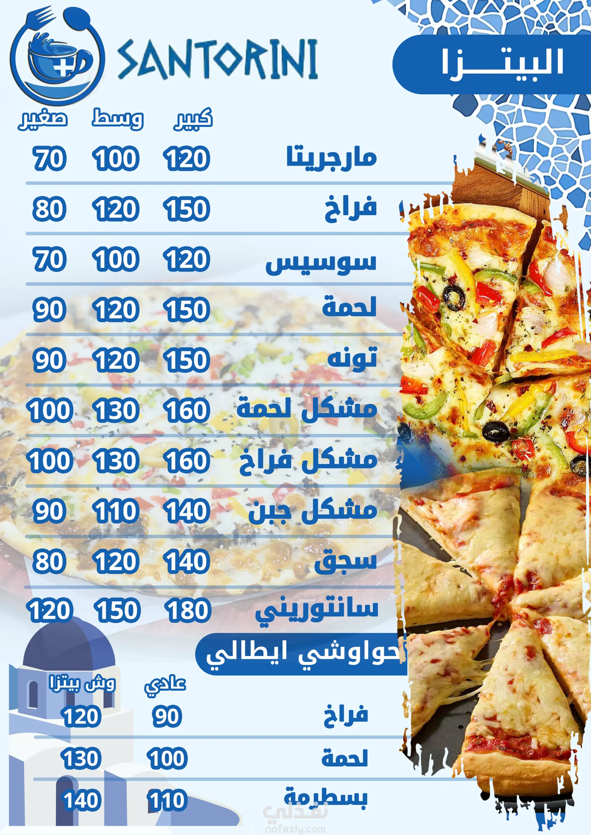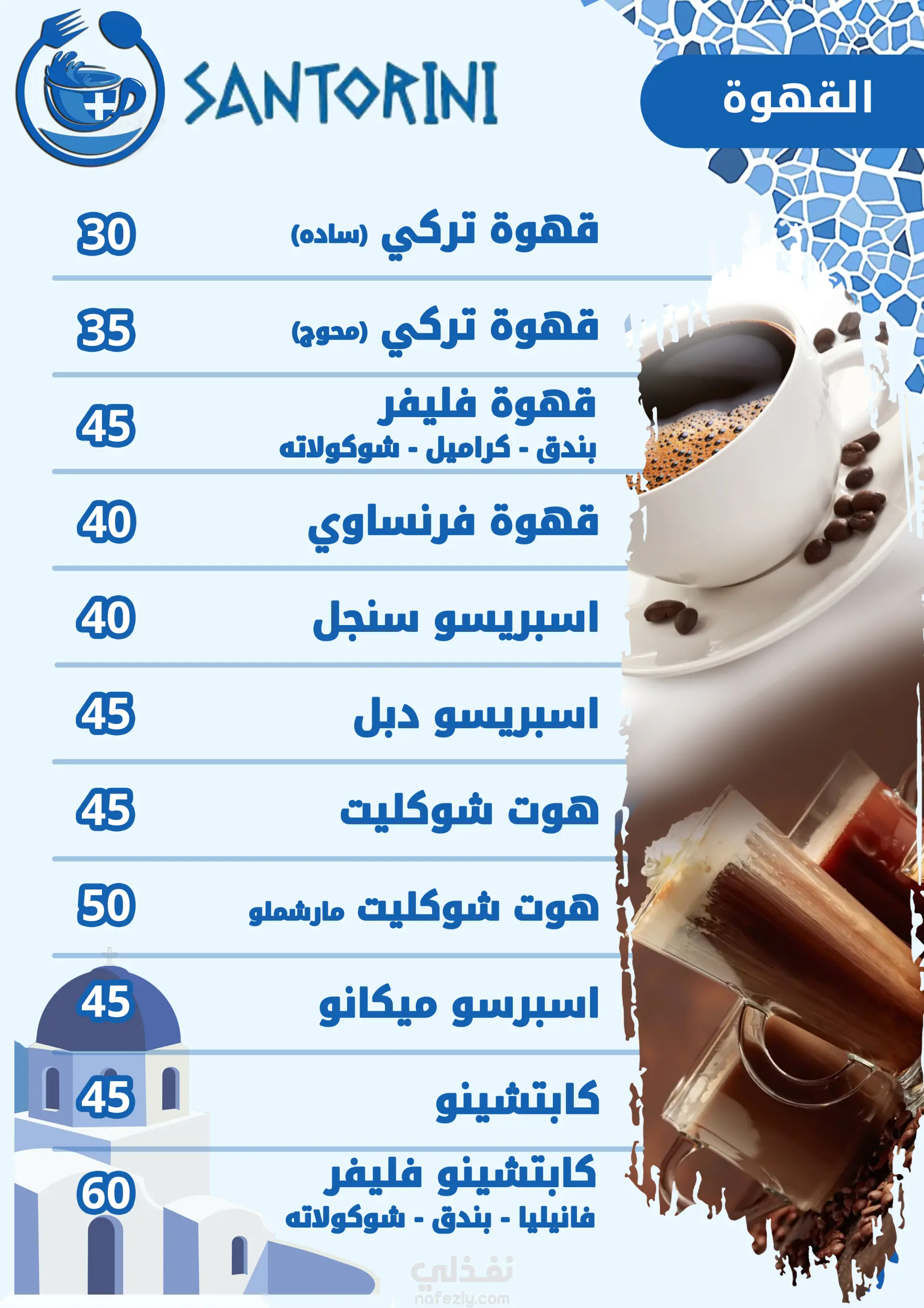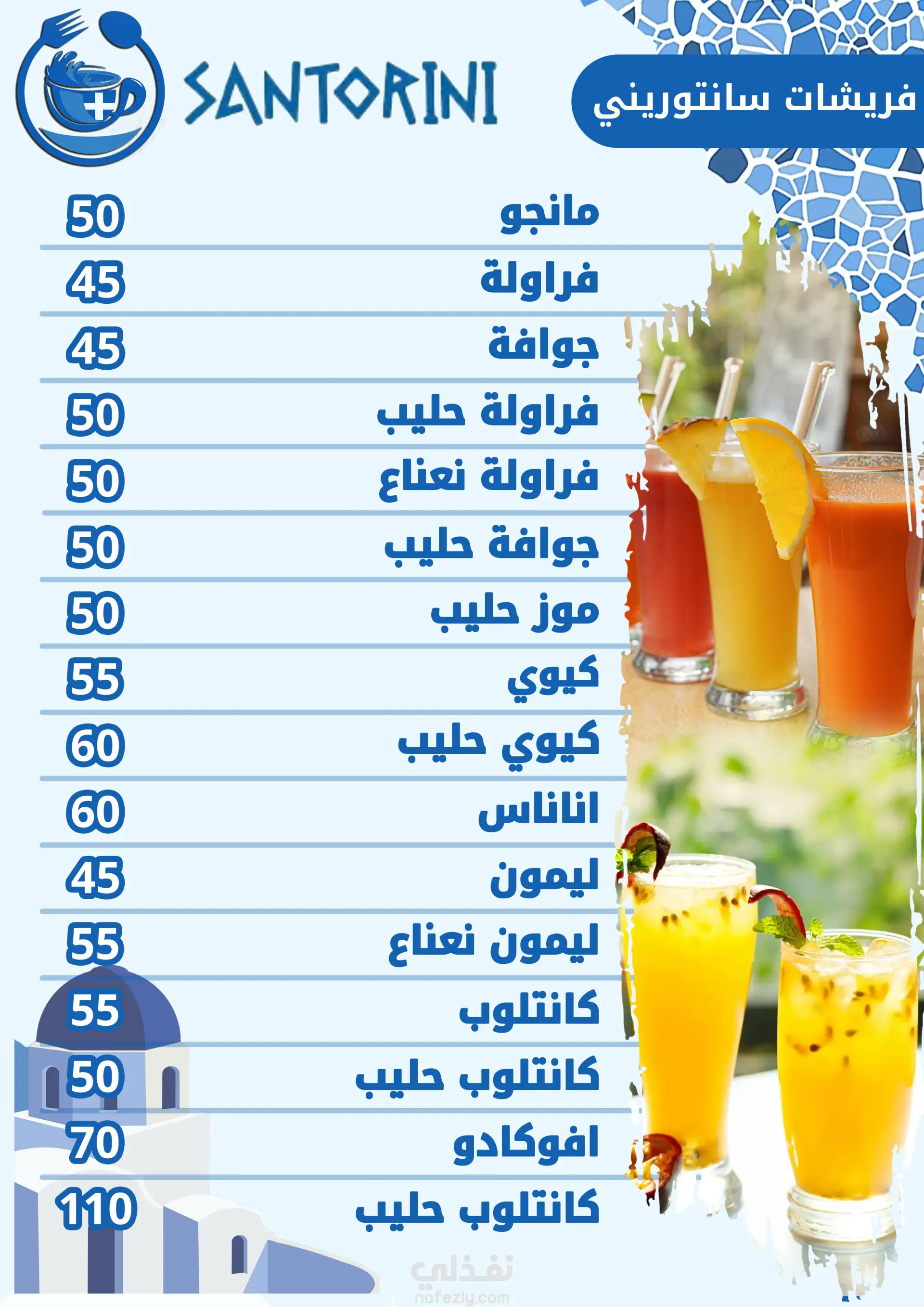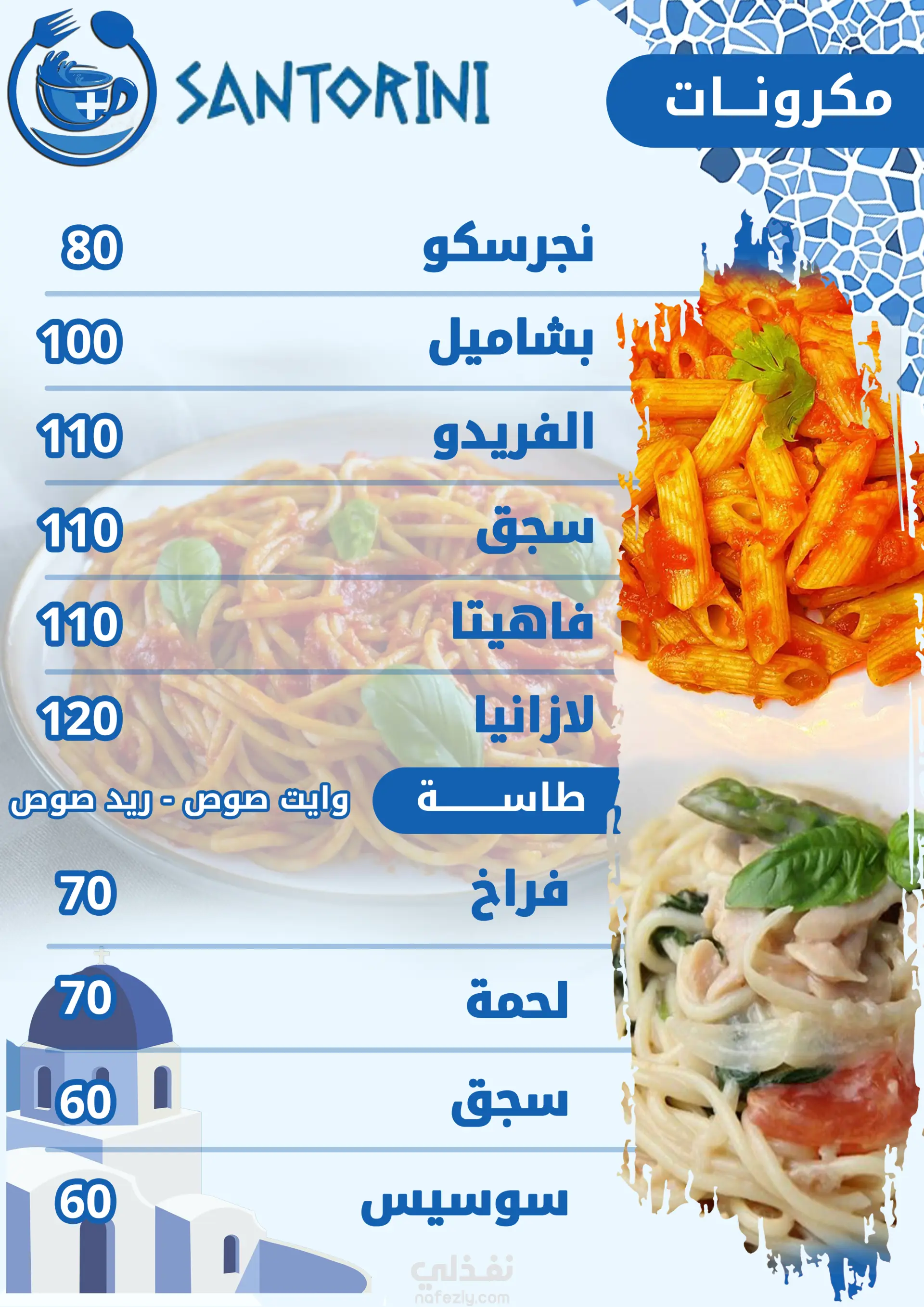 تصميم عصري متناسق لقائمة مطعم مصري باسم "سانتوريني" مصمم عالطراز اليوناني بالأخص جزيرة سانتوريني اليونانية