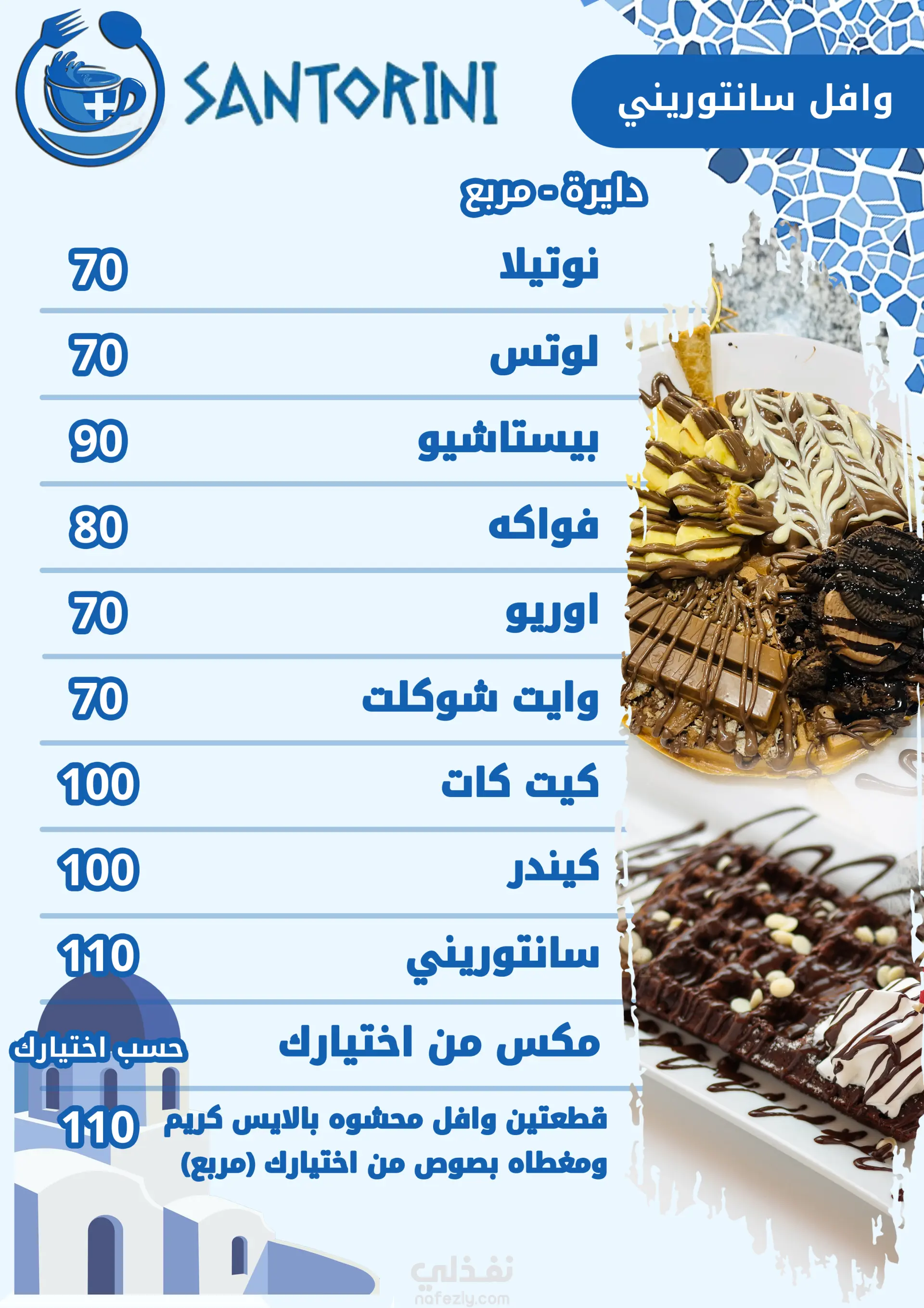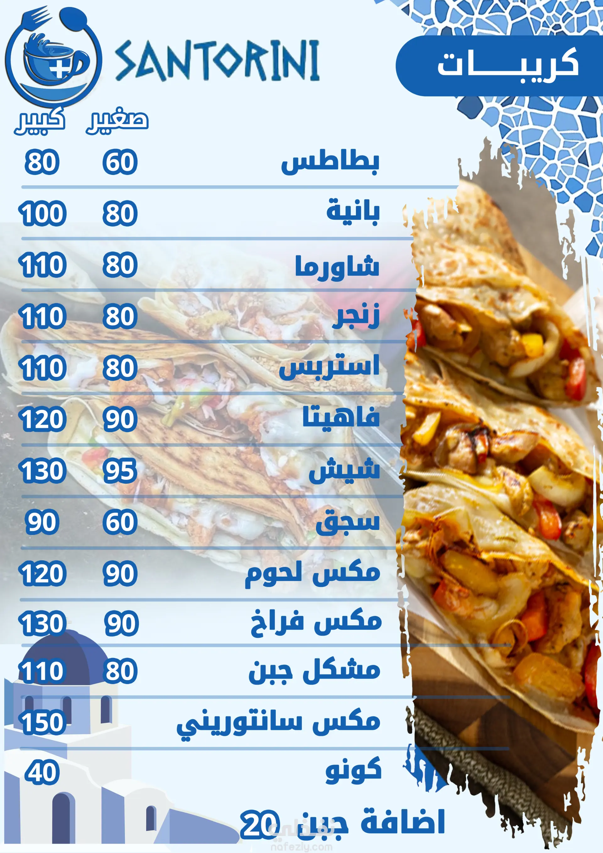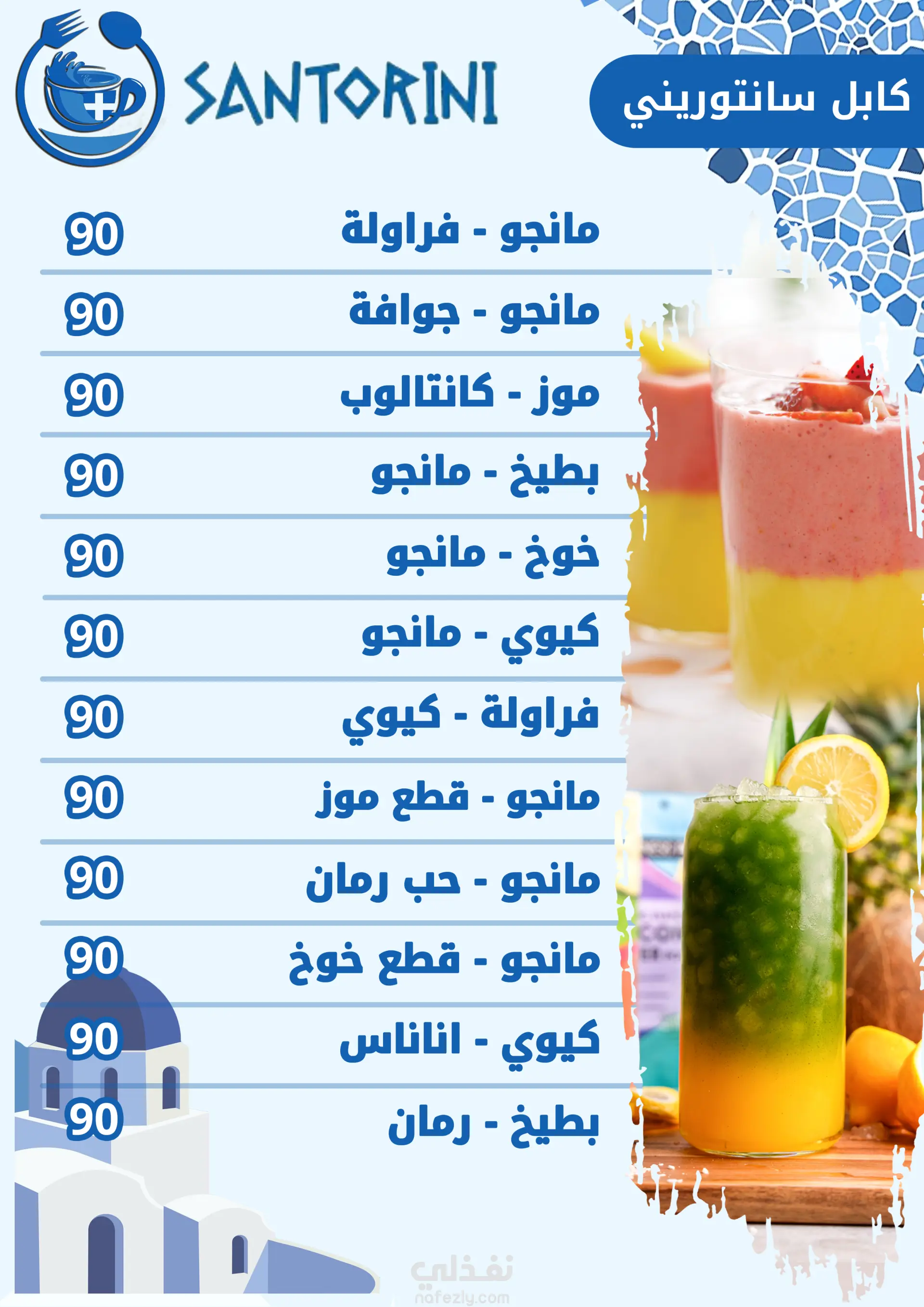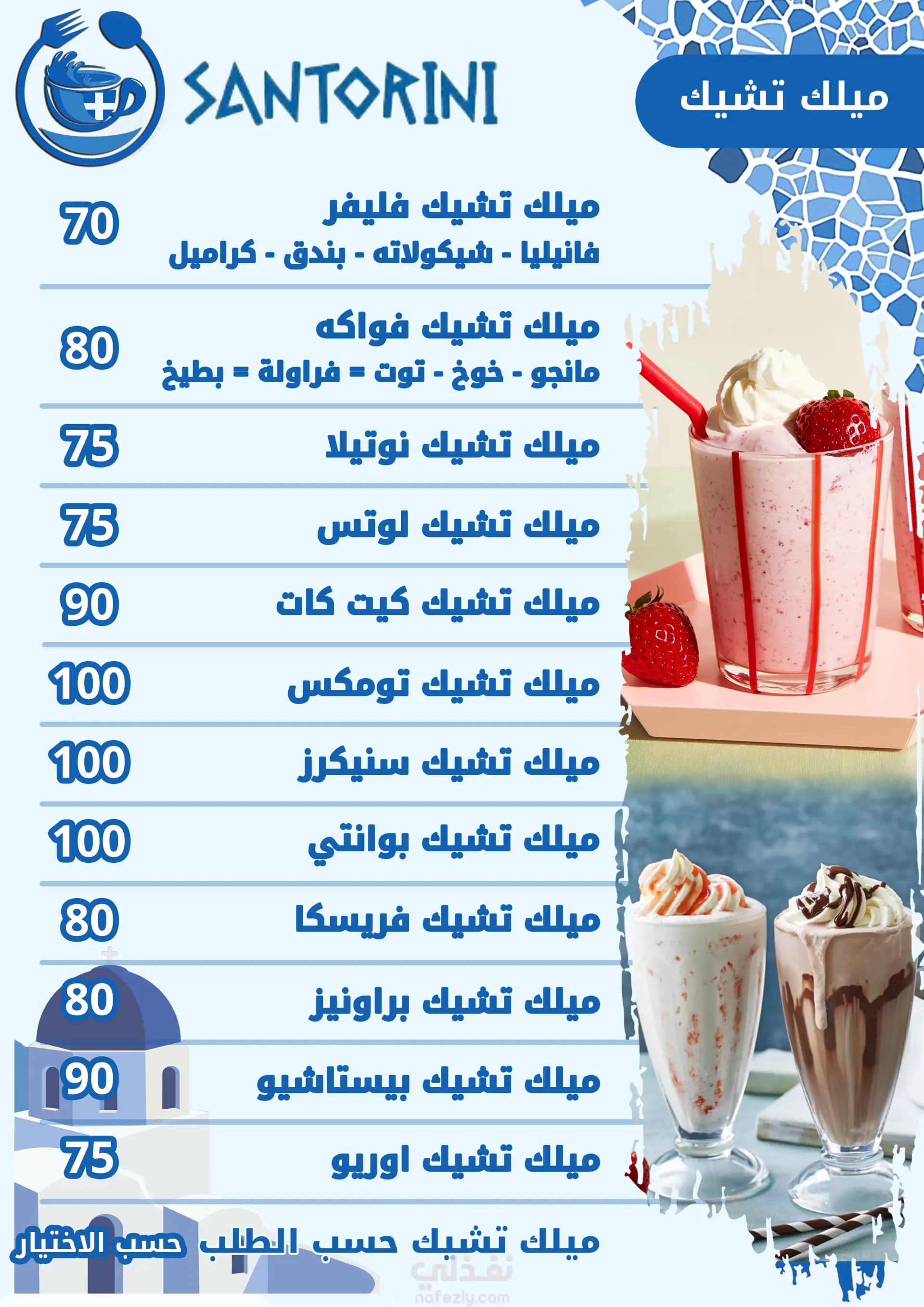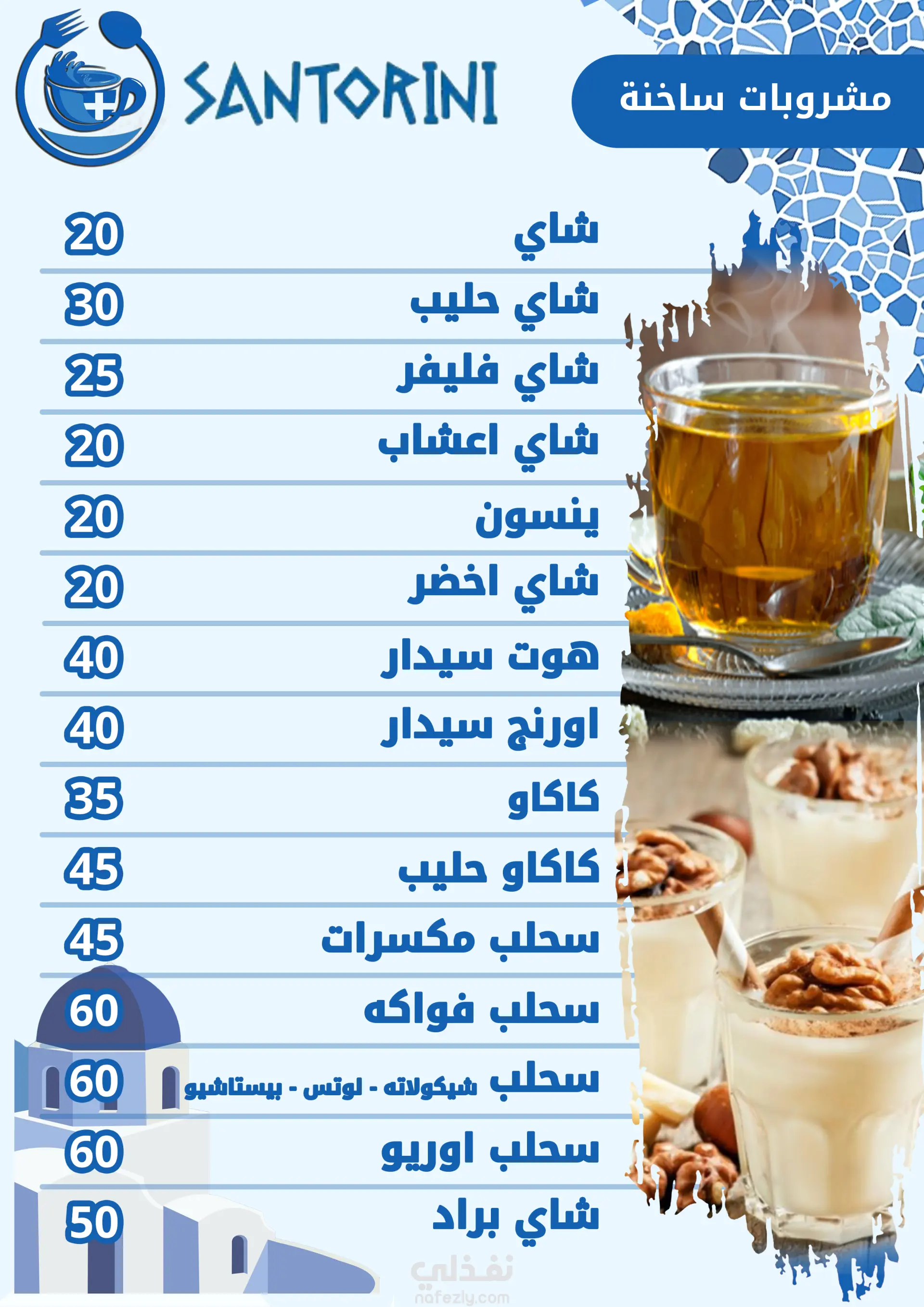 تصميم عصري متناسق لقائمة مطعم مصري باسم "سانتوريني" مصمم عالطراز اليوناني بالأخص جزيرة سانتوريني اليونانية