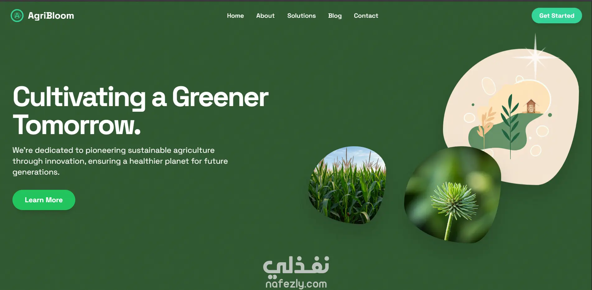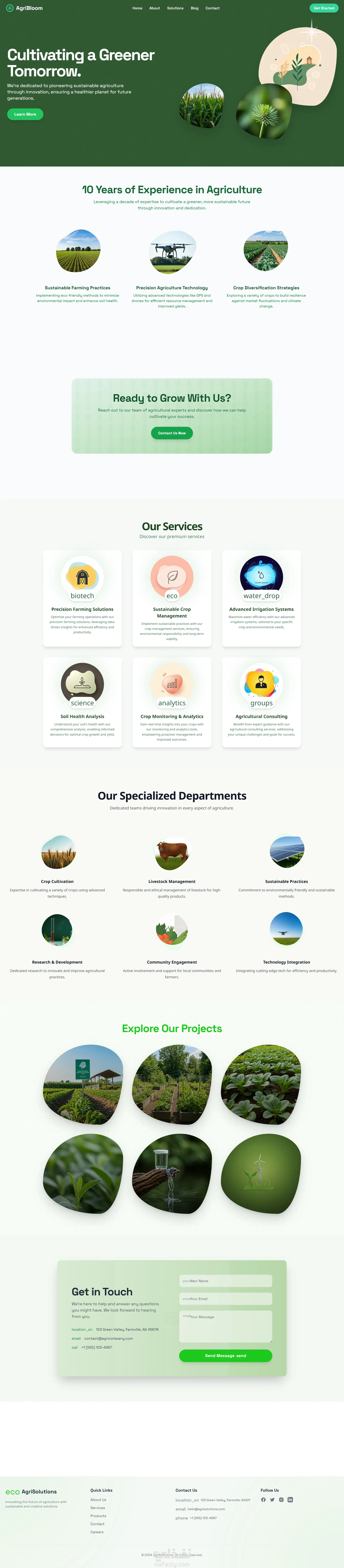 AgriBloom موقع مخصص لعرض حلول الزراعة المستدامة (Sustainable Agriculture)، يجمع بين التكنولوجيا والوعي البيئي في تصميم هادئ ومتوازن يوصل رسالة الشركة بوضوح: