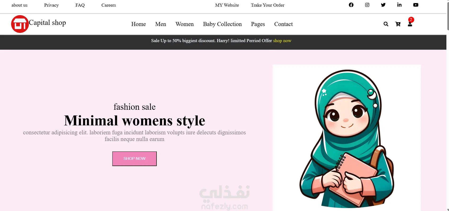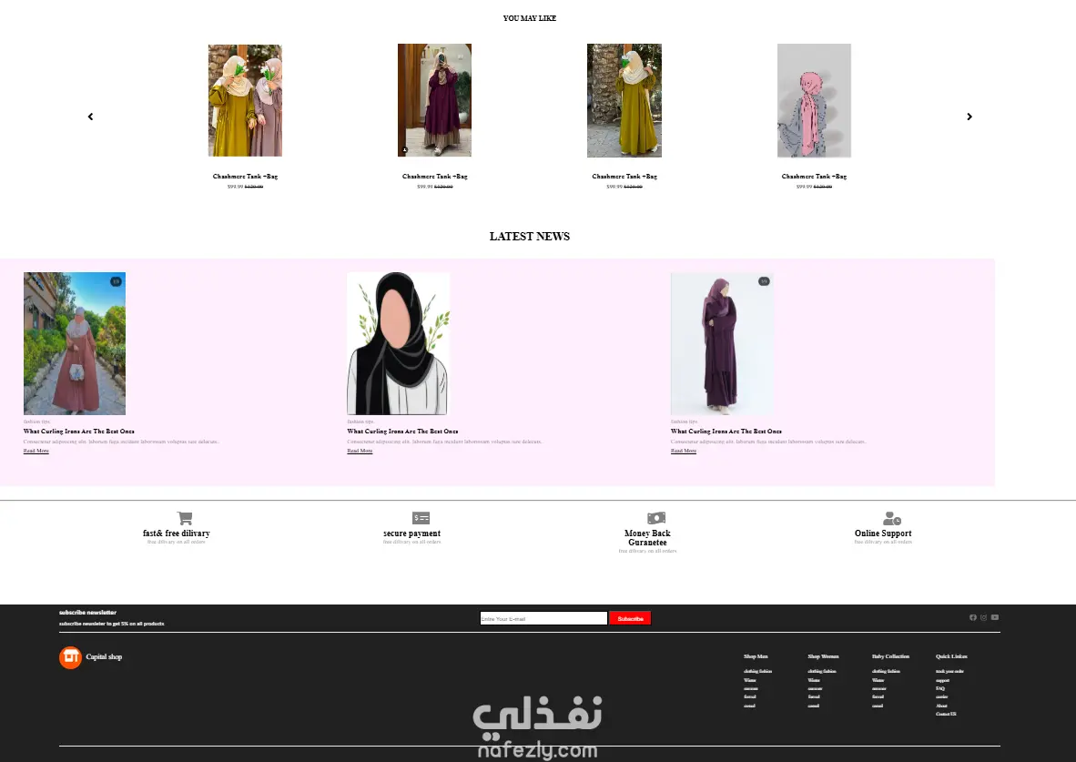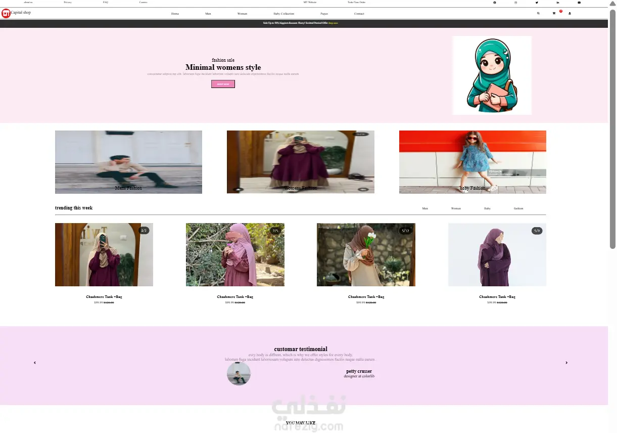 تصميم واجهة احترافية وسهلة الاستخدام. أقسام منظمة للملابس (رجالي – نسائي – أطفال). شريط تنقل علوي يحتوي على روابط رئيسية وصفحات فرعية. بانر دعائي جذاب يعرض أحدث العروض والخصومات. قسم “Trending this week” لعرض المنتجات المميزة. قسم “You may like” لتوصية المستخدم بمنتجات مشابهة. تذييل (Footer) يحتوي على روابط سريعة، اشتراك بالنشرة البريدية، وأيقونات التواصل الاجتماعي. استخدام تنسيقات ألوان هادئة ومتناسقة تبرز الطابع العصري للمتجر.