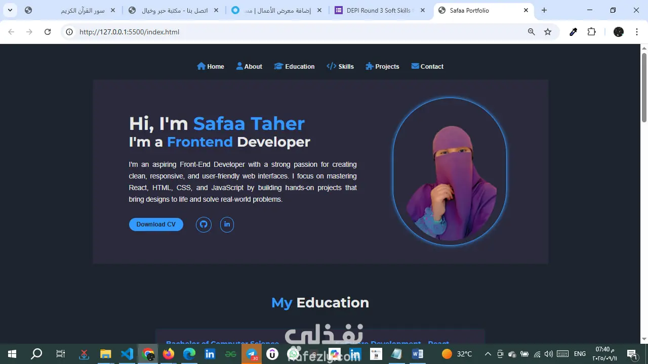 موقع بورتفوليو شخصي تم إنشاؤه باستخدام HTML و CSS مع Media Queries ليكون متجاوبًا مع جميع أحجام الشاشات.
