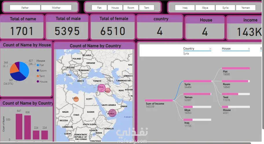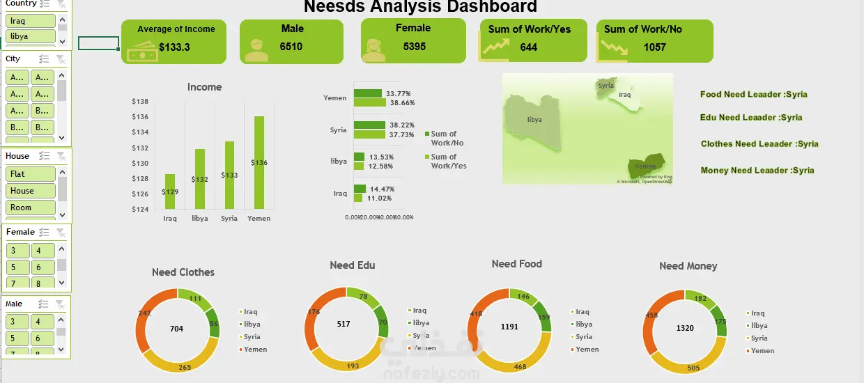 قمت بتصميم لوحة بيانات تفاعلية (Dashboard) باستخدام Excel وPower BI لتحليل وعرض احتياجات الدول المتضررة من الحروب.