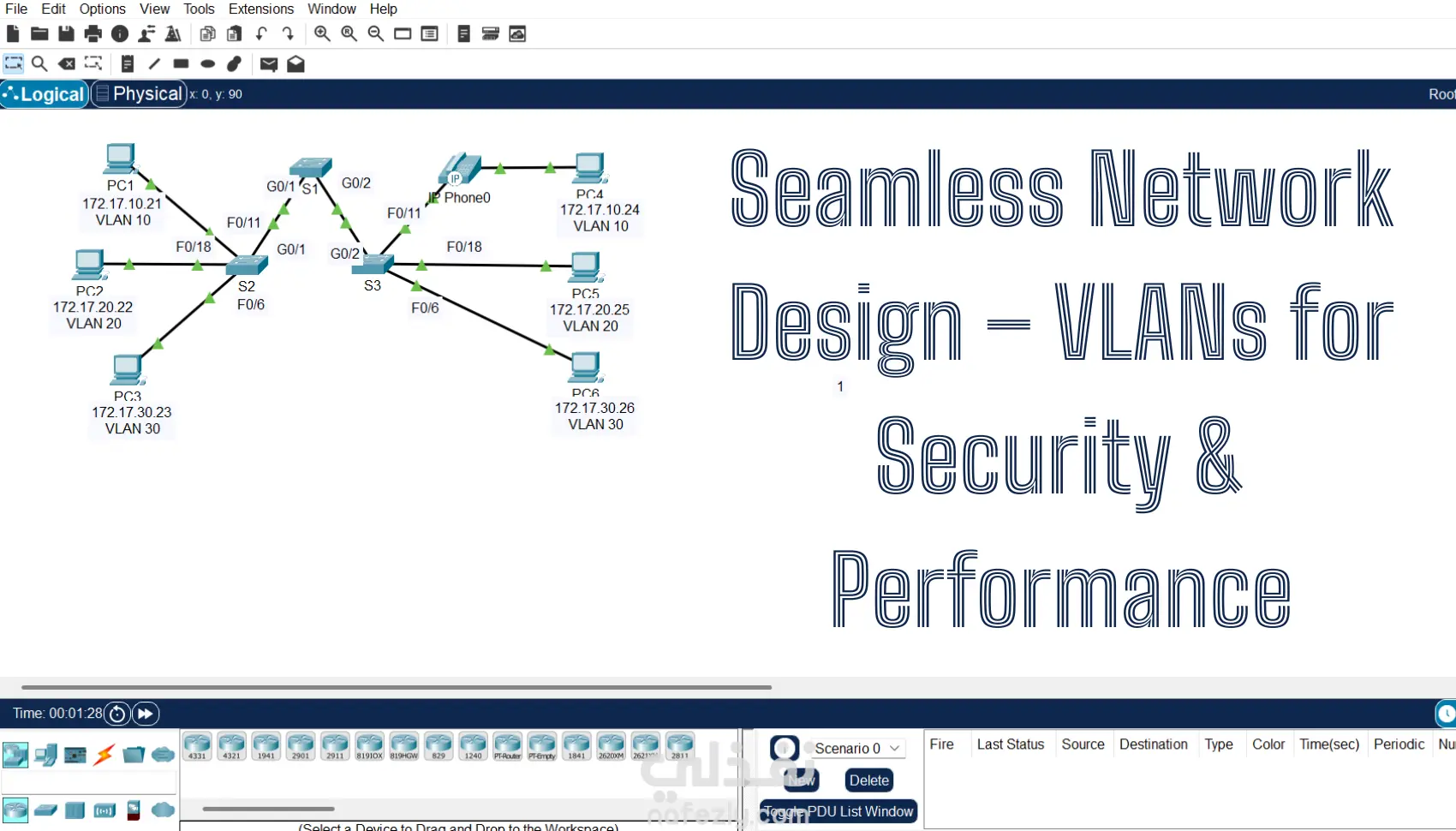 تم تنفيذ هذا المشروع باستخدام Cisco Packet Tracer بهدف تصميم شبكة عملية ومنظمة تدعم تقسيم الإدارات داخل بيئة العمل. يشمل المشروع (الباقة الأساسية): - إنشاء حتى 3 VLANs لفصل حركة المرور بين الأقسام المختلفة (مثال: الإدارة، المبيعات، الدعم الفني). - إعداد Inter-VLAN Routing لتمكين التواصل بين هذه الـ VLANs. - تكوين Switch واحد + Router واحد + حتى 5 أجهزة (PCs أو Laptops). - اختبار الاتصال (Ping) والتأكد من عمل الشبكة بشكل صحيح. - يمكن إضافة المزيد من الأجهزة أو الـ VLANs في الباقات الإضافية.