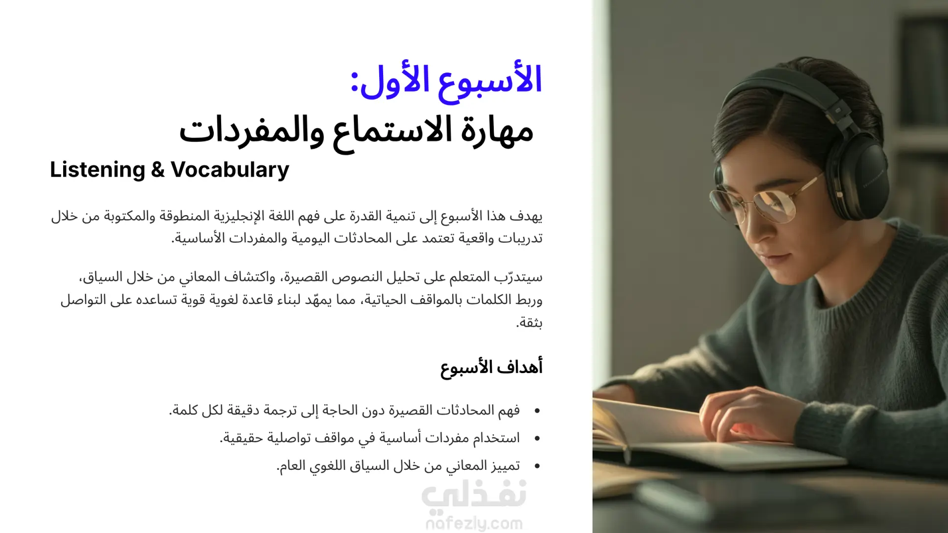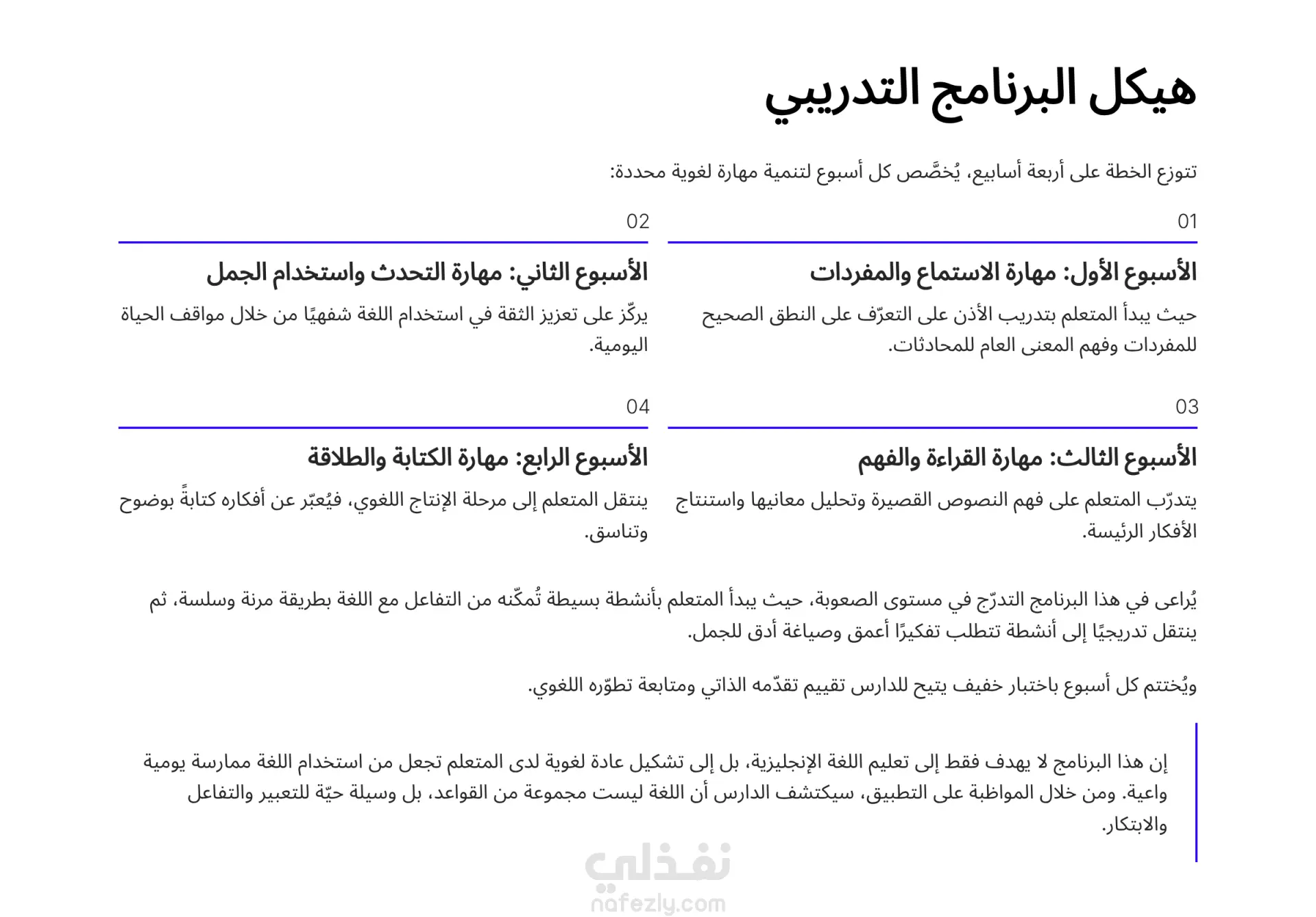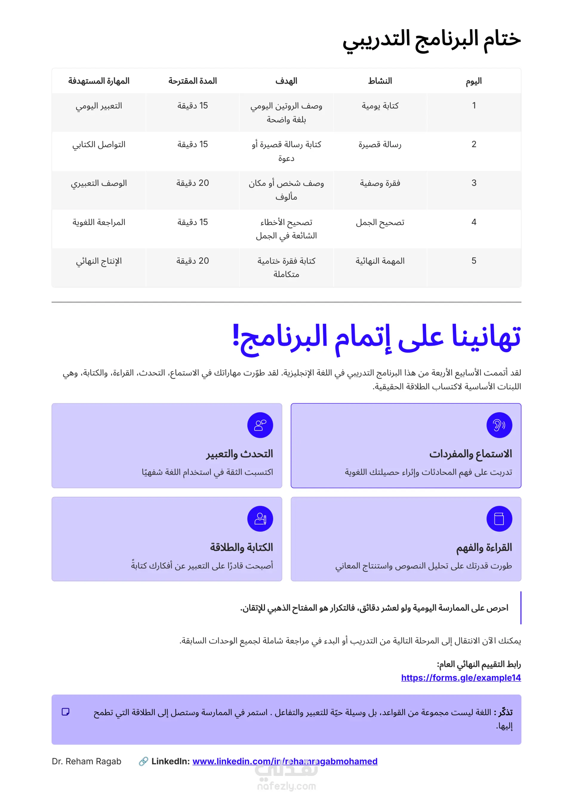 قمت بتصميم وإعداد برنامج تعليمي متكامل لتعليم مبادئ اللغة الإنجليزية بأسلوب تفاعلي منظم، يشمل أربعة أسابيع تدريبية تغطي مهارات الاستماع، التحدث، القراءة، والكتابة. تم تنسيق الملف بصيغة Word وPDF بأسلوب أكاديمي احترافي مع تضمين أنشطة وتقييمات قصيرة وروابط Google Form. البرنامج قابل للطباعة والاستخدام الإلكتروني، وتم تصميم الجداول من اليمين إلى اليسار بما يتناسب مع المحتوى العربي.