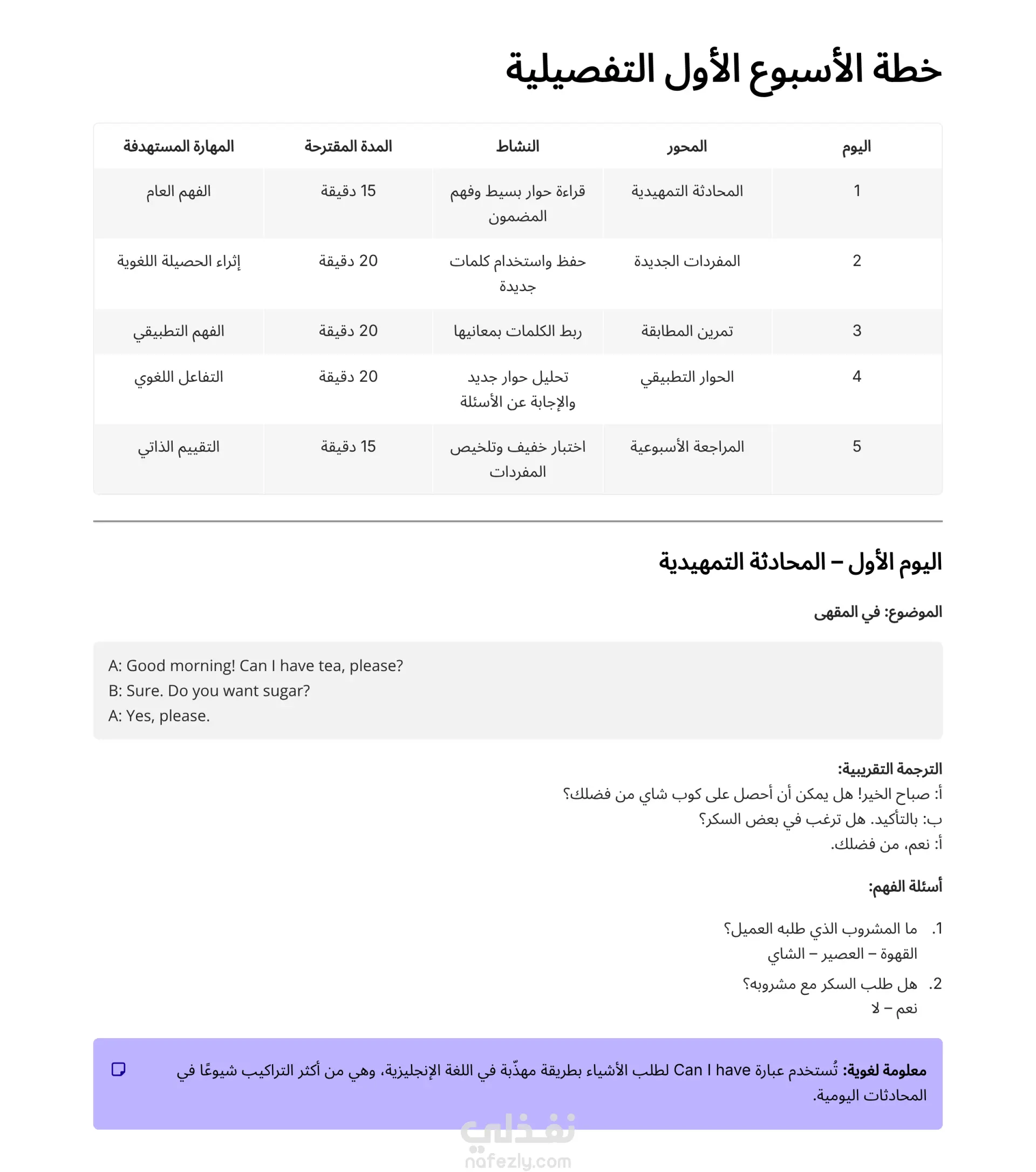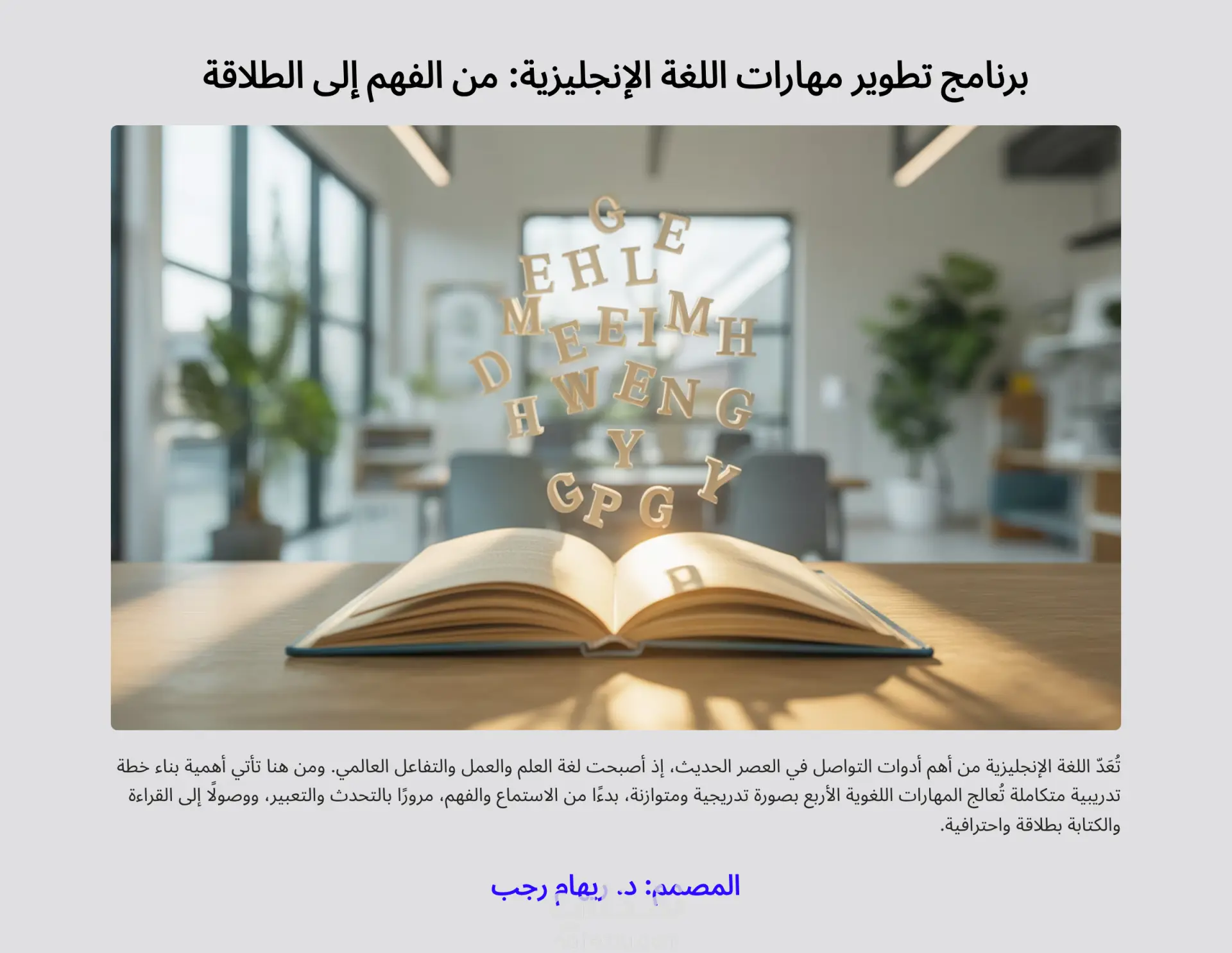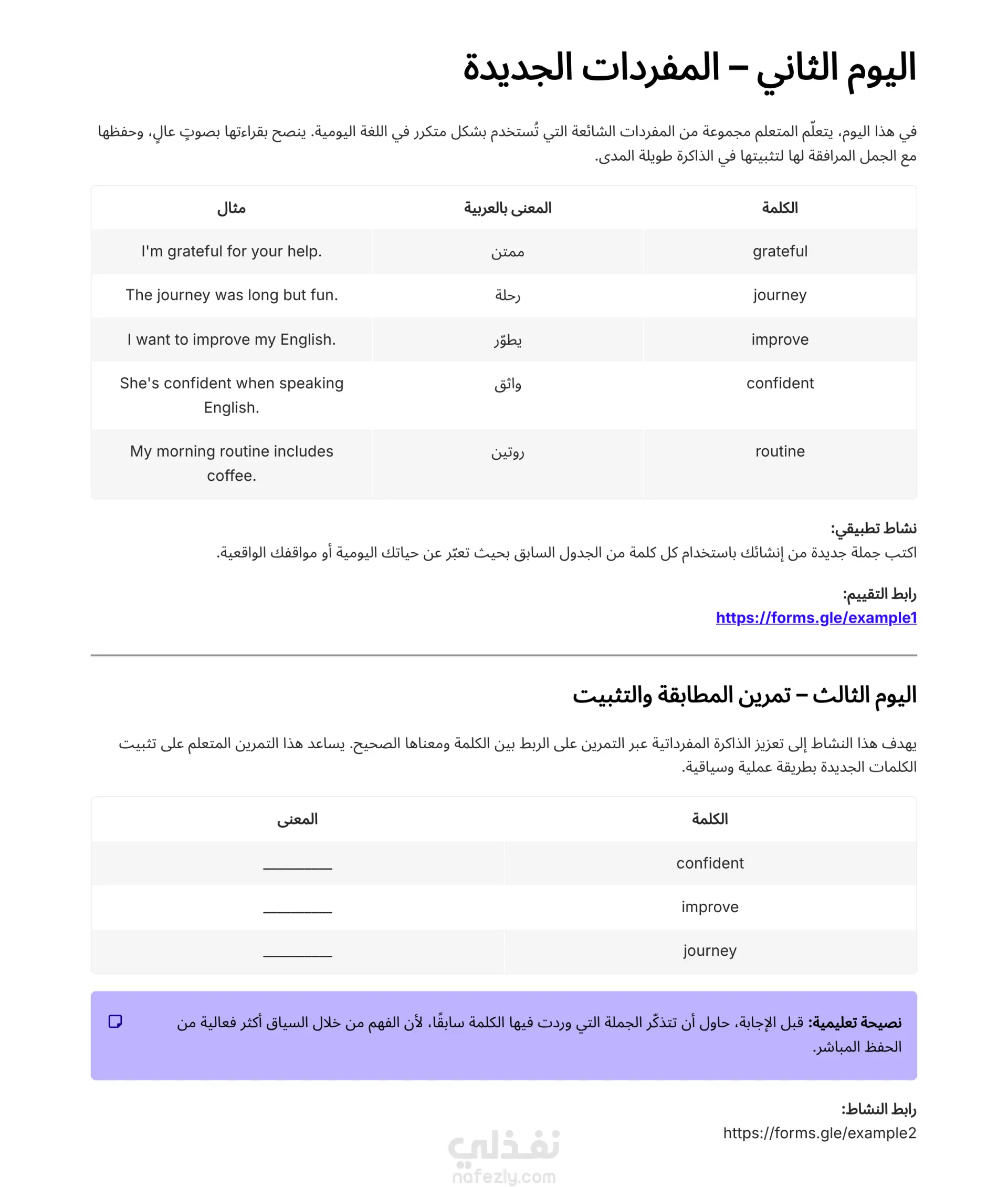 قمت بتصميم وإعداد برنامج تعليمي متكامل لتعليم مبادئ اللغة الإنجليزية بأسلوب تفاعلي منظم، يشمل أربعة أسابيع تدريبية تغطي مهارات الاستماع، التحدث، القراءة، والكتابة. تم تنسيق الملف بصيغة Word وPDF بأسلوب أكاديمي احترافي مع تضمين أنشطة وتقييمات قصيرة وروابط Google Form. البرنامج قابل للطباعة والاستخدام الإلكتروني، وتم تصميم الجداول من اليمين إلى اليسار بما يتناسب مع المحتوى العربي.