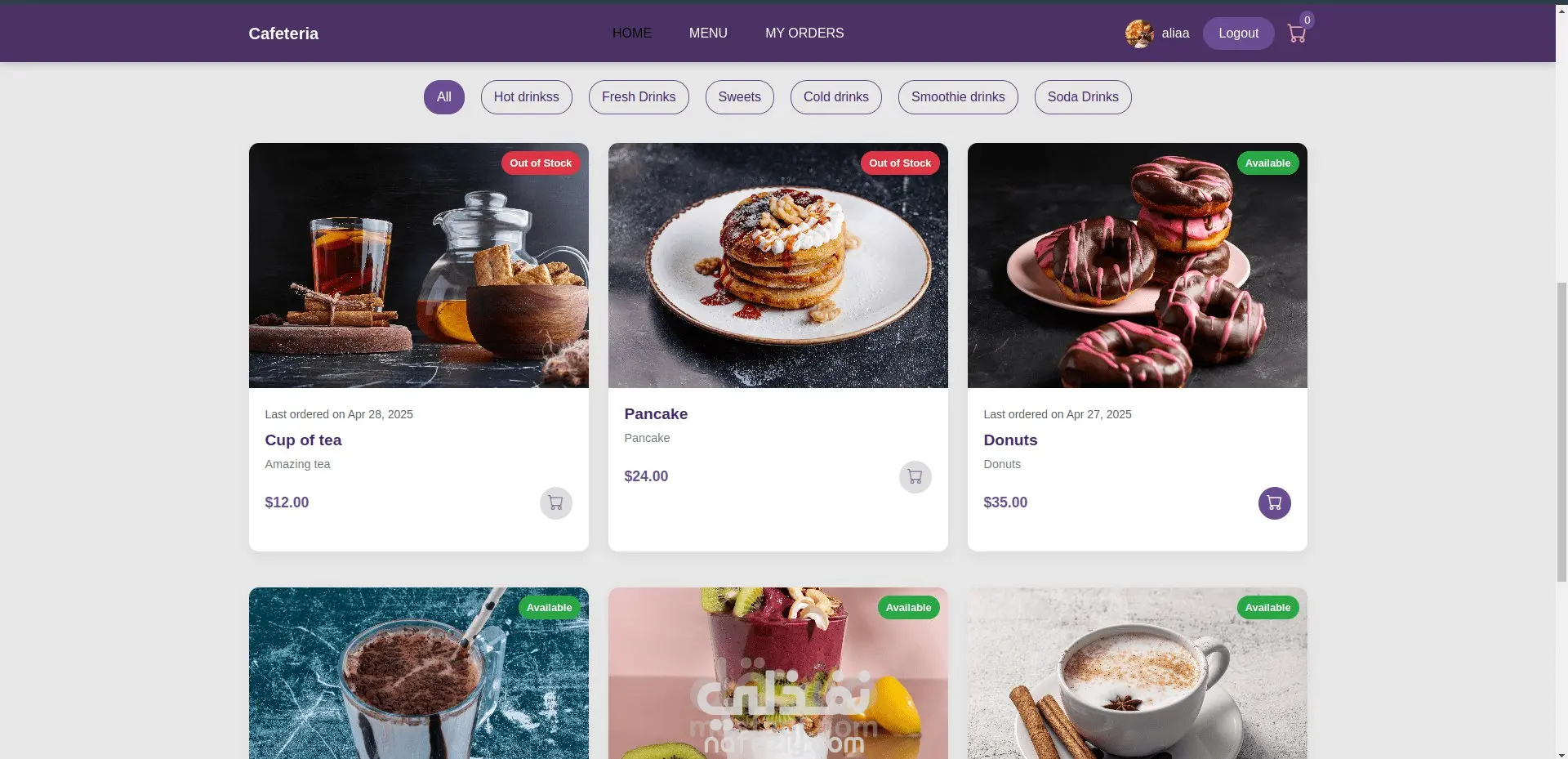 الصفحة الرئيسية للمستخدمين: يتم عرض الوجبات والمشروبات المتاحة، ويمكن للمستخدمين تصفح المنتجات وإجراء الطلب بسهولة.