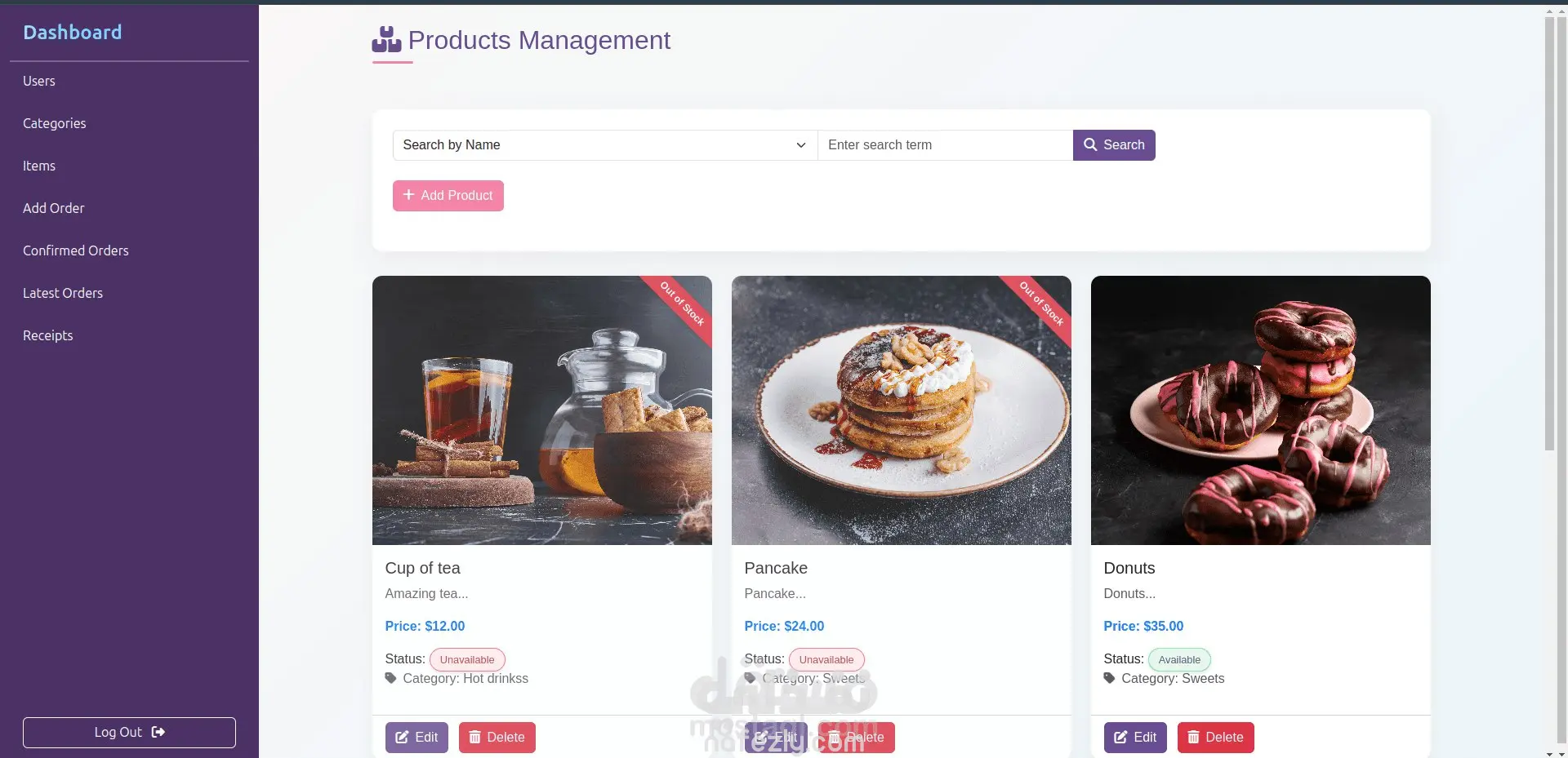 لوحة تحكم للمسؤول (Dashboard): يمكن من خلالها إدارة الأصناف، ومتابعة الطلبات، وتحديث حالة كل طلب (مثل: قيد الانتظار، قيد التحضير، تم التوصيل)، بالإضافة إلى إمكانية عرض التقارير وطباعة الفواتير.