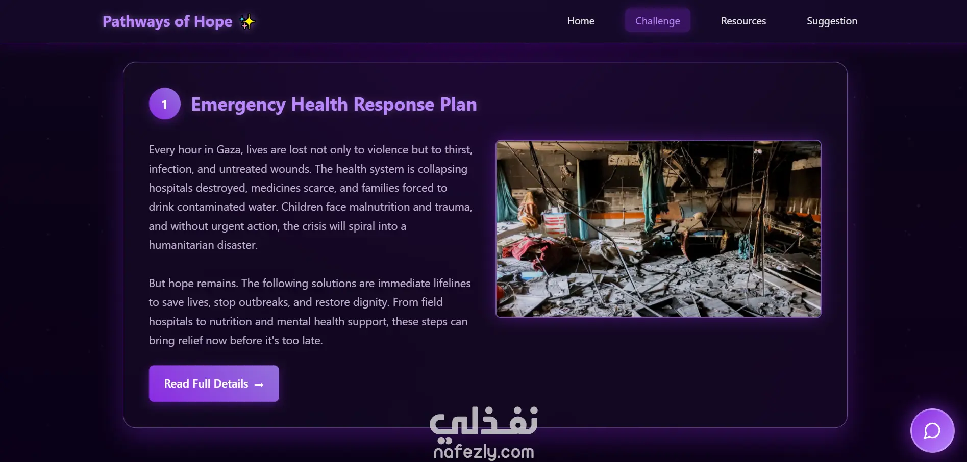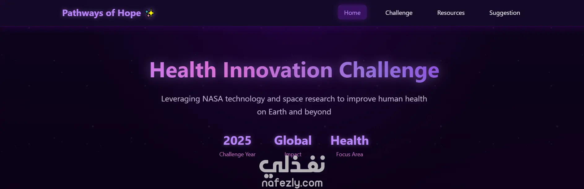 يُقدّم المشروع منصة رقمية تعليمية وحلّية تحت عنوان «تحدّي الابتكار الصحي 2025» بالتعاون مع NASA. وهدفها رفع الوعي والمساهمة في معالجة أزمات المياه، الهواء، والبُنى التحتية في منطقة قطاع غزة، من خلال ربط بيانات المراقبة الأرضية التابعة لوكالة NASA مع تقارير إنسانية، وعرضها بطريقة تفاعلية.