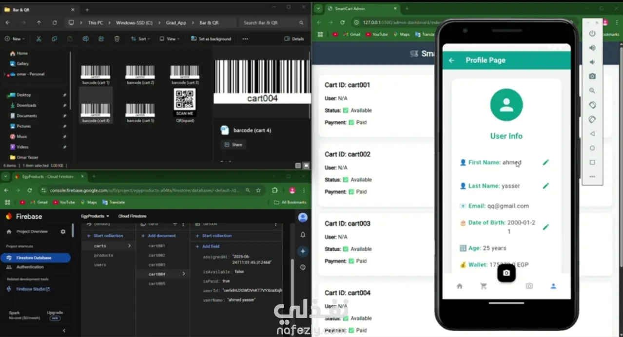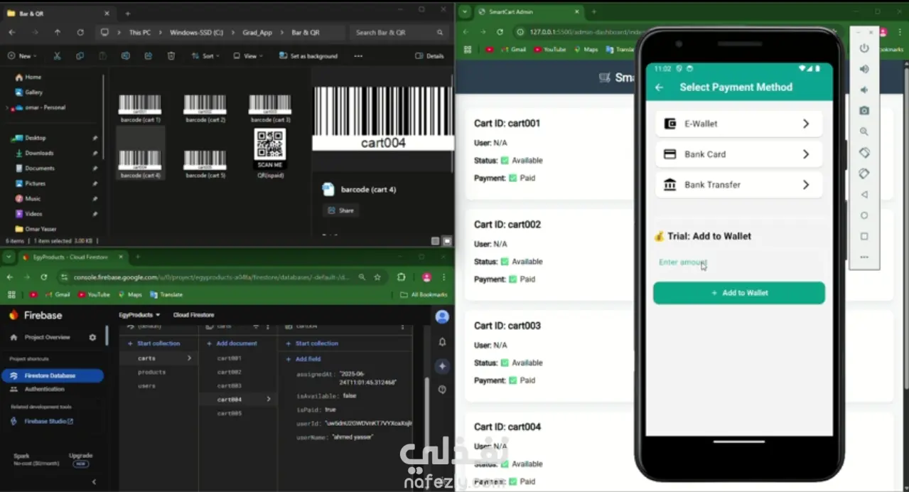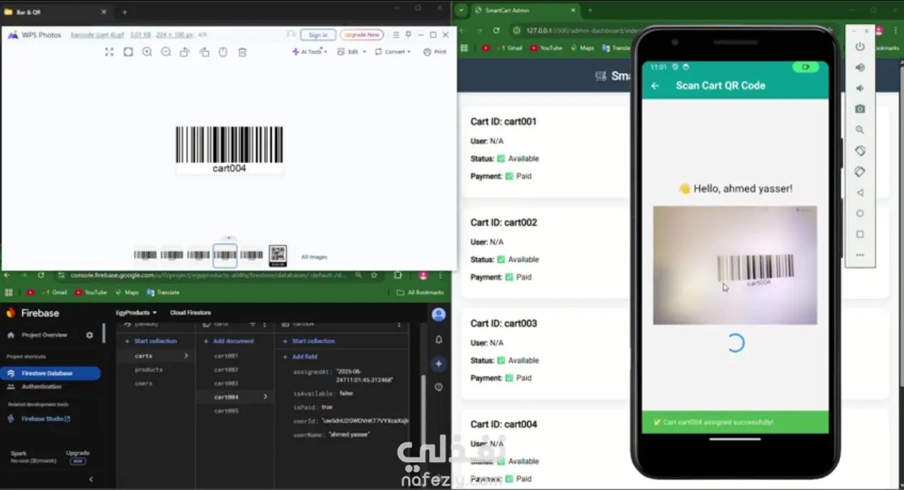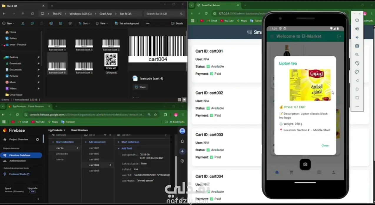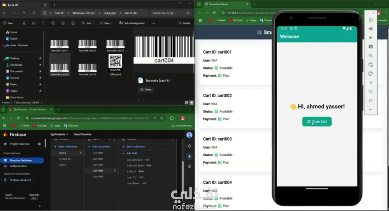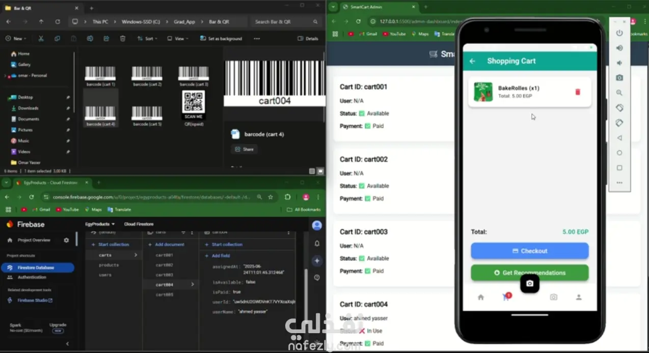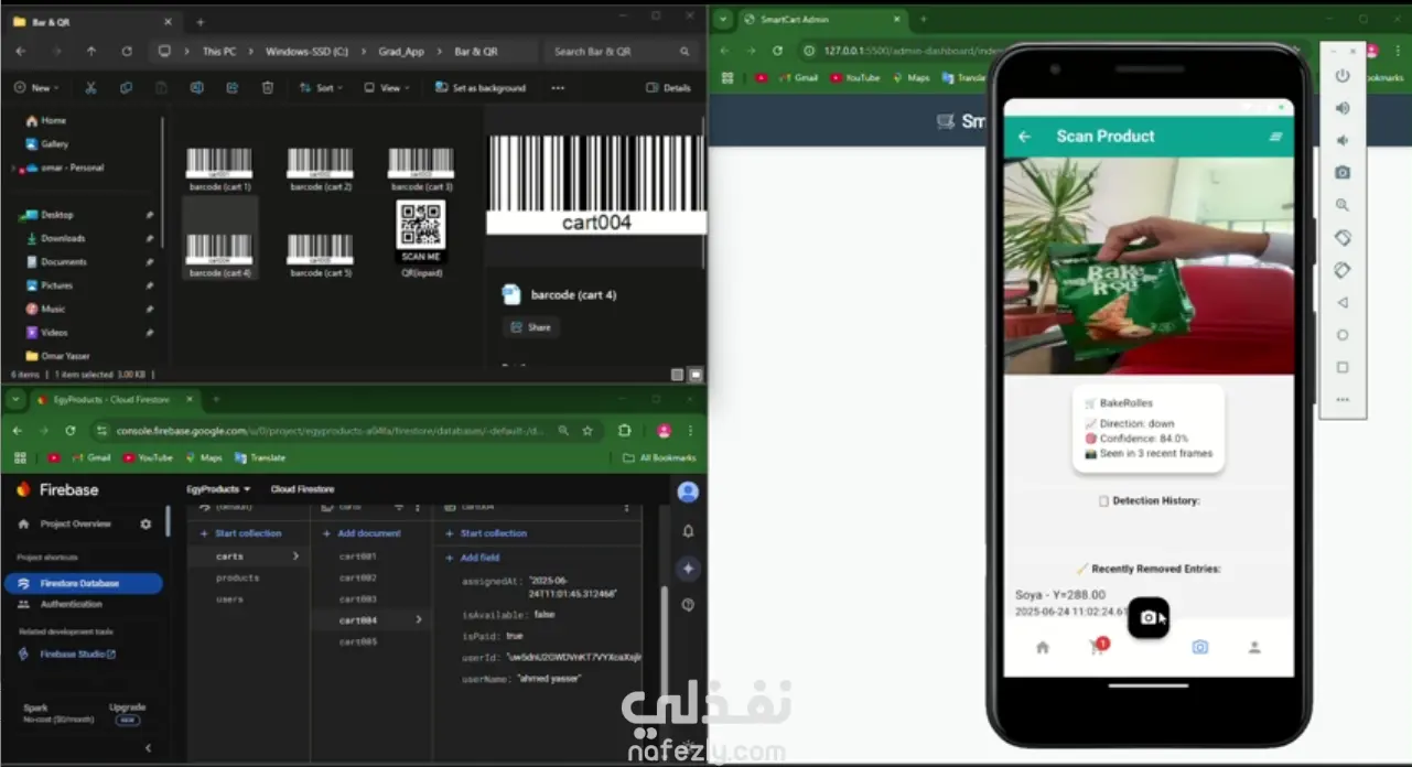يهدف التطبيق إلى مساعدة المستخدمين على التسوق بسهولة من خلال عربة ذكية قادرة على: التعرف على المنتجات الموضوعة داخل العربة باستخدام الكاميرا. حساب السعر الإجمالي تلقائيًا دون الحاجة للمرور على الكاشير. عرض تفاصيل المنتج والأسعار مباشرة على واجهة الهاتف. تم استخدام مجموعة من التقنيات الحديثة في بناء المشروع، منها: Flutter وAndroid Studio لتطوير واجهة المستخدم متعددة المنصات. YOLOv11 للتعرف على المنتجات. PaddleOCR لاستخراج النصوص من عبوات المنتجات. SAM2 لتجزئة الصور وتحسين دقة التعرف. Firebase لتخزين البيانات وإدارة العمليات السحابية. كما قمت بإنشاء قاعدة بيانات لمنتجات مصرية تحتوي على صور وبيانات تفصيلية تم تجميعها يدويًا خصيصًا للمشروع، وتم رفعها على منصة Kaggle لتكون مرجعًا مفتوحًا قابلًا لإعادة الاستخدام والتطوير. شارك في تنفيذ المشروع فريق من المطورين، وكان دوري البحث والتطوير في جانب الذكاء الاصطناعي، بما في ذلك اختيار النماذج المناسبة (YOLOv11, PaddleOCR, SAM2) ودمجها مع التطبيق لضمان أداء عملي ودقيق أثناء عملية التعرف على المنتجات.
