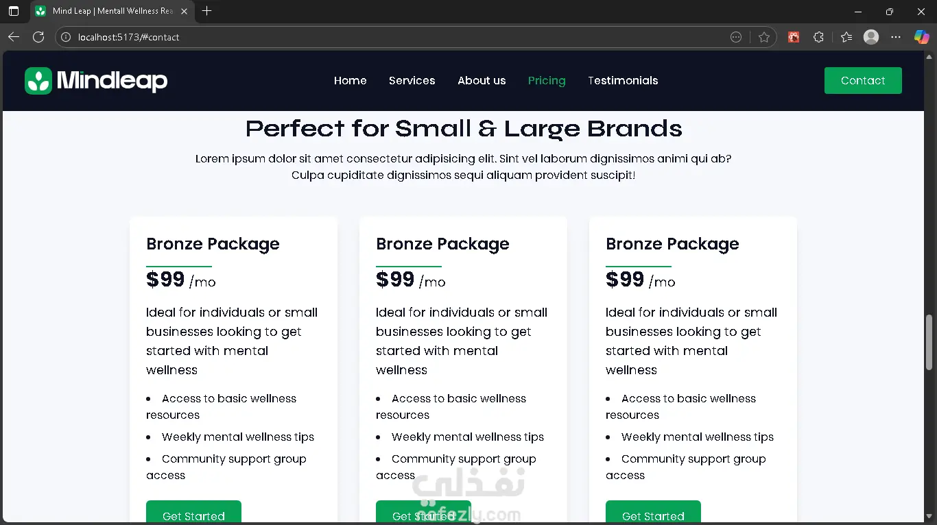 واجهة موقع متكاملة مبنية باستخدام React وTailwind، مخصّصة لعرض خدمات الصحة النفسية والاستشارات، بتصميم عصري وتجربة استخدام سلسة على جميع الأجهزة. الوصف الكامل (Professional Full Description) MindLeap هو مشروع واجهة موقع احترافي (React UI Template) تم تصميمه وتطويره ليكون مناسبًا لمواقع الاستشارات النفسية، العيادات، ومقدّمي الخدمات. الموقع مبني بالكامل بـ React.js + Tailwind CSS مع كتابة كود نظيف، قابل للتطوير، ومتوافق مع أفضل معايير UI/UX. يتكوّن الموقع من عدة أقسام رئيسية تساعد في عرض الخدمات بشكل واضح وجذاب: Hero Section قسم ترحيبي جذاب بمحتوى تعريفي مختصر. Services Section عرض منسّق لبرامج وخدمات الصحة النفسية. About Us Section معلومات موجزة عن هدف الخدمة وكيفية مساعدة الزوار. Pricing Section خطط أسعار واضحة ومناسبة للعرض التجاري. Testimonials Section آراء المستخدمين لإضافة مصداقية للموقع. Contact Section نموذج تواصل بسيط وسهل الاستخدام. المميزات (Key Features) تصميم حديث وبسيط ومناسب لأسلوب الـ Wellness متجاوب بالكامل (Fully Responsive) كود منظم وسهل التعديل استخدام React Components لإعادة الاستخدام تحميل سريع وأداء ممتاز تصميم متوافق مع معايير UI/UX قابل للاستخدام كقالب لشركات وخدمات متنوعة التقنيات المستخدمة (Tech Stack) React.js JavaScript (ES6+) Tailwind CSS Vite Responsive Web Design Component-Based Architecture