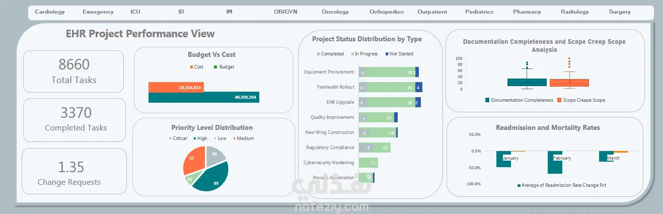 يعرض هذا الداشبورد نظرة شاملة على أداء مشروع السجلات الطبية الإلكترونية من خلال مجموعة من المؤشرات البصرية. يوضح إجمالي المهام وعدد المهام المكتملة، إلى جانب معدل طلبات التغيير، مما يساعد على متابعة تقدم المشروع. كما يتضمن مقارنة بين الميزانية والتكلفة الفعلية، وتوزيع مستويات الأولوية (حرجة، عالية، متوسطة)، بالإضافة إلى عرض حالة تنفيذ أنواع المشاريع المختلفة مثل شراء المعدات، تطوير الأنظمة، الأمن السيبراني، والأتمتة. ويُظهر الداشبورد أيضًا تحليلاً لمؤشري اكتمال التوثيق (Documentation Completeness) ونطاق التغيير (Scope Creep) لتقييم جودة التنفيذ، إلى جانب رسم يوضح معدلات إعادة الدخول والوفيات خلال الأشهر المختلفة. بشكل عام، يساعد هذا الداشبورد فرق العمل على متابعة التقدم وتحديد التحديات وتحليل الأداء بطريقة بصرية واضحة وسهلة الفهم.