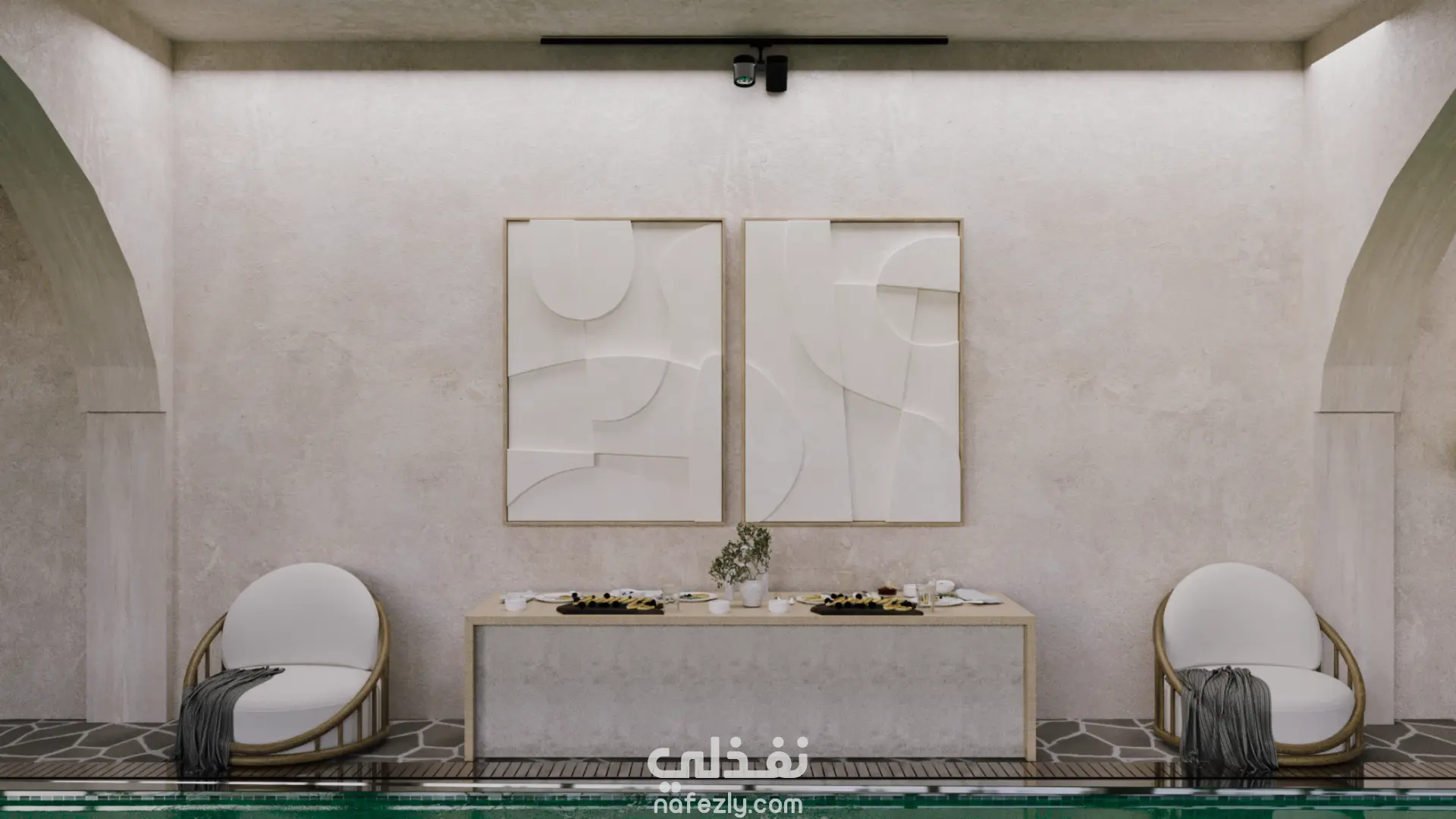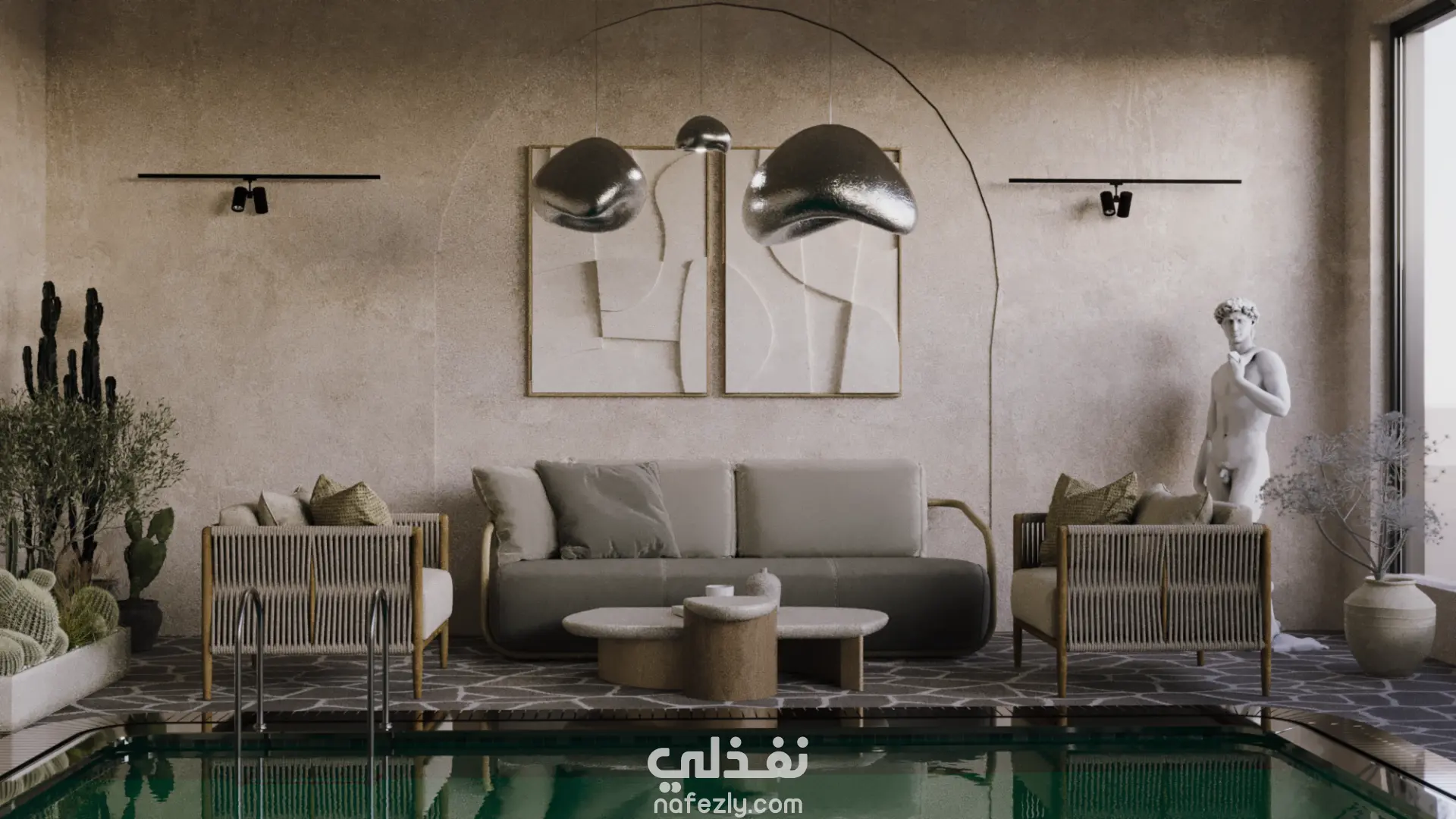 الفراغ يعتمد على التوازن بين العناصر الطبيعية واللمسات الفنية مثل التماثيل والإضاءة الجدارية الناعمة، ما يخلق تجربة بصرية مريحة تعكس الإتقان في التفاصيل والمواد.