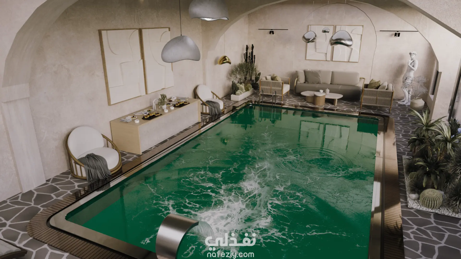 تم تصميم الأثاث بخطوط انسيابية تعزز الشعور بالراحة، بينما تضيف الشلالات المائية لمسة من الحيوية والهدوء في الوقت نفسه.