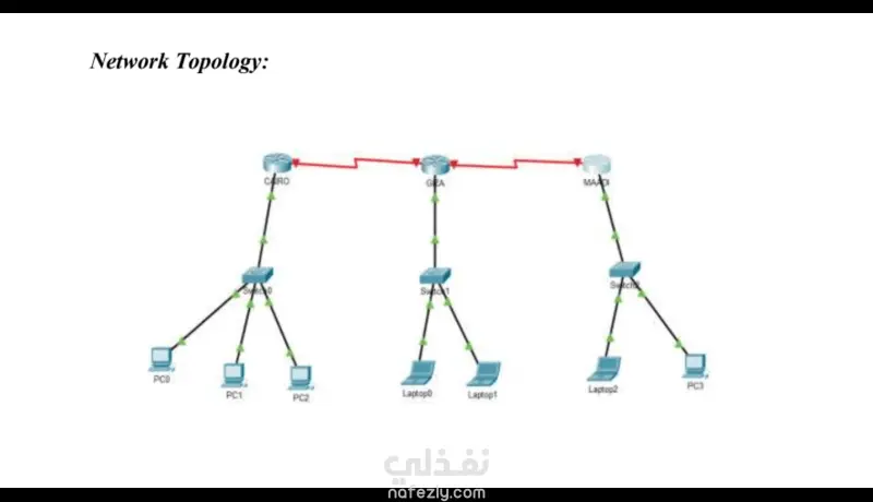 1. Network Topology Overview: Three branches, each with: - A router (CAIRO, GIZA, MAADI) - A switch - Connected end-user devices (PCs or laptops) - DHCP automatically assigns IPs 2. IP Addressing Table CAIRO Branch – 192.168.1.0/29 Subnet Mask: 255.255.255.248 Range: 192.168.1.1 – 192.168.1.6 Broadcast: 192.168.1.7 Device IP Address Notes CAIRO Router 192.168.1.1 Default Gateway PC0 192.168.1.2 DHCP PC1 192.168.1.3 DHCP PC2 192.168.1.4 DHCP (Free) 192.168.1.5–6 Available for future GIZA Branch – 192.168.2.0/29 Subnet Mask: 255.255.255.248 Range: 192.168.2.1 – 192.168.2.6 Broadcast: 192.168.2.7 Device IP Address Notes GIZA Router 192.168.2.1 Default Gateway Laptop0 192.168.2.2 DHCP Laptop1 192.168.2.3 DHCP (Free) 192.168.2.4–6 Available for future MAADI Branch – 192.168.3.0/29 Subnet Mask: 255.255.255.248 Range: 192.168.3.1 – 192.168.3.6 Broadcast: 192.168.3.7 Device IP Address Notes MAADI Router 192.168.3.1 Default Gateway Laptop2 192.168.3.2 DHCP PC3 192.168.3.3 DHCP (Free) 192.168.3.4–6 Available for future 3. DHCP Configuration Summary Each router runs a DHCP pool to automatically assign IPs to local devices. DHCP excludes the router’s IP as a default gateway and assigns remaining usable ones. 4. Summary - Every branch uses a /29 subnet (supports up to 6 hosts, can be edited later). - Routers serve as DHCP servers and default gateways. - Devices receive IPs dynamically in their subnet. - IP ranges are non-overlapping and properly segmented.