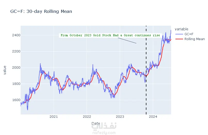 جمع البيانات: يتم جلب بيانات الأسعار التاريخية من موقع Yahoo Finance باستخدام مكتبة yfinance للرموز GC=F وAAPL وMSFT وSPY وTSLA، للفترة من 1 يناير 2020 إلى الوقت الحاضر (يتم تحديد التاريخ الحالي ديناميكيًا).