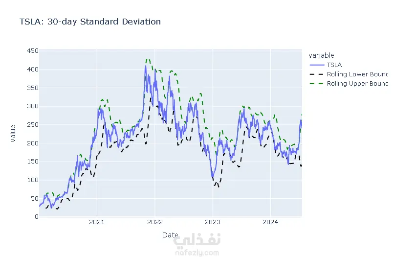 تسلا (TSLA): حققت أعلى عائد تراكمي (~740%)، ولكن مع تقلبات كبيرة (تتراوح العوائد اليومية من -20% إلى +20%).