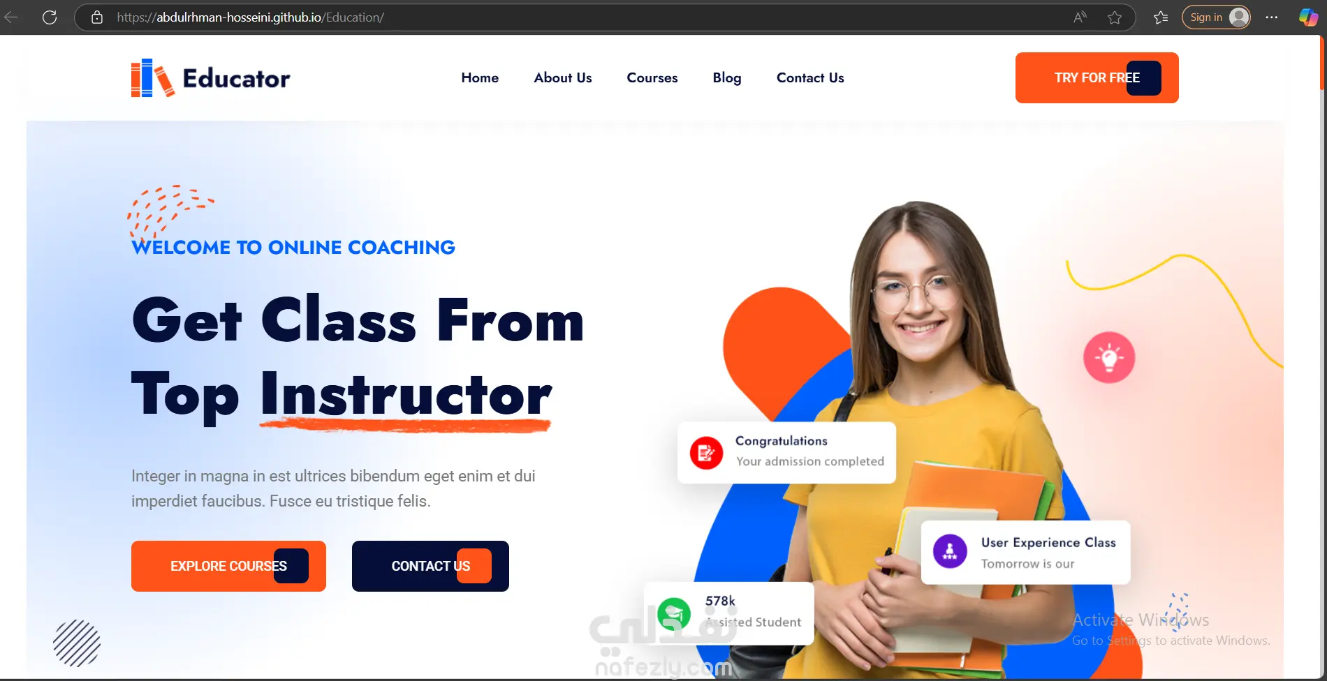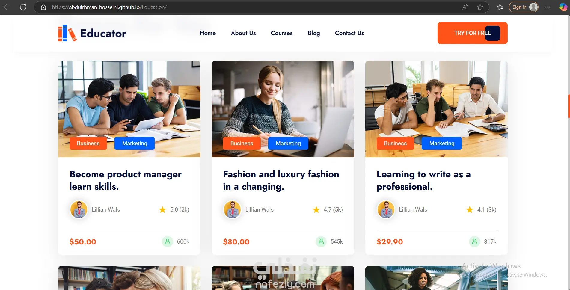 الموقع عبارة عن منصة تعليمية أطلقتها «Educator – Online Courses & Education» وتظهر فيها صفحات مثل “Home”, “About Us”, “Courses”, “Blog”, “Contact Us”. abdulrhman-hosseini.github.io يحتوي الموقع على واجهة جذّابة بباقة من الأشكال البصرية (shapes/art shapes) في الصفحة الرئيسية تجذب انتباه المستخدم. abdulrhman-hosseini.github.io قسم «Explore Popular Courses» يعرض فئات متعددة مثل Data Science, Business Strategy, Art & Design, Lifestyle, Marketing, Finance، مع أيقونات مميزة لكل فئة. abdulrhman-hosseini.github.io يعرض الموقع دورات (courses) ضمن قسم “Our Online Courses” مع تفاصيل مثل العنوان، صورة المحاضر، التقييم وعدد المتابعين، السعر — على سبيل المثال: “Business Marketing”, “Become product manager learn skills.”، التقييم 5.0 (2 k) السعر $50.00. abdulrhman-hosseini.github.io يشمل الموقع أيضًا قسم “Events” يعرض تواريخ مقبلة مثل “28 Feb 2025”, “15 Mar 2025”, “20 May 2025” مع موقع “Poland”. abdulrhman-hosseini.github.io قسم “What Our Mission Are” يُظهر ميزات/خدمات المنصة مثل Student Life, Best Online Class, 24x7 Program. abdulrhman-hosseini.github.io هناك أيضاً أقسام للمحاضرين (“Our Expert Instructor”), شهادة العملاء (“Testimonial”), مدونة (“Blog & News”). abdulrhman-hosseini.github.io تصميم الصفحة يبدو مرتباً ومتجاوباً من حيث العرض والهيكل — مناسب لتقديم خدمات تعليمية عبر الإنترنت.