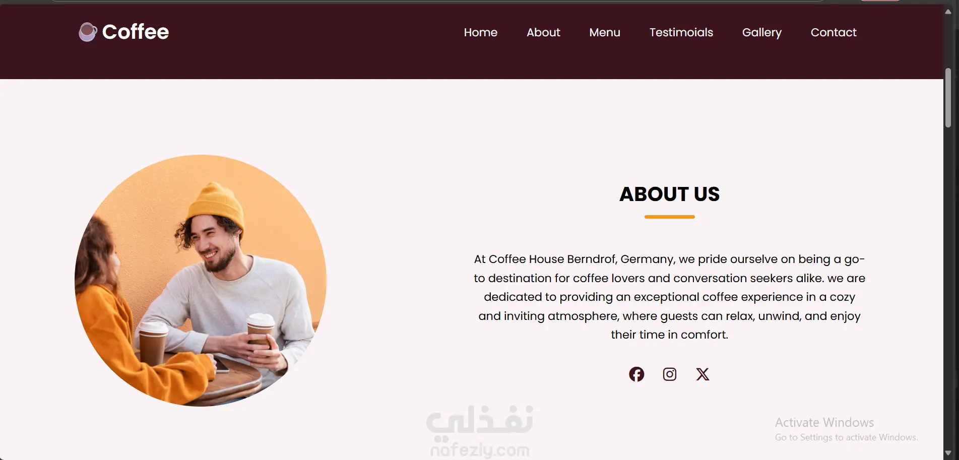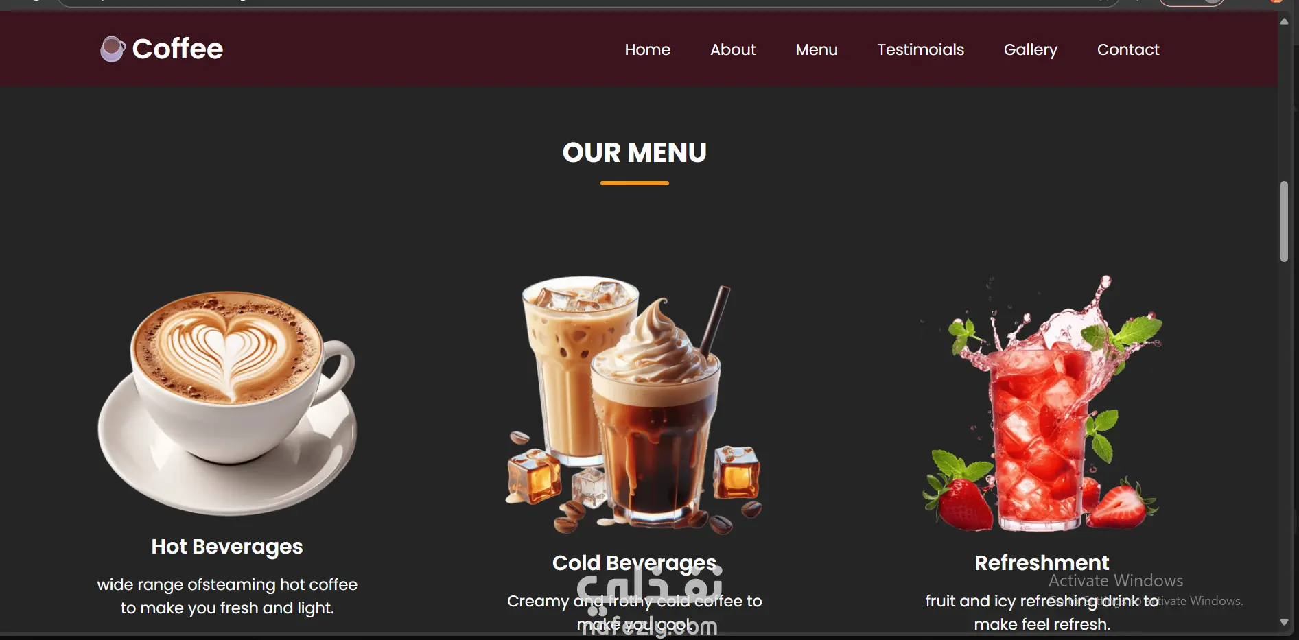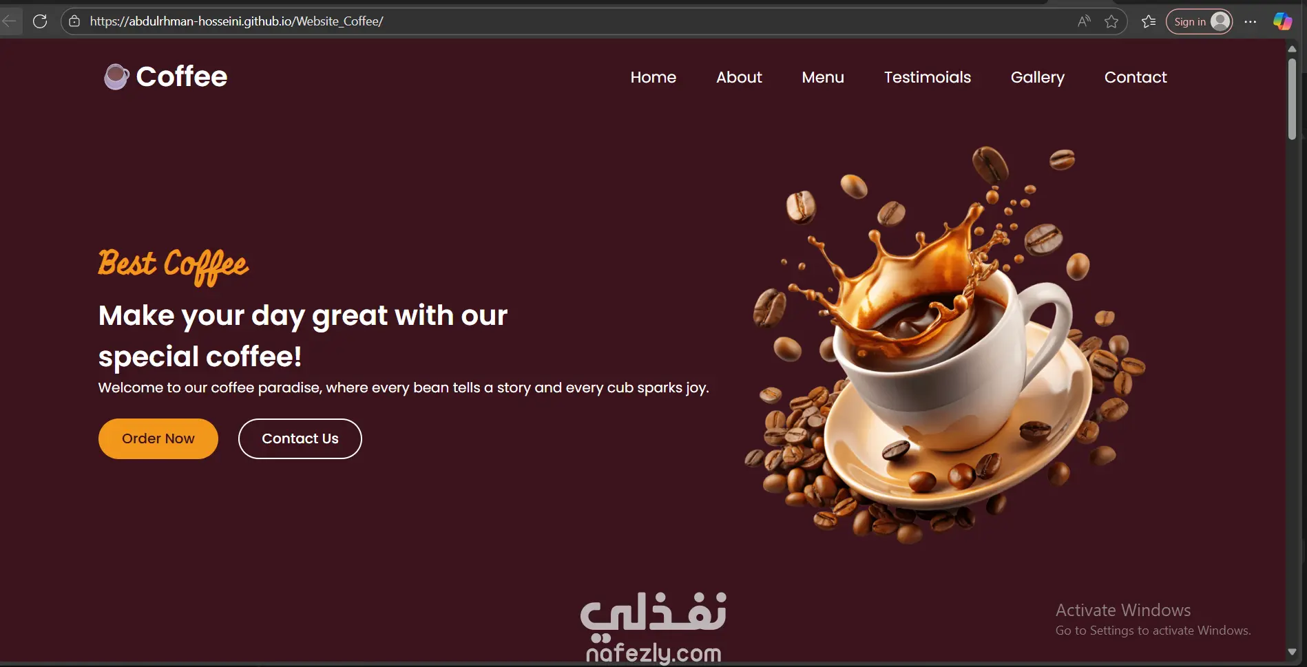 قمت بتصميم وتطوير موقع ويب ترويجي متكامل لمقهى تحت عنوان “Best Coffee – Make your day great with our special coffee!”. – شمل الموقع أقسام عديدة: الصفحة الرئيسية (Hero), “About Us”, قائمة الطعام (Menu) التي تغطي فئات مثل المشروبات الساخنة، المشروبات الباردة، المقرّات، الحلويات، البرجر والبطاطس. – أدرجت قسم تقييم العملاء (Testimonials) لعرض تجارب المستخدمين بصور وأسماء لتعزيز الثقة. – أضفت معرضاً (Gallery) من الصور لعرض الأجواء والمنتجات، بالإضافة إلى صفحة “Contact Us” تحتوي على بيانات الموقع، البريد الإلكتروني، رقم الهاتف، وساعات العمل. – اعتمدت تصميمًا بسيطًا، جذابًا، وسهل الاستخدام مع هيكل واضح يُسهل التصفح السريع. – الموقع تم بواسطة HTML/CSS (وإن استخدمت تقنيات إضافية مثل Flexbox أو Grid يُفضّل ذكرها) لعرض المحتوى بشكل متجاوب وواضح.