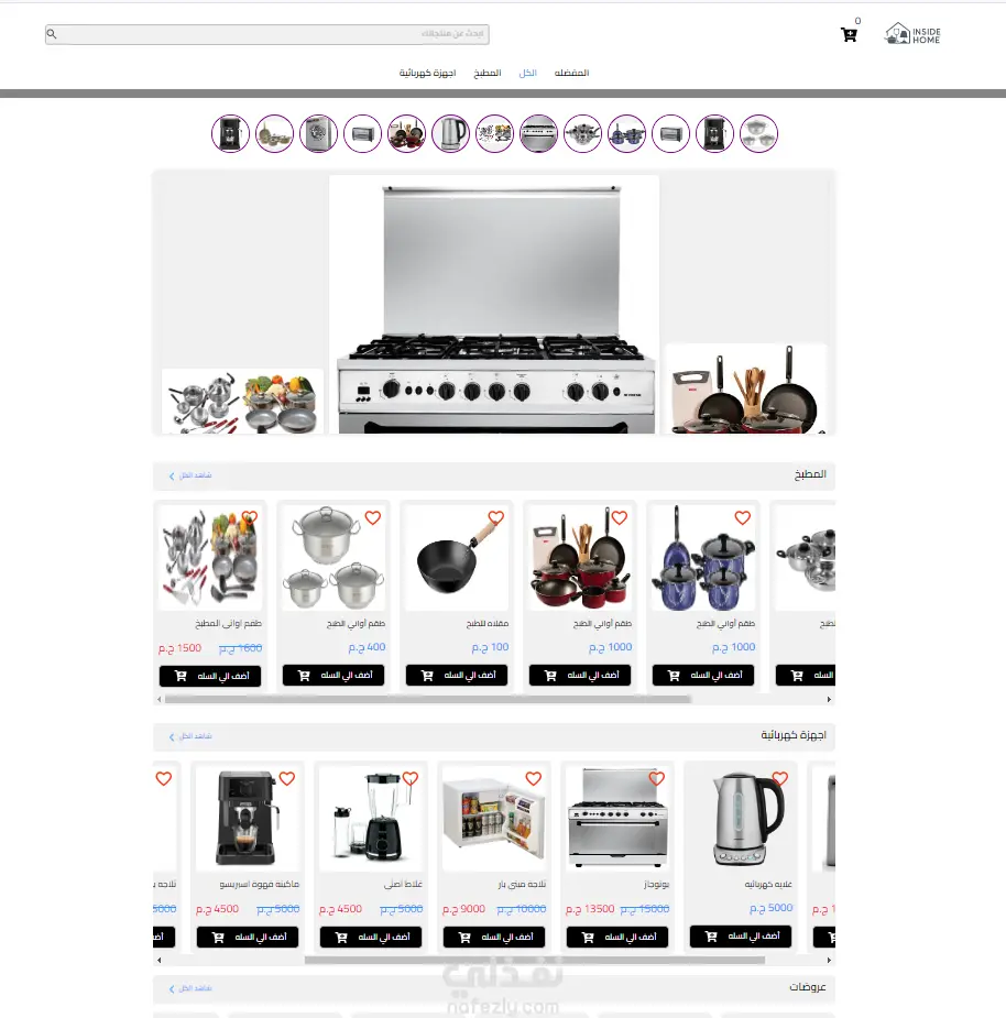 قمت بتصميم وتطوير واجهة متجر إلكتروني باسم Inside Home متخصص في بيع منتجات وأدوات المنزل.