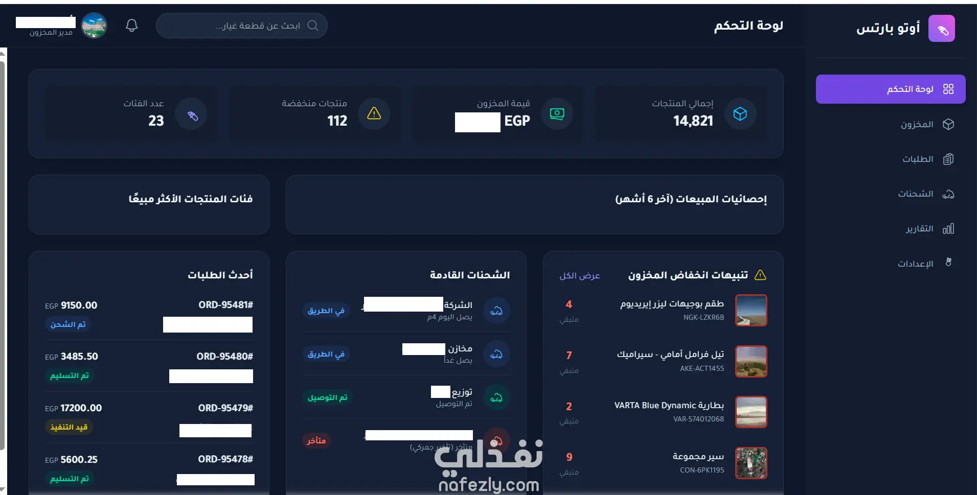 يتيح رؤية عدد القطع المتوفرة، القطع منخفضة المخزون، الطلبات الجديدة، وأعلى المنتجات مبيعًا في مكان واحد.