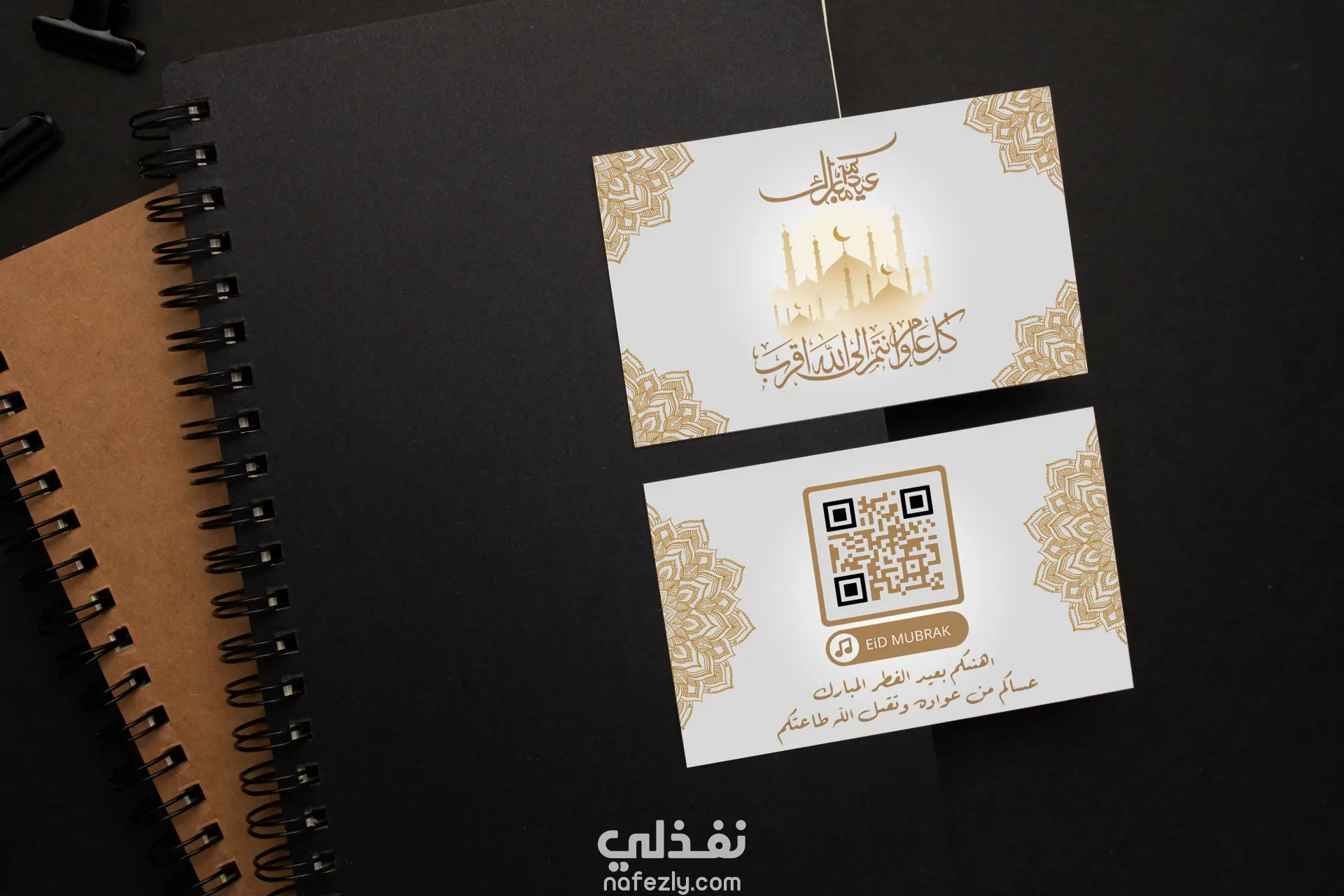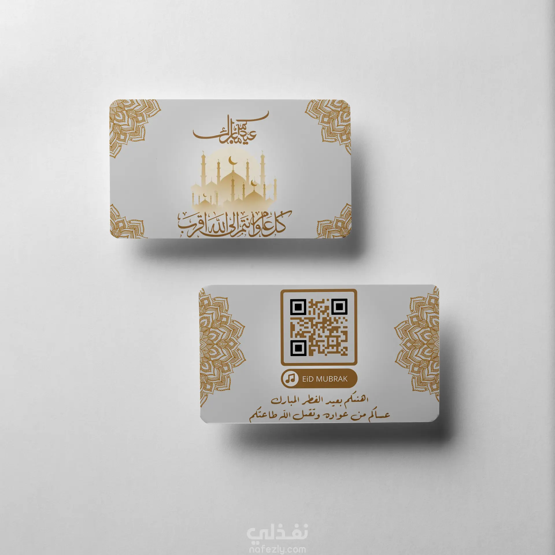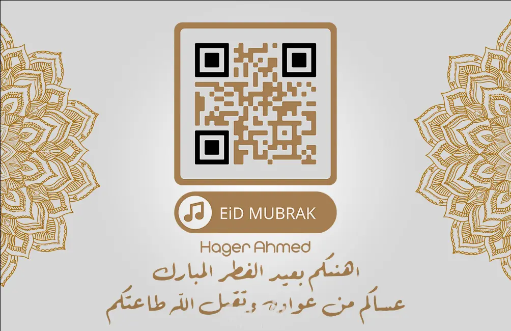 تصميم كارت عيد أنيق على شكل Business Card يجمع بين الطابع الرسمي واللمسة الاحتفالية. الكارت بحجم بطاقة العمل القياسية، يحتوي على ألوان مبهجة مستوحاة من أجواء العيد (مثل الذهبي، الأبيض، والباستيل أو الألوان الزاهية)