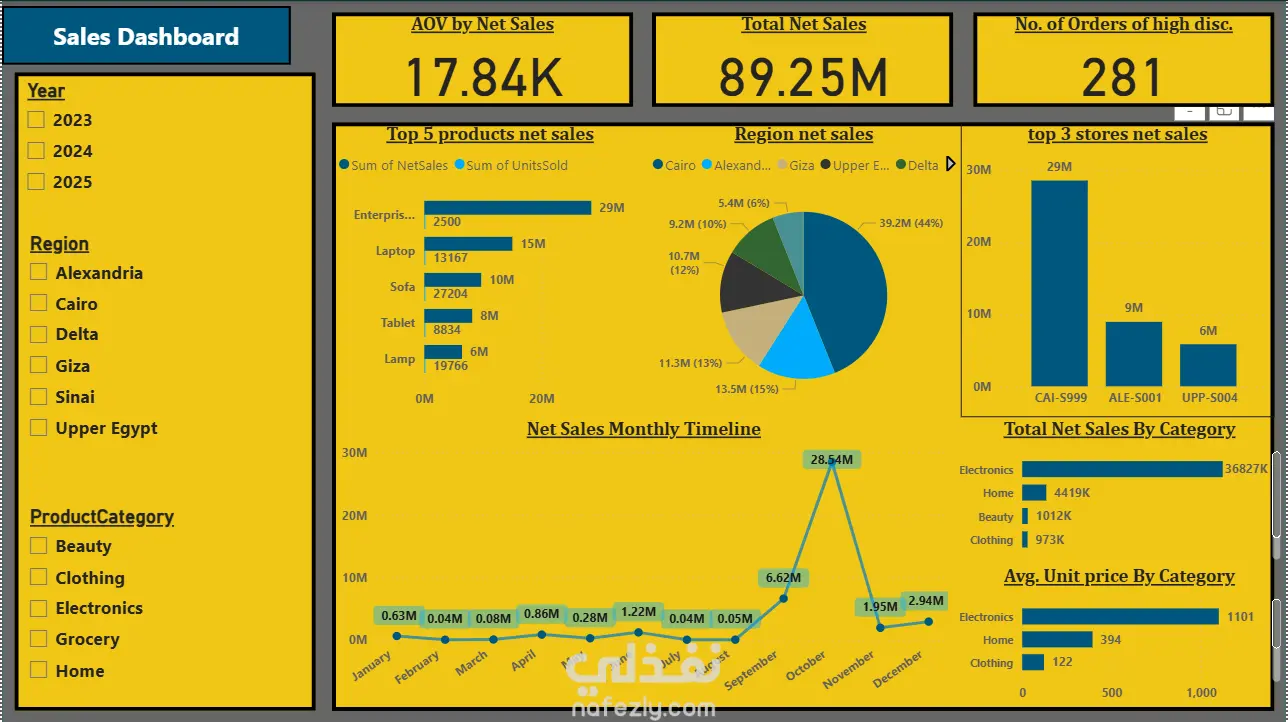 قمت بتصميم وتطوير لوحة معلومات تحليلية شاملة للمبيعات (Sales Dashboard) باستخدام Microsoft Power BI، توفر رؤى استراتيجية عميقة لأداء الأعمال بطريقة احترافية وتفاعلية. ✨ المميزات الرئيسية للداشبورد: 📊 المؤشرات الرئيسية (KPIs): متوسط قيمة الطلب (AOV) بقيمة 17.84K إجمالي صافي المبيعات 89.25M عدد الطلبات ذات الخصم المرتفع: 281 طلب 🎯 التحليلات المتقدمة: تحليل أداء أفضل 5 منتجات بناءً على صافي المبيعات وعدد الوحدات المباعة توزيع المبيعات الجغرافي عبر 6 مناطق رئيسية (القاهرة، الإسكندرية، الجيزة، أسوان العليا، الدلتا، سيناء) تحليل أداء أفضل 3 متاجر (CAI-S999, ALE-S001, UPP-S004) تصنيف المبيعات حسب الفئات (إلكترونيات، منازل، جمال، ملابس، بقالة) تحليل متوسط سعر الوحدة حسب الفئة 📈 التحليل الزمني: خط زمني تفاعلي يوضح تطور صافي المبيعات الشهرية على مدار العام تحديد القمم والقيعان الموسمية (أعلى قمة في أكتوبر: 28.54M) 🎨 مرشحات تفاعلية (Slicers): تصفية حسب السنة (2023، 2024، 2025) تصفية حسب المنطقة الجغرافية تصفية حسب فئة المنتج 🎯 التقنيات المستخدمة: Microsoft Power BI Desktop تصميم واجهة مستخدم احترافية (UI/UX) معالجة وتحليل البيانات باستخدام DAX تصورات بيانية متنوعة (Bar Charts, Pie Charts, Line Charts) نظام ألوان متناسق ومميز (أصفر وأزرق داكن) ✅ القيمة المضافة: سهولة قراءة البيانات واتخاذ القرارات الاستراتيجية تصميم responsive يناسب مختلف الشاشات إمكانية التفاعل مع البيانات وتطبيق المرشحات المتعددة تقديم رؤى تجارية قابلة للتطبيق الفوري 🎓 مناسب لـ: الشركات التجارية والتجزئة إدارات المبيعات والتسويق المديرين التنفيذيين وصناع القرار محللي البيانات ومسؤولي الأداء لوحة معلومات احترافية تحول البيانات الخام إلى رؤى استراتيجية قابلة للتنفيذ!