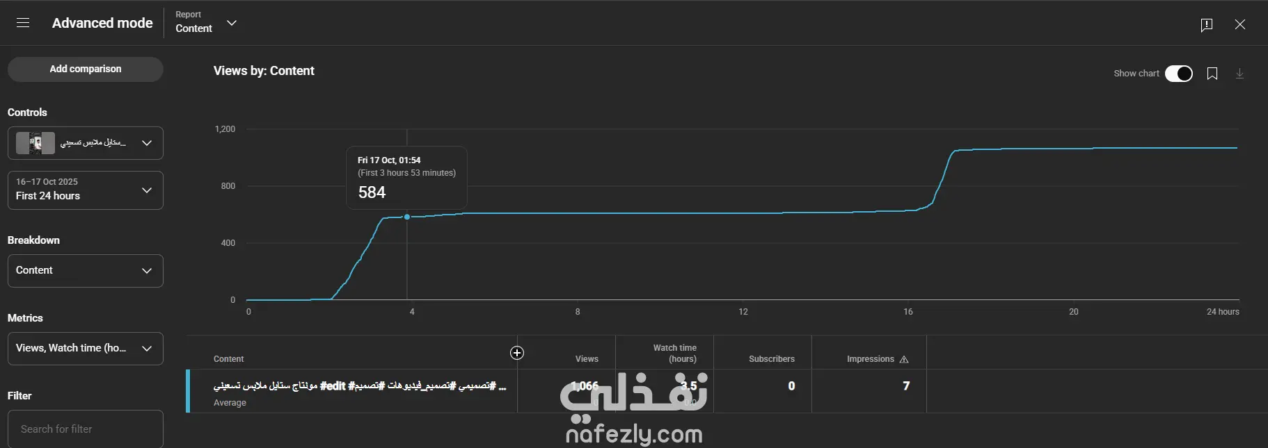 النتيجة دليل على الكفاءة والانتشار الفوري: هذا العمل تحديداً حقق 1,066 مشاهدة في أقل من 24 ساعة، والأهم أنه سجل 584 مشاهدة خلال أول 4 ساعات تقريباً من نشره في قناة في صفر مشتركين. هذا الصعود السريع والمفاجئ في المنحنى يؤكد على أن المونتاج المصمم بعناية يضمن جذباً قوياً وفورياً لاهتمام الخوارزميات، مما يدفع المحتوى للانتشار بأقصى سرعة ممكنة .