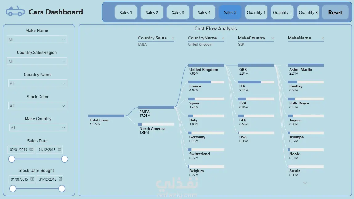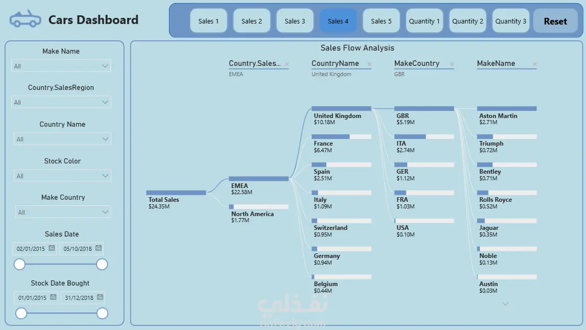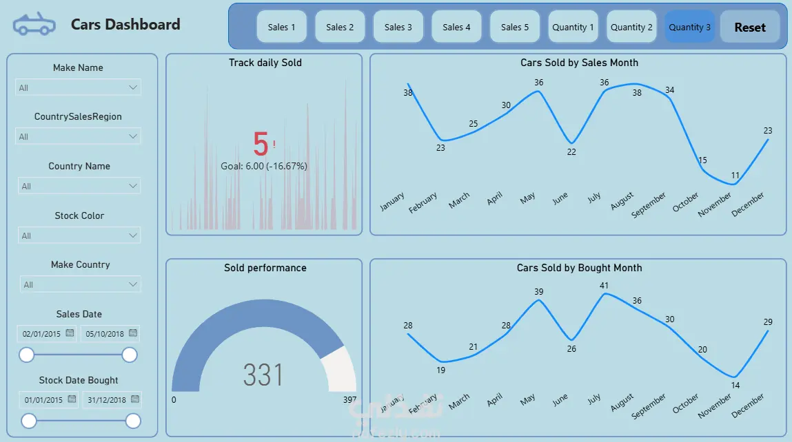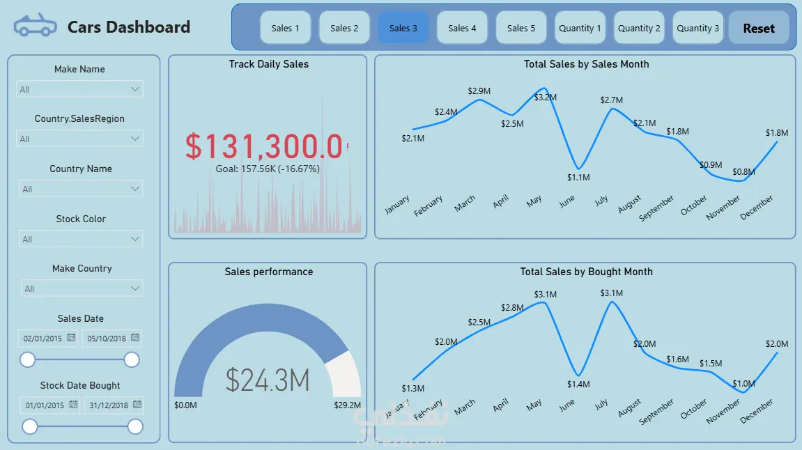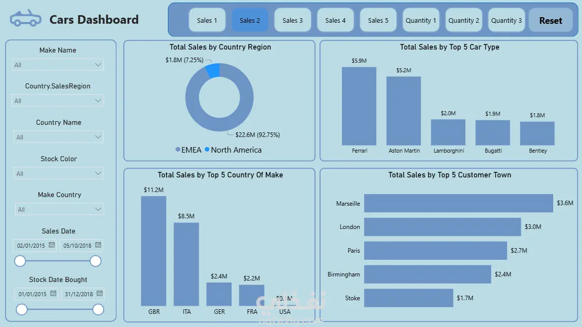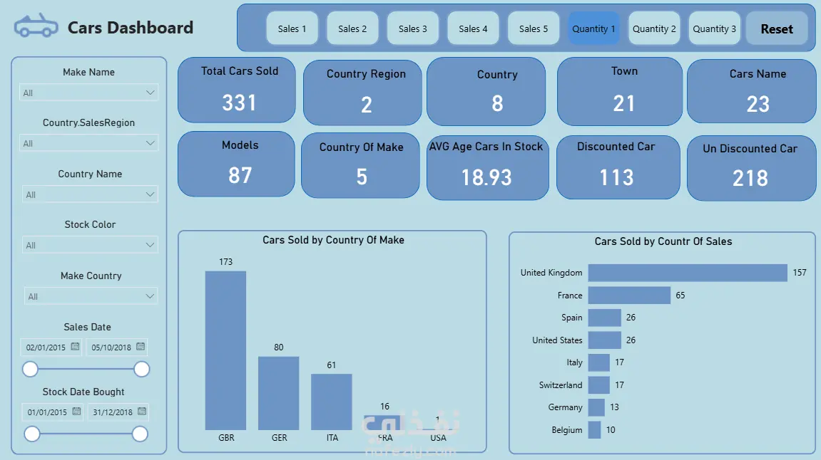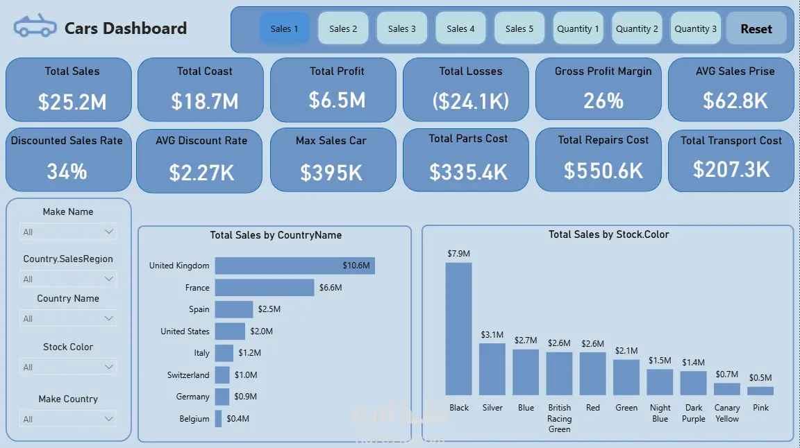 يحتوي الجانب الأيسر على مجموعة فلاتر ديناميكية تسمح بتخصيص وتحليل البيانات حسب اسم السيارة، المنطقة، الدولة، اللون، بلد الصنع، تاريخ البيع، وتاريخ شراء المخزون، ممّا يدعم عمليات التحليل التفصيلي لمختلف المتغيرات.