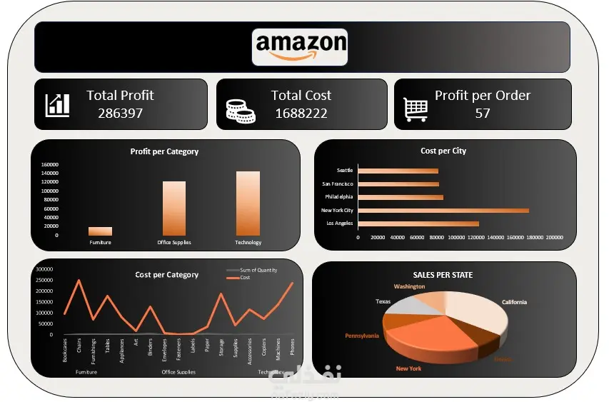 مشروع يهدف إلى تحليل بيانات المبيعات الخاصة بشركة Amazon من خلال تصميم Dashboard تفاعلي في Excel يعرض مؤشرات الأداء الرئيسية بطريقة واضحة وسهلة القراءة، مما يساعد في تتبع الأرباح والتكاليف عبر الفئات والمدن والولايات.