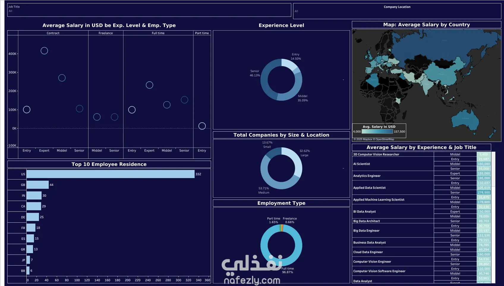 عملت Dashboard تفاعلية بتحلل رواتب العاملين في مجال الـ Data و الـ AI حول العالم. استخدمت فيها Tableau لتحليل العلاقة بين الخبرة، نوع التوظيف، والمسمى الوظيفي، وكمان عرضت توزيع الرواتب على خريطة الدول. الداتا أظهرت إن أغلب الموظفين Full-time، وإن مستوى Senior هو الأعلى من حيث العدد والدخل، والـ US متصدرة من حيث عدد العاملين.