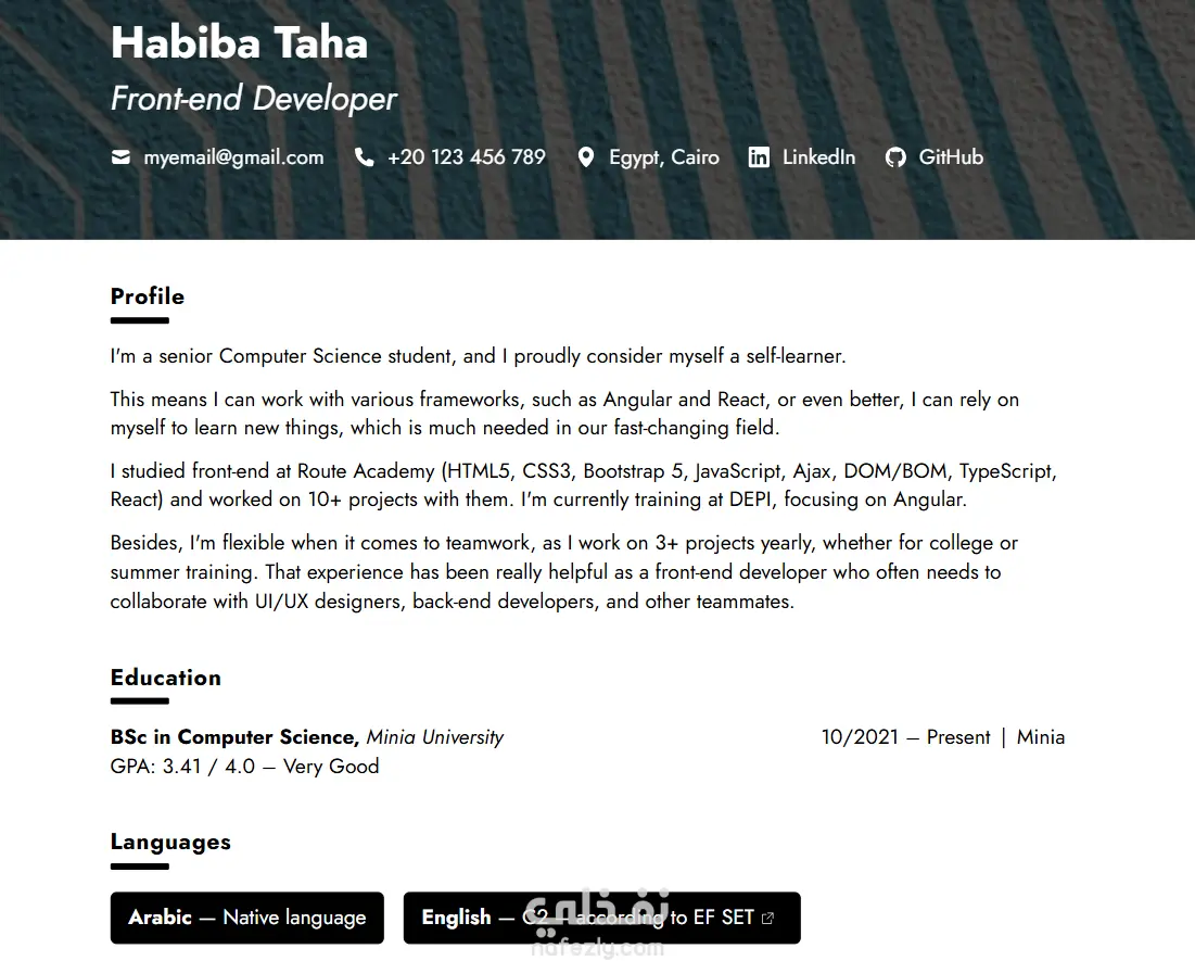 -ملف سيرة ذاتية جاهز للطباعة والإرسال ستحصل على السيرة الذاتية بصيغة PDF مرتبة وجاهزة للتقديم فورًا. -نسخة قابلة للتعديل تسلمك نسخة بصيغة Word لتحديث معلوماتك مستقبلاً بسهولة. -تصميم احترافي وبسيط ملف منسق بتصميم أنيق يعكس احترافيتك ويجذب أصحاب العمل. -عدد السير الذاتية واللغات تشمل الخدمة الأساسية سيرة ذاتية واحدة مكوّنة من صفحة واحدة بلغة واحدة (العربية أو الإنجليزية).