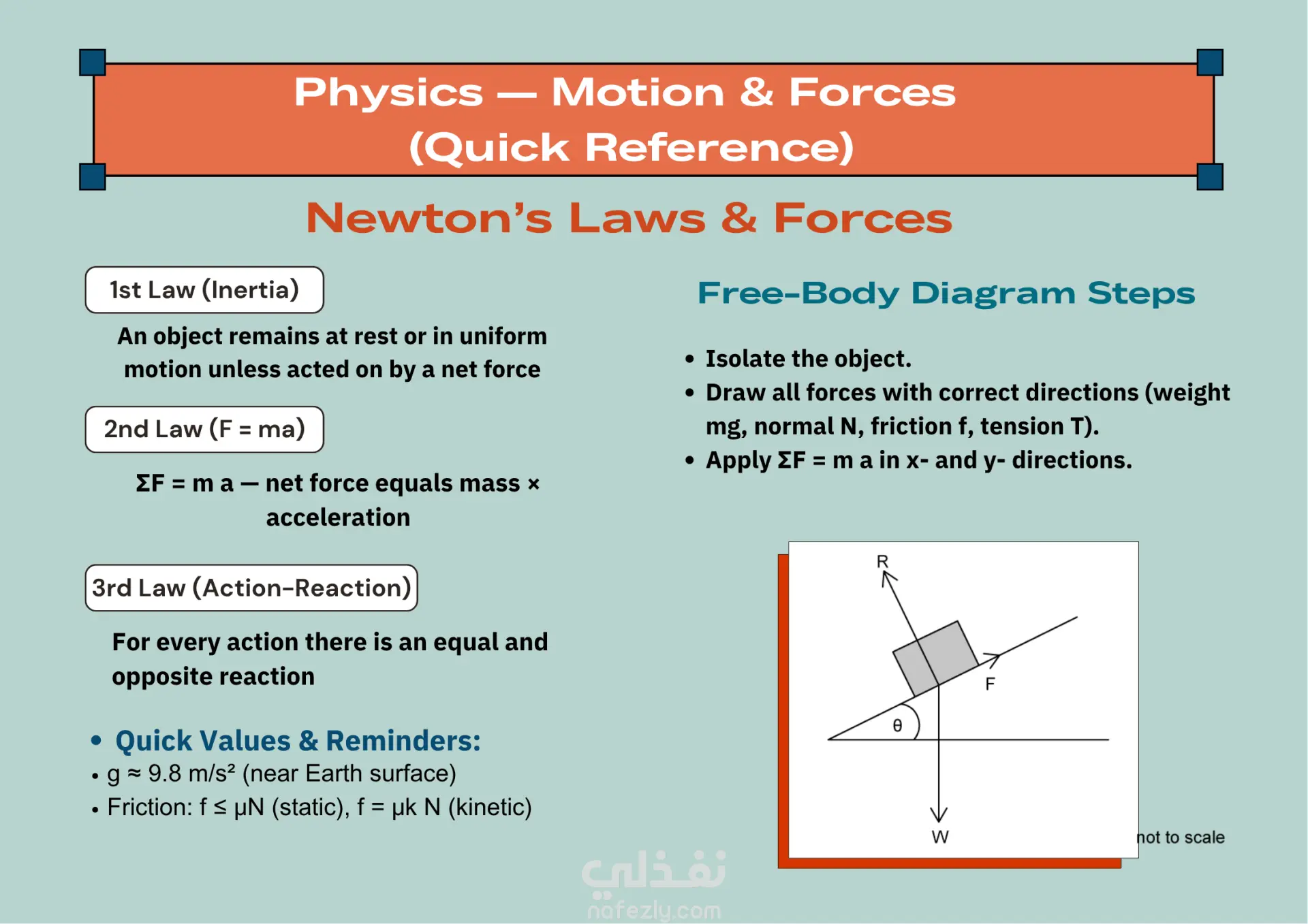 🔹 Slide 2 – Newton’s Laws: clear summaries of the three laws with free-body diagram steps and practical examples.