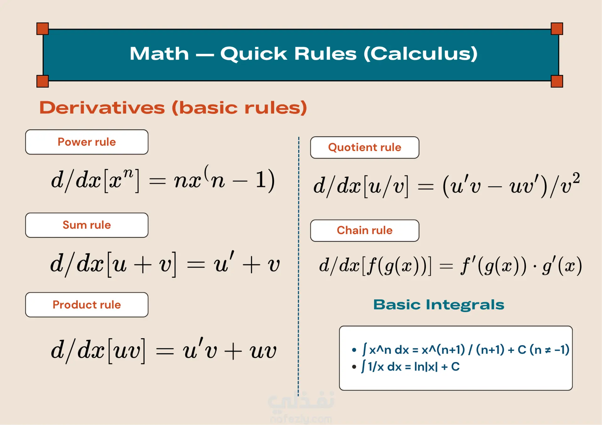 🔹 Slide 3 – Calculus (Math): derivative and integral rules presented in a simplified, easy-to-follow layout.