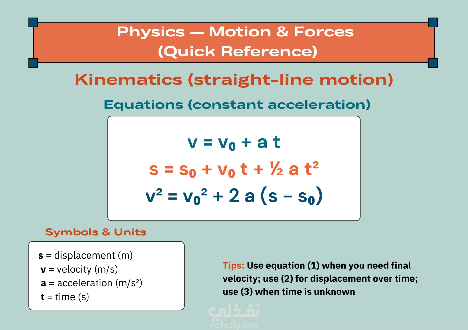 🔹 Slide 1 – Kinematics: key equations of motion, variable meanings, and quick application tips.