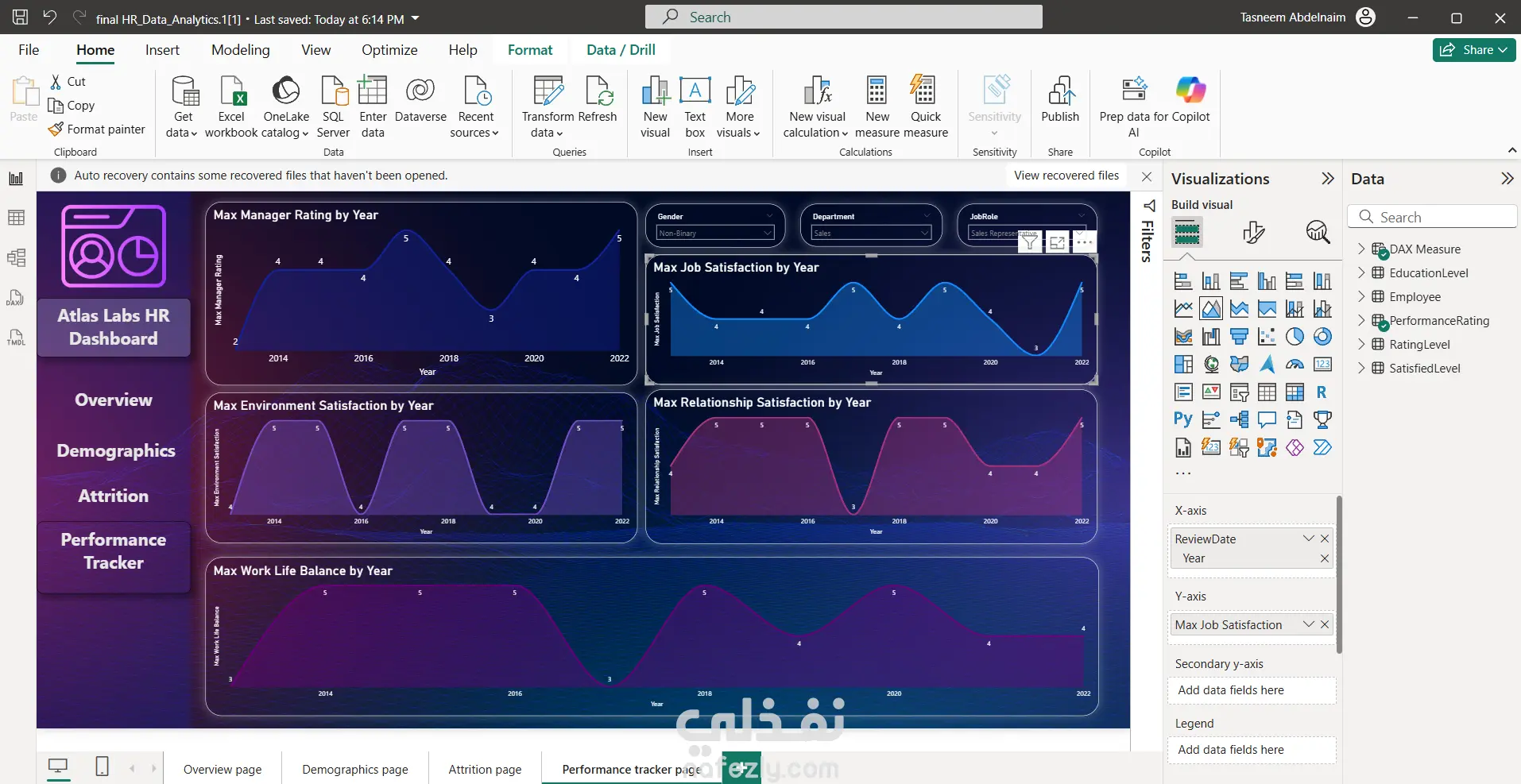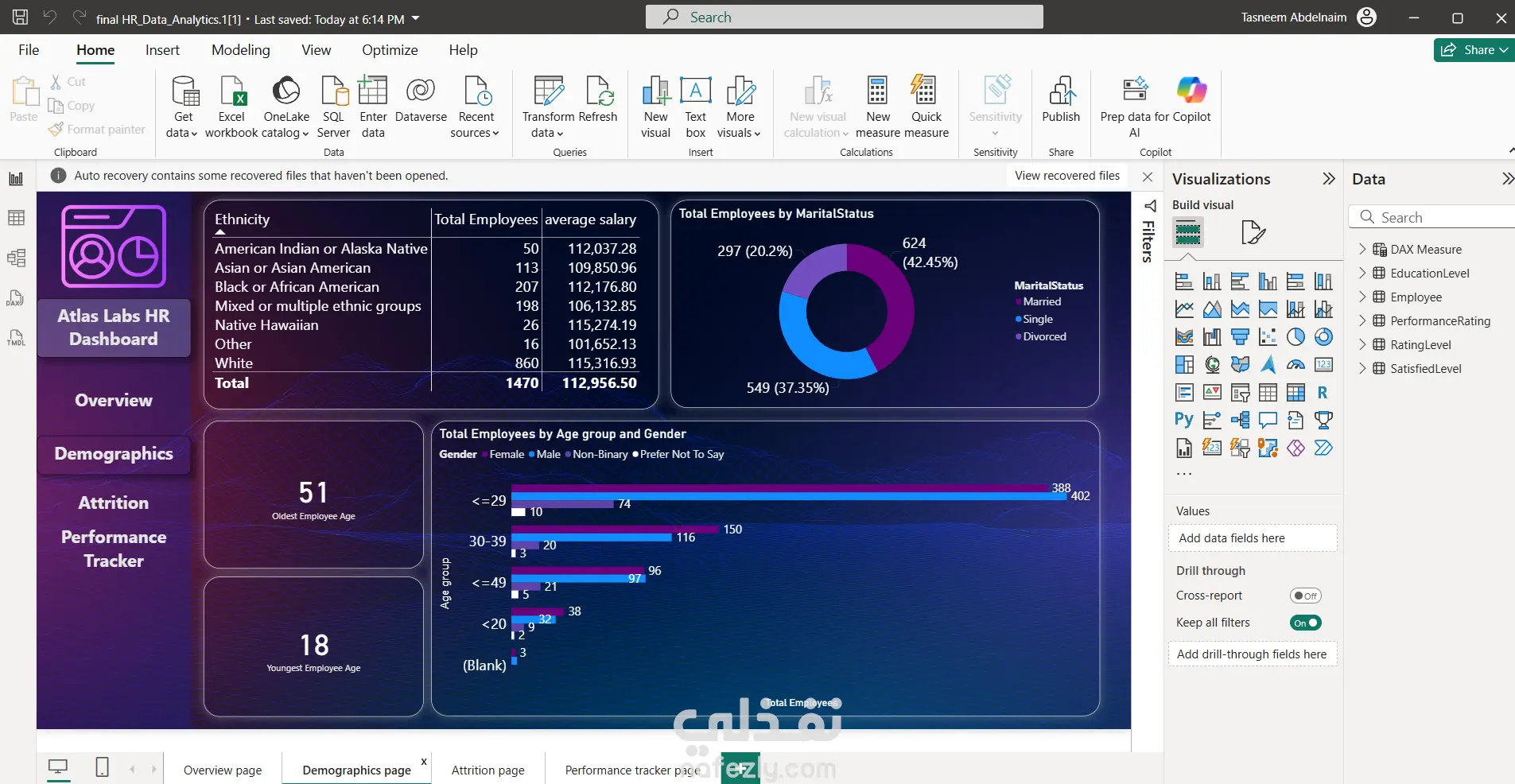 اللوحة تقدم تحليلات شاملة لبيانات الموظفين من خلال عدة محاور رئيسية: نظرة عامة (Overview): عدد الموظفين الإجمالي، النشطين، ومعدل ترك الخدمة (Attrition). تحليل معدل ترك الخدمة (Attrition): تحليل المعدل حسب القسم، السنة، مدة الخدمة، وكثافة السفر. البيانات الديموغرافية (Demographics): توزيع الموظفين حسب العمر، الجنس، الحالة الاجتماعية، والعرق. تتبع الأداء (Performance Tracker): تتبع مؤشرات الرضا الوظيفي، رضا العلاقات، تقييم المديرين، وتوازن الحياة العملية على مر السنين.