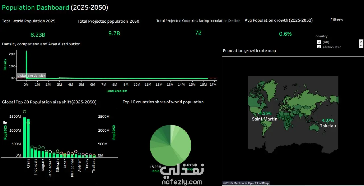 تعرض هذه اللوحة في برنامج Tableau نظرة شاملة عن الاتجاهات السكانية في العالم خلال الفترة من عام 2025 إلى عام 2050. المؤشرات الأساسية: إجمالي عدد سكان العالم عام 2025: 8.23 مليار نسمة العدد المتوقع لسكان العالم عام 2050: 9.7 مليار نسمة عدد الدول المتوقع أن تواجه انخفاضًا سكانيًا: 72 دولة متوسط معدل النمو السكاني العالمي (2025–2050): 0.6% الرسوم البيانية الرئيسية: مقارنة الكثافة وتوزيع المساحة: توضح العلاقة بين كثافة السكان ومساحة الأراضي في مختلف الدول. تغير حجم السكان في أعلى 20 دولة (2025–2050): يبرز التغير في عدد السكان بين الدول الأكثر سكانًا في العالم خلال الفترة الزمنية المحددة. نسبة أكبر 10 دول من إجمالي سكان العالم: مخطط دائري يوضح حصة كل دولة من سكان العالم، ومن بينها الهند (18.29%) وإثيوبيا (1.69%). خريطة معدل النمو السكاني: خريطة توضح معدلات النمو السكاني حول العالم، وتُظهر أمثلة مثل سانت مارتن (4.55%) وتوكيلو (4.07%). الهدف: تهدف هذه اللوحة إلى تحليل التغيرات الديموغرافية العالمية، وتحديد الدول التي تشهد نموًا سريعًا أو انخفاضًا في عدد السكان، وذلك لدعم القرارات والسياسات المستقبلية المبنية على البيانات.