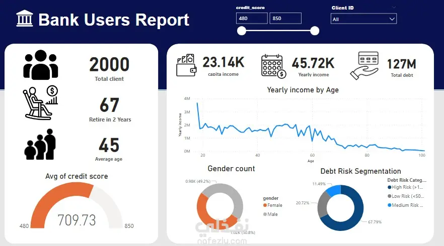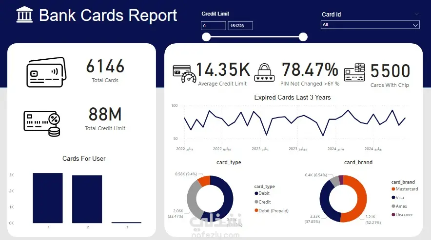 اشتغلنا على تحليل بيانات بنكية وصممنا 3 داشبورد رئيسية بتغطي: المعاملات – العملاء – البطاقات. Bank Transactions Report 13.31M معاملة بإجمالي M571.84 متوسط العملية: 42.98 74.83K تاجر نسبة أخطاء منخفضة 1.59% تحليل زمني وخريطة للمدن Bank Users Report 2000 عميل متوسط عمر 45 سنة متوسط درجة ائتمان 709.73 دخل سنوي إجمالي 45.72K 127M إجمالي الديون تحليل المخاطر حسب الشرائح (منخفض – متوسط – مرتفع) Bank Cards Report 6146 بطاقة إجمالي حد ائتماني 88M 78.47% من البطاقات لم تغير PIN منذ أكثر من 6 سنوات توزيع حسب النوع والعلامة التجارية (Visa – Mastercard – Amex – Discover) كده المشروع غطى المعاملات – العملاء – البطاقات بداشبورد تفاعلية بتوضح الـKPIs والـInsights بشكل متكامل.