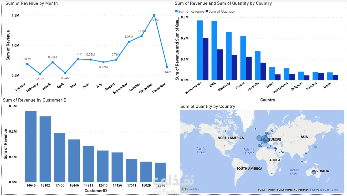تم تنفيذ المشروع باستخدام Power BI مع توظيف تقنيات تحليل البيانات المتقدمة لتجهيز وتنظيف وربط البيانات من مصادر متعددة، ومن ثم إنشاء نموذج بيانات ديناميكي يتيح التحليل الفوري عبر فلاتر متعددة (المنطقة، المنتج، البائع، الفترة الزمنية).