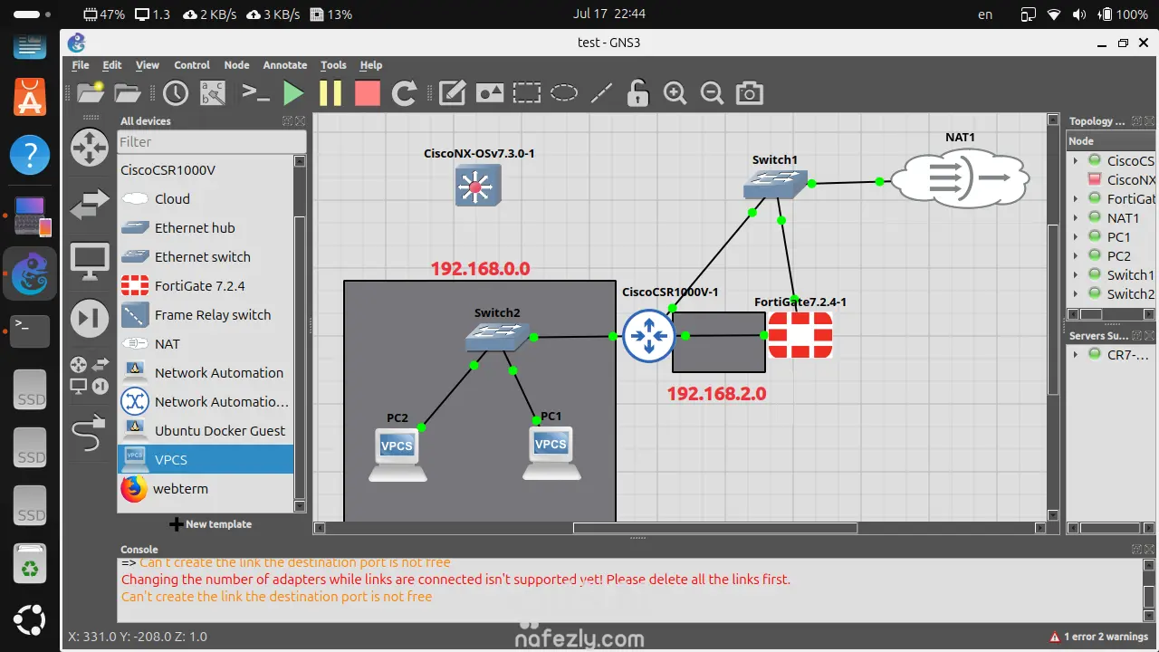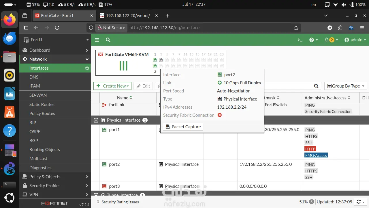 🔐 Network Configuration Overview In this project, we designed and configured a secure network infrastructure using Cisco routers, switches, and a FortiGate firewall to ensure efficient routing, segmentation, and protection of data traffic. 🧱 Firewall Configuration (FortiGate) The FortiGate firewall was configured to: Define security zones separating internal (LAN) and external (WAN) networks. Create and enforce access control policies to permit only authorized traffic between the 192.168.2.0 internal network and the internet. Implement Network Address Translation (NAT) to hide internal IP addresses. Enable intrusion prevention and web filtering for enhanced network protection. 🌐 Router Configuration (Cisco CSR1000V) The Cisco router acted as the central routing device, connecting the internal LAN, firewall, and external network. Configuration steps included: Setting up IP addressing and routing protocols (static or dynamic) for inter-network communication. Configuring default routes to forward unknown traffic toward the FortiGate firewall. Implementing basic security measures such as SSH for remote management and disabling unused interfaces. 🔁 Switch Configuration Cisco switches were used to segment and interconnect internal hosts: VLANs were configured to separate network segments (e.g., management, users, servers). Port security was enabled to limit access to trusted devices. Switch interfaces were properly assigned to VLANs and connected to the router and firewall using trunk links.