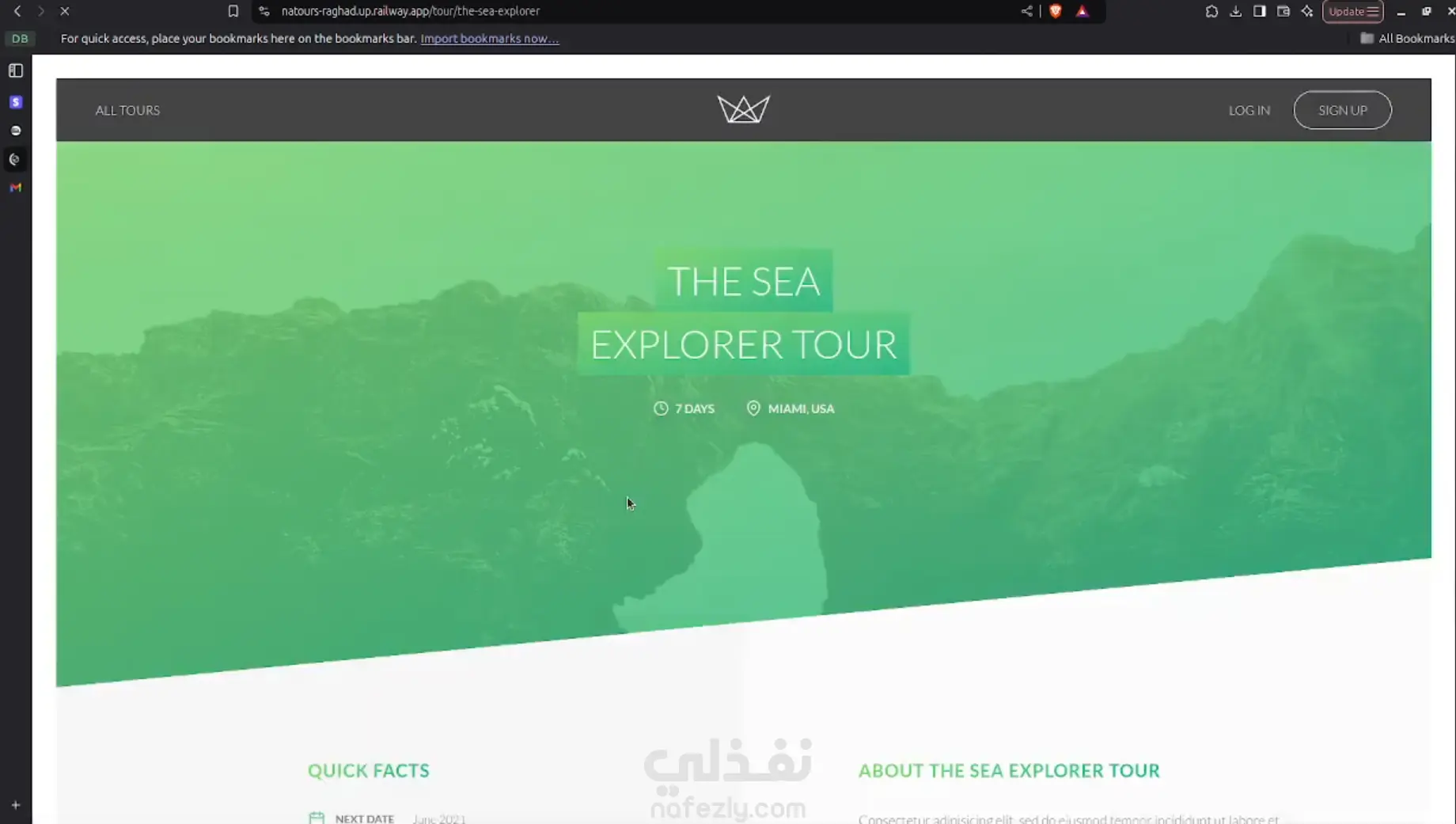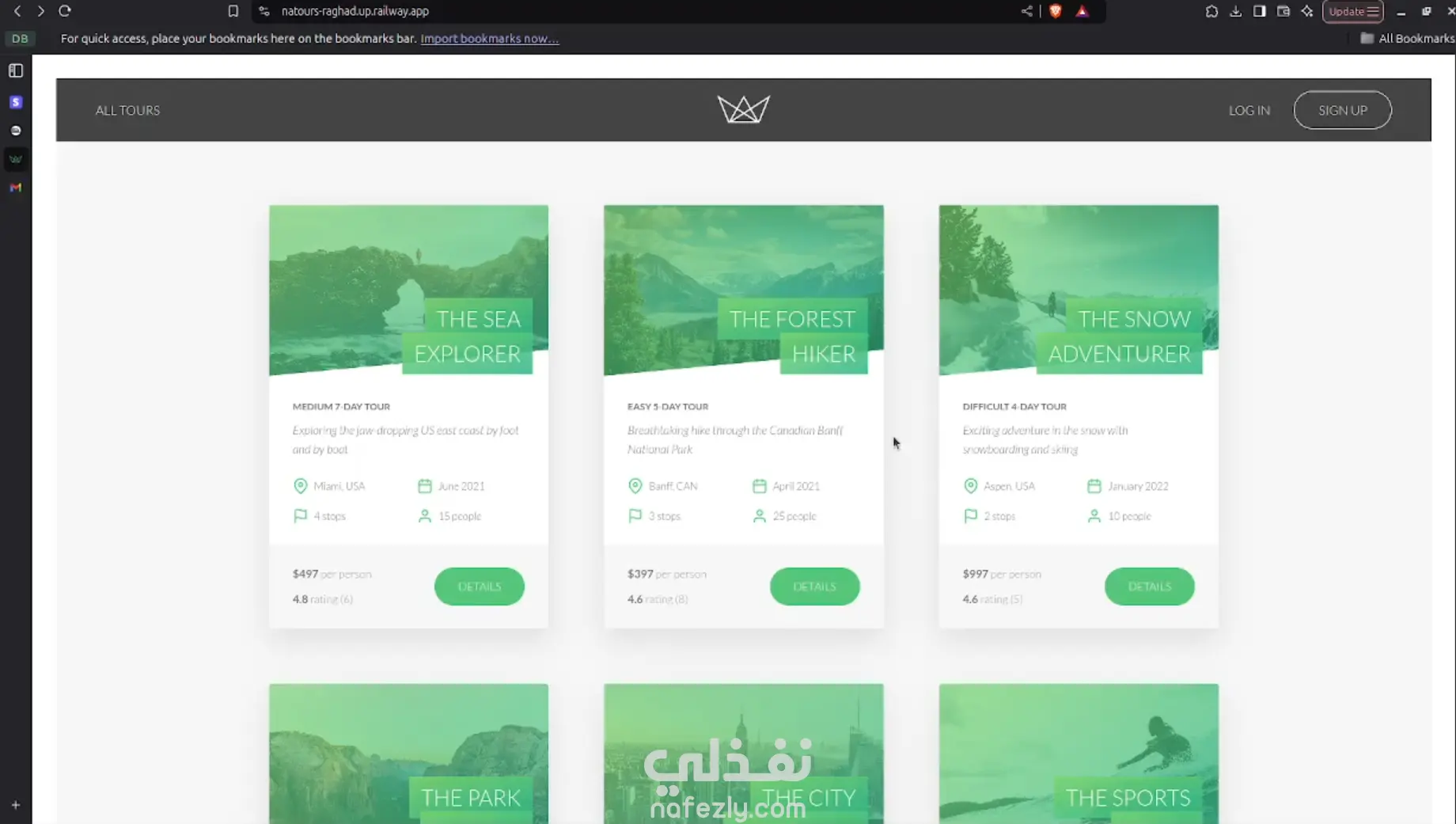 Natours هو تطبيق ويب كامل يتيح للمستخدمين تصفح وحجز الرحلات السياحية بسهولة وأمان. يجمع بين واجهة أمامية تفاعلية ونظام خلفي قوي يدير الرحلات والمستخدمين والحجوزات والمدفوعات الإلكترونية.
