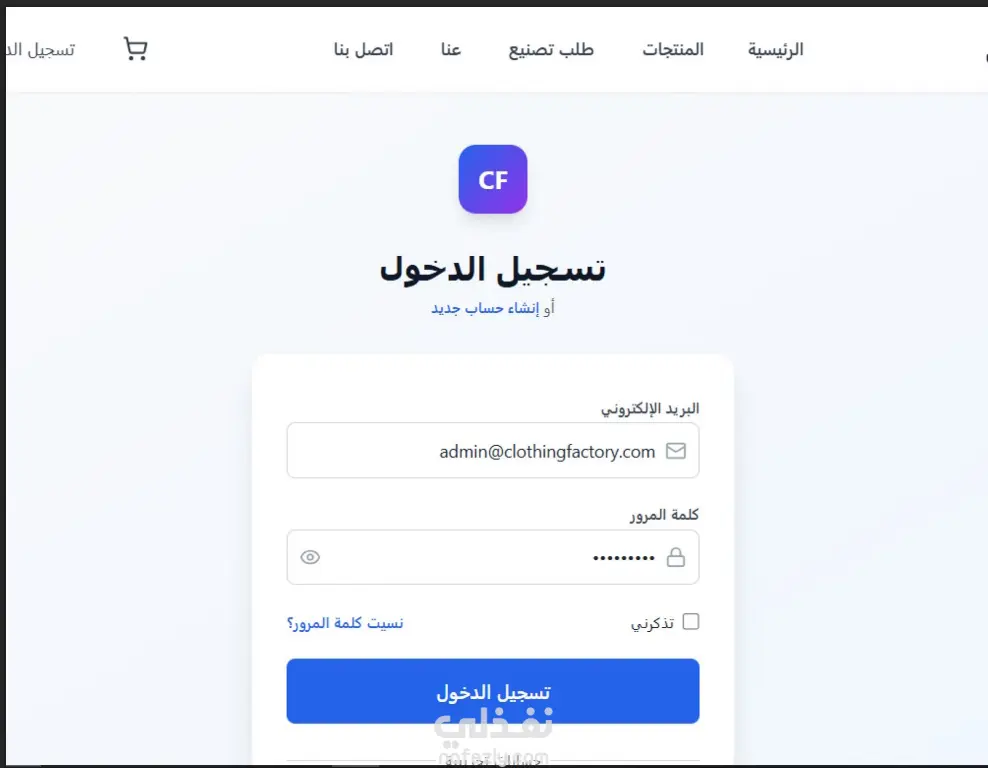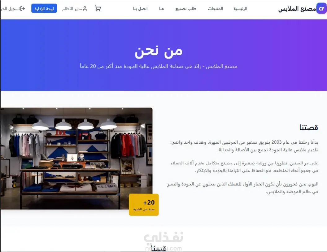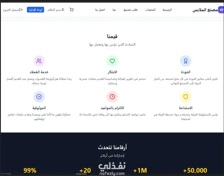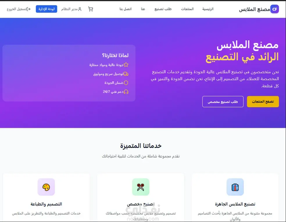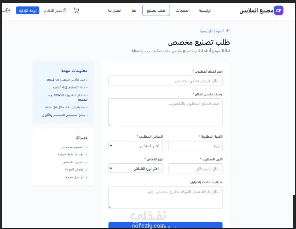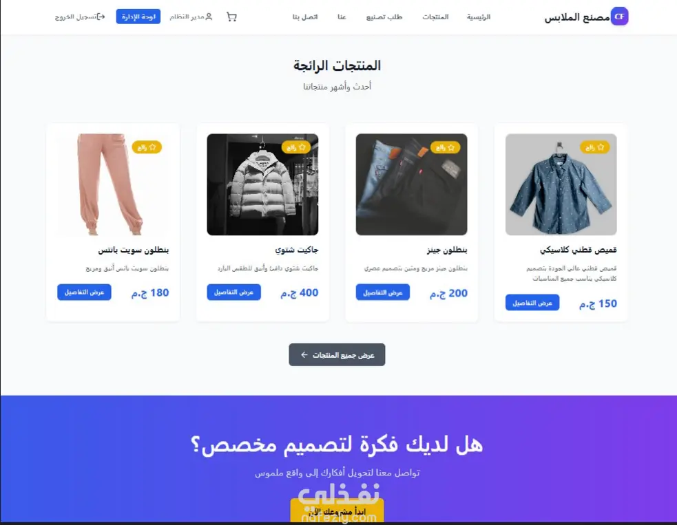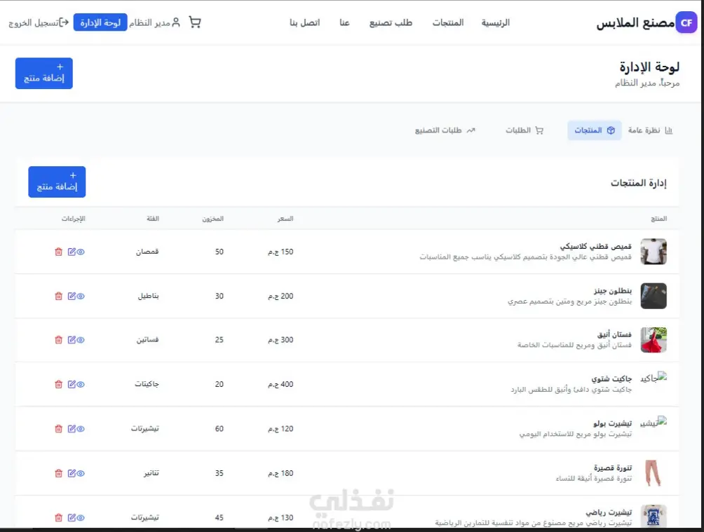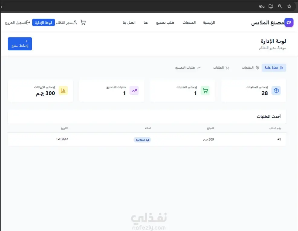 مشروع مصنع الملابس - نظام متكامل لإدارة مصنع ملابس يجمع بين المتجر الإلكتروني وخدمات التصنيع المخصص. يتميز بواجهة متجاوبة تدعم اللغة العربية، إدارة ذكية للطلبات، ولوحة تحكم شاملة. تم تطويره باستخدام React، TypeScript، وTailwind CSS مع JSON Server للـ Backend. جاهز للتوسع مع ميزات مستقبلية مثل نظام الدفع والإشعارات الفورية.