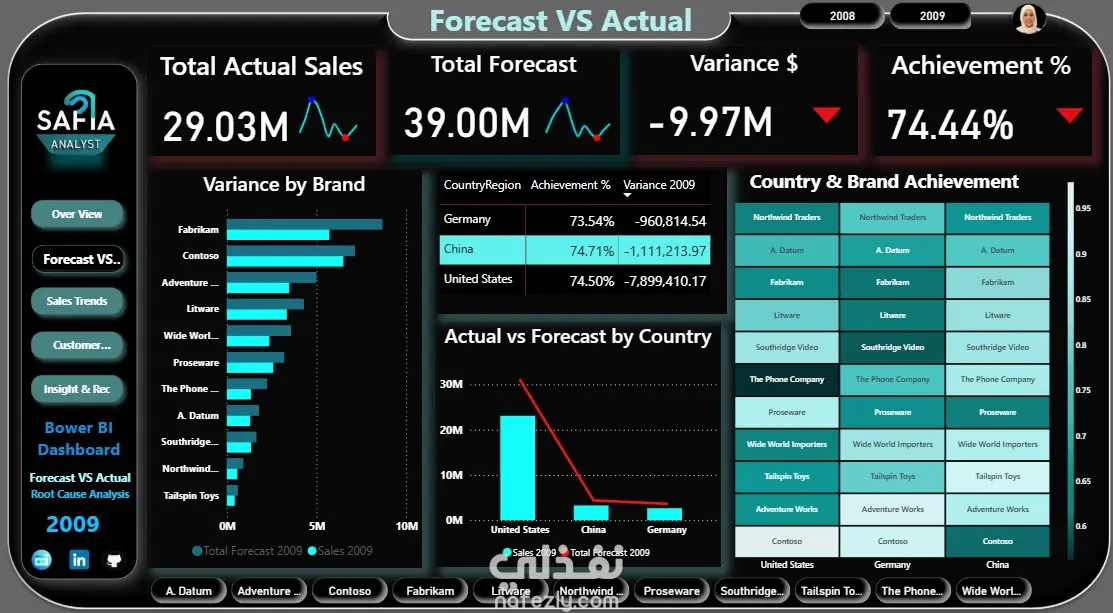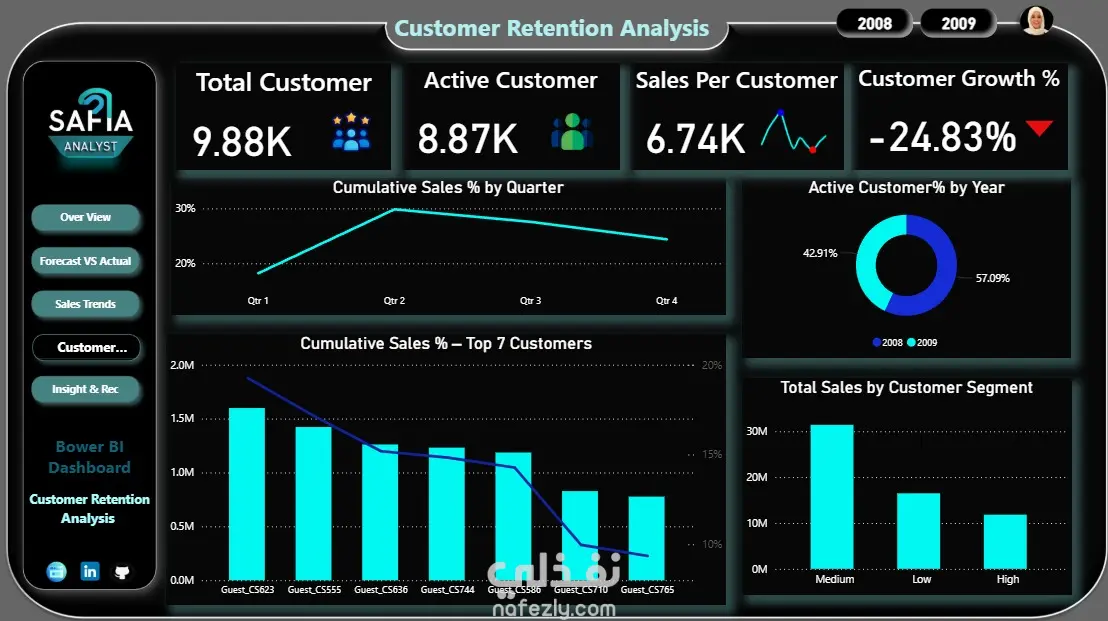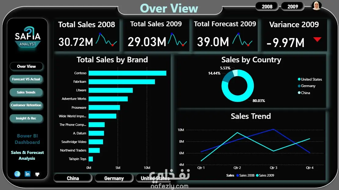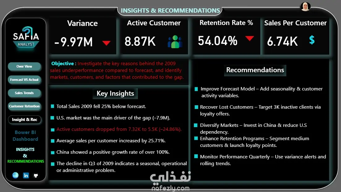 I believe every number hides a story waiting to be uncovered. Every chart, every fluctuation, every spike or drop — it all means something deeper. This week, I built an interactive Power BI dashboard to analyze sales and customer retention between 2008 and 2009 for a major sales company. At first glance, the data seemed simple — sales dropped, forecasts missed. But when I looked closer, the numbers began to speak. 🔹 –29.56M variance. Not just a shortfall — it was a sign that forecasting models were missing key factors like seasonality and customer behavior. 🔹 U.S. sales fell from 9.80M to 7.39M (–24.6%). Behind the drop was overreliance on one market — a single point of failure that shaped the entire year’s performance. 🔹 Active customers declined from 7.32K to 5.5K (–24.8%), but average sales per customer rose by 25.7% — fewer buyers, but stronger ones. A shift in loyalty, not demand. 🔹 China’s sales doubled. A quiet success story — proof that opportunities often grow where the focus is weakest. Even Q3’s dip had its message: seasonal patterns and operational issues left unaddressed. By the end, this dashboard wasn’t just data — it was a roadmap for smarter decisions: Build better forecast models. Reconnect with lost customers. Diversify markets and reduce U.S dependency. Strengthen retention and track performance quarterly. Because in data, every number has a voice — you just need to listen carefully. Explore the interactive dashboard here: https://www.dropbox.com/scl/fi/vtbcv68x3ra6fdoyiipcb/Sales-Customer-Retention-Analysis.pbix?rlkey=bccb0aws3rybwj40ep8qmv5qn&st=495nb21f&dl=0