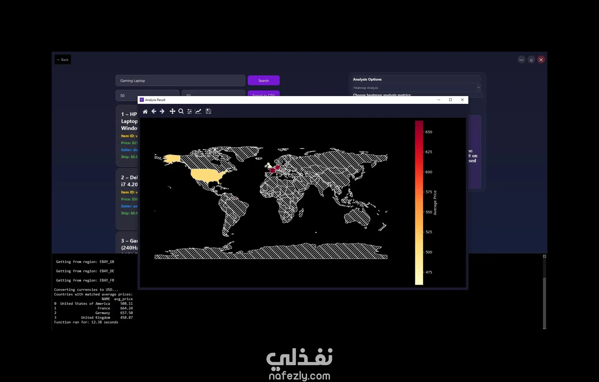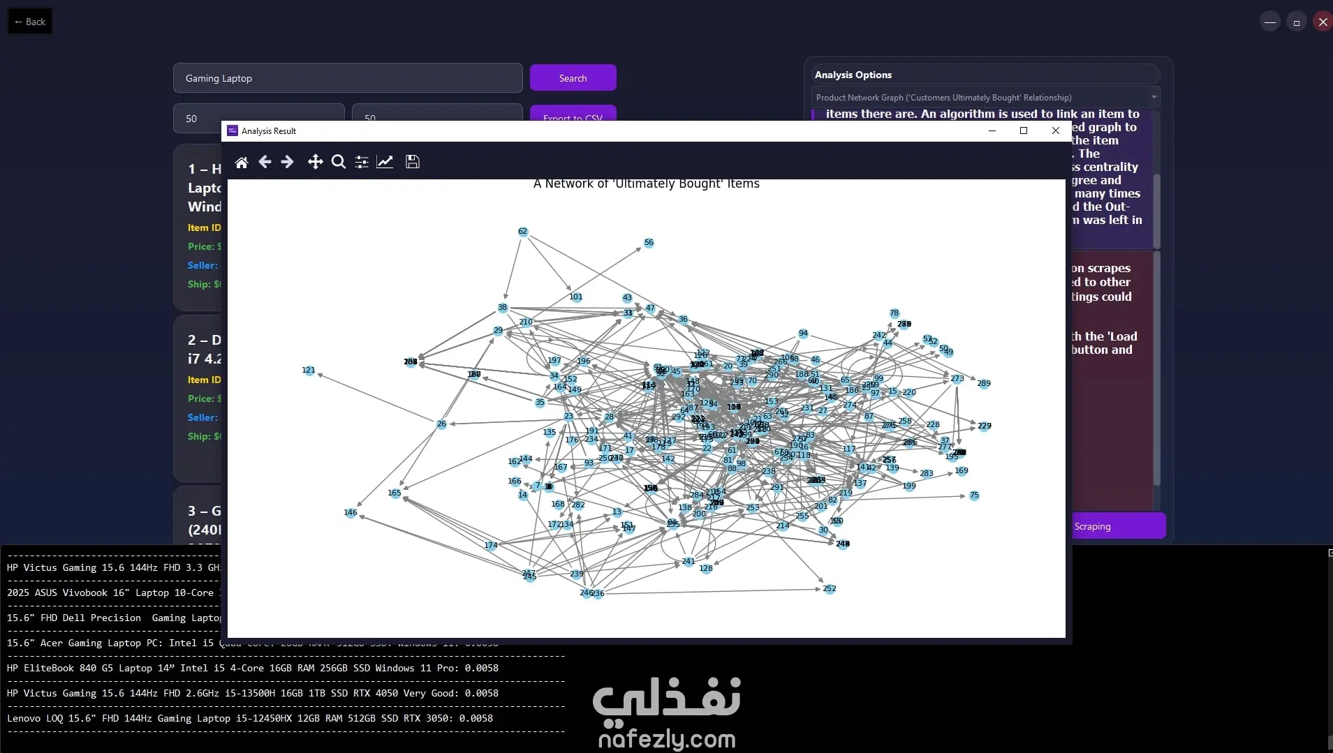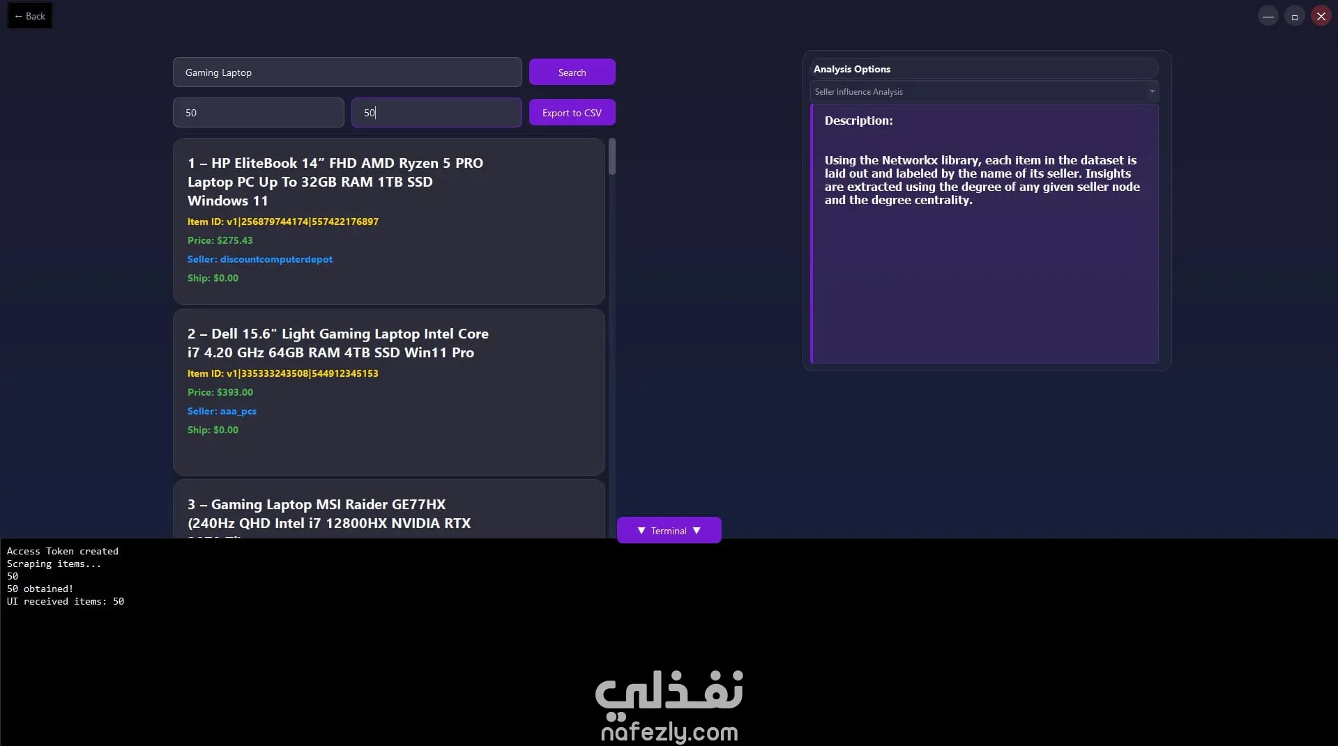 DeepScrape هو تطبيق Python متكامل لجمع وتحليل بيانات المنتجات من موقع eBay باستخدام واجهة الـAPI الرسمية مع تقنيات Web Automation (Selenium). يتيح للمستخدم إدخال استعلام بحث (مثل gaming laptop) وعدد المنتجات المطلوبة، ليقوم النظام بجلب البيانات وتنظيمها وتحليلها بشكل تفاعلي داخل واجهة رسومية (GUI) مبنية بـPyQt6. أهم الخصائص: جمع البيانات تلقائيًا: باستخدام eBay API وSelenium مع معالجة ذكية لتفادي التكرار. تحليل شامل: تحليل شبكة البائعين (Seller Network Graph) وتحديد البائعين الأكثر تأثيرًا. تحليل العلاقات بين المنتجات (Frequently Bought Together / Ultimately Bought Graphs). تحليل المراجعات وتقييم الانطباع العام عبر خوارزمية VADER للـSentiment Analysis. عرض خرائط حرارية ورسوم بيانية متعددة لبيانات الأسعار والمناطق. تحليل متعدد المناطق (Multi-Regional Heatmap): مقارنة الأسعار بين مناطق eBay المختلفة. ? اكتشاف المجتمعات (Community Detection): باستخدام تشابه Jaccard لاكتشاف الفئات المتكررة. واجهة استخدام حديثة: تفاعلية وسلسة بفضل PyQt6 مع نافذة طرفية مدمجة ومؤثرات حركية. التجميع ثلاثي الأبعاد (3D Clustering): تجميع المنتجات المتشابهة بصريًا باستخدام تقنيات تعلم الآلة، مع تمثيلها في مخطط ثلاثي الأبعاد يعرض العلاقة بين السعر، تقييمات العملاء، ونسب التعليقات الإيجابية. تحليل آراء العملاء (اختياري): استخراج ومراجعة التعليقات لتحديد مشاعر العملاء تجاه المنتجات وتقديم تقييم شامل لكل منتج. المخرجات: ملف CSV منظم يحتوي على جميع البيانات المستخرجة. تقارير وتحليلات مرئية توضح الأنماط والعلاقات بين المنتجات والبائعين.